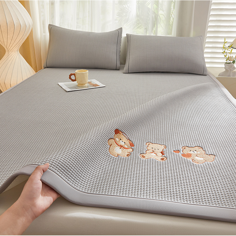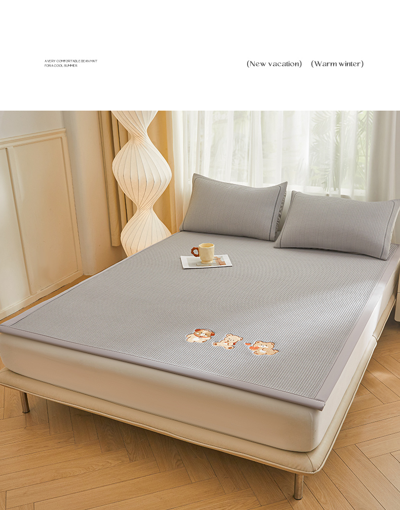 • 91家纺网 家纺一手货源 找家纺 全季家居 2025新款A类乙纶PE家族系列刺绣凉豆豆席凉席席子 快乐小熊-浅灰-床笠款