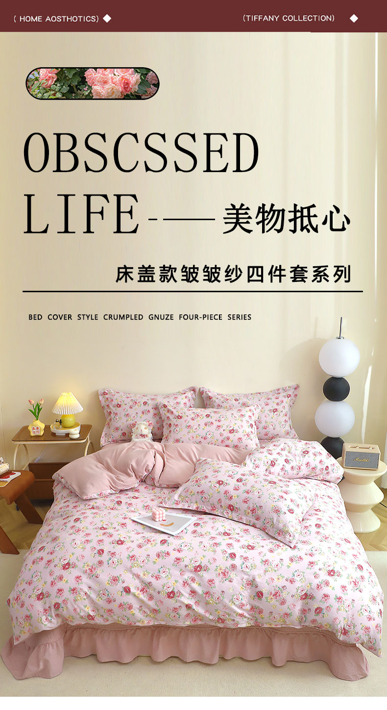 仟网汇 2025新款亲肤皱皱棉四件套皱皱纱四件套 玫瑰花园-红