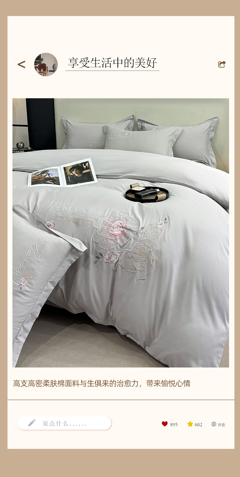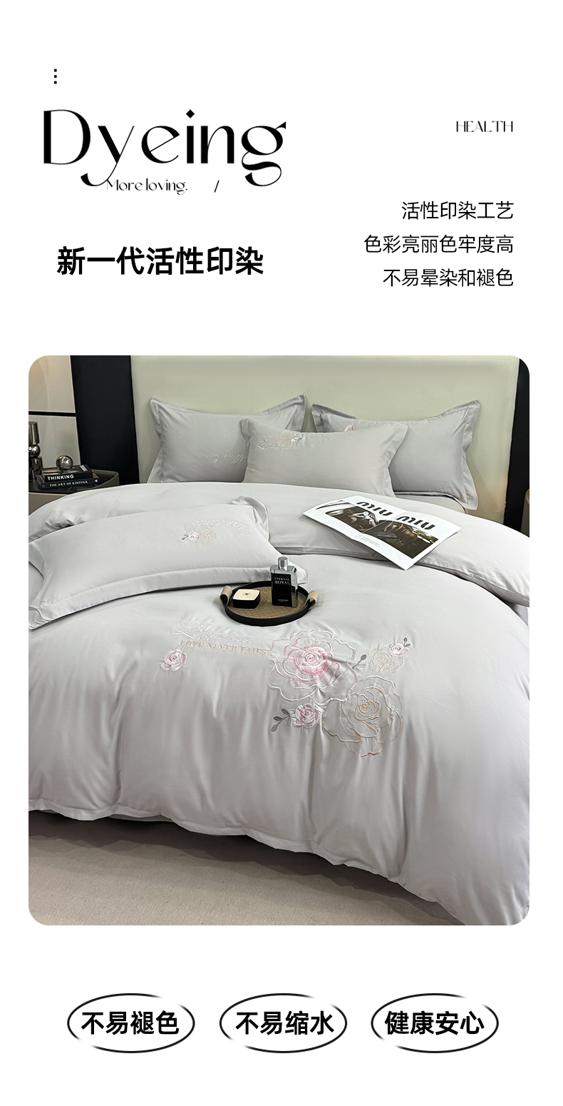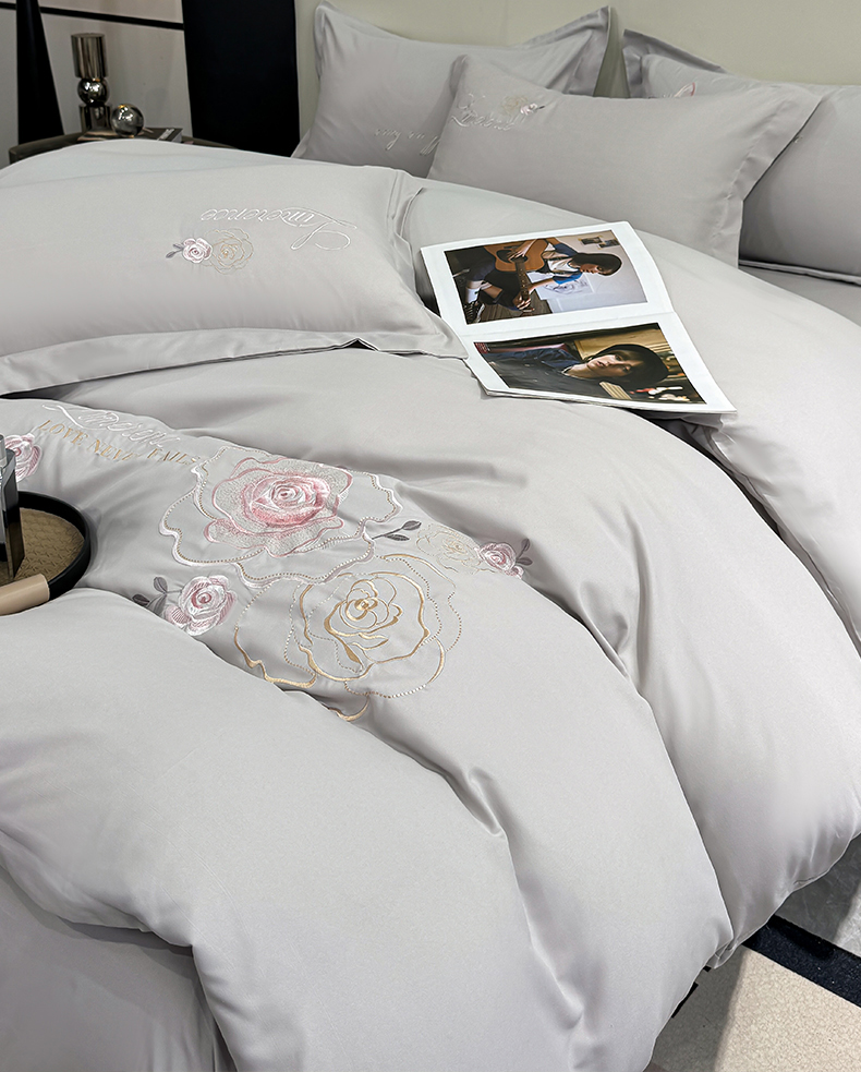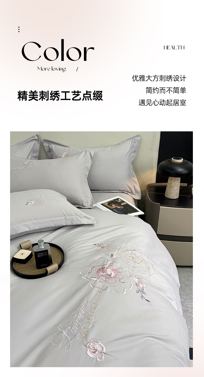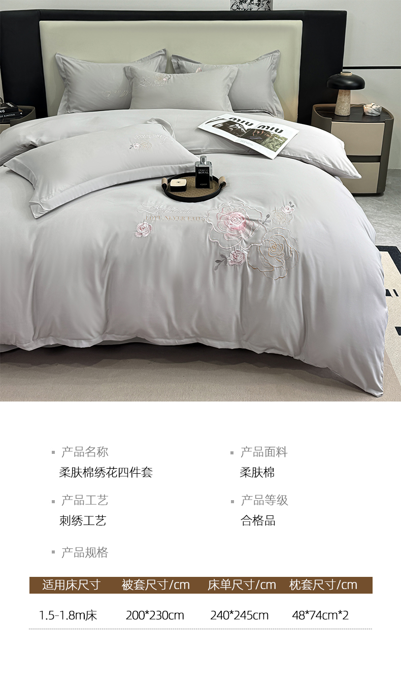 商品名称:悦织湾家纺 90克磨毛刺绣纯色四件套2025新款轻奢韩版公主风精致床上用品绣花亲肤水洗棉4件套 遇见-灰色