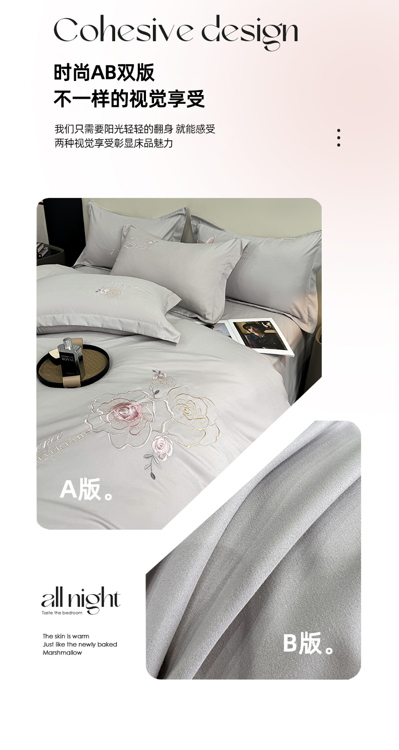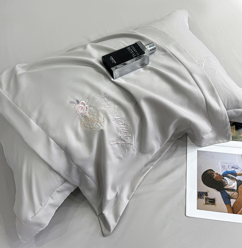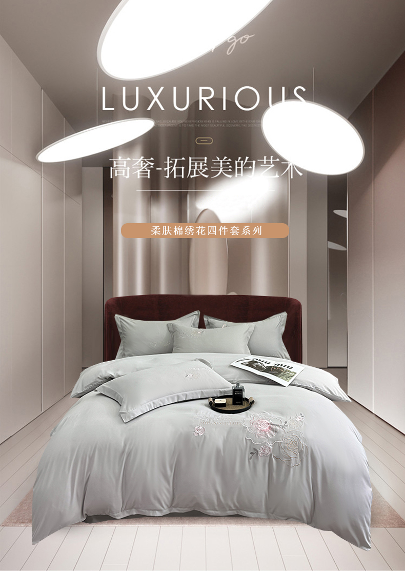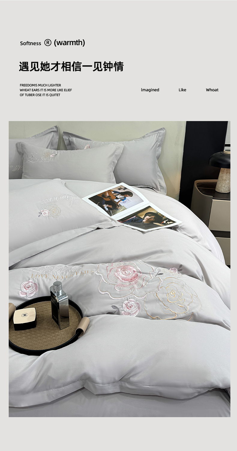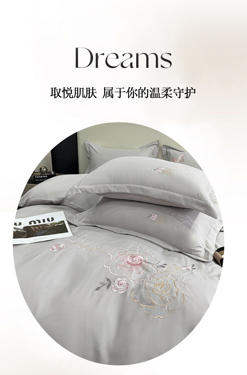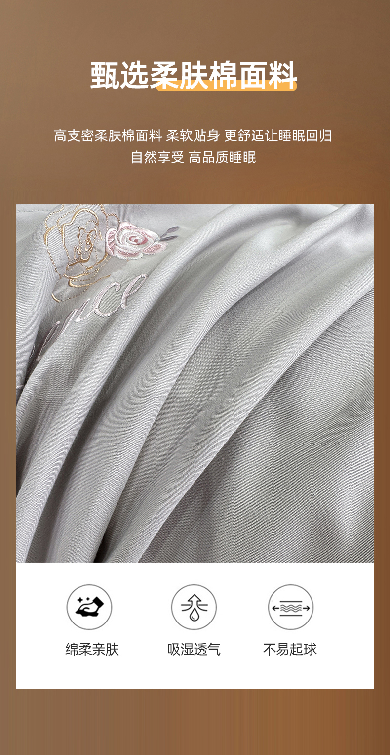 商品名称:悦织湾家纺 90克磨毛刺绣纯色四件套2025新款轻奢韩版公主风精致床上用品绣花亲肤水洗棉4件套 遇见-灰色