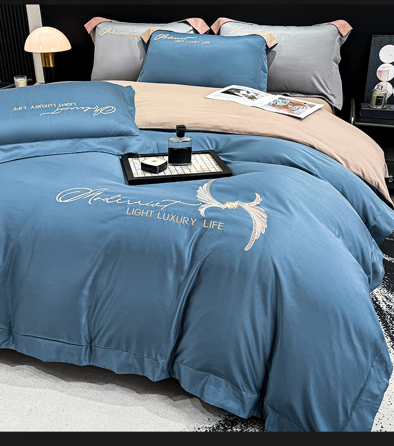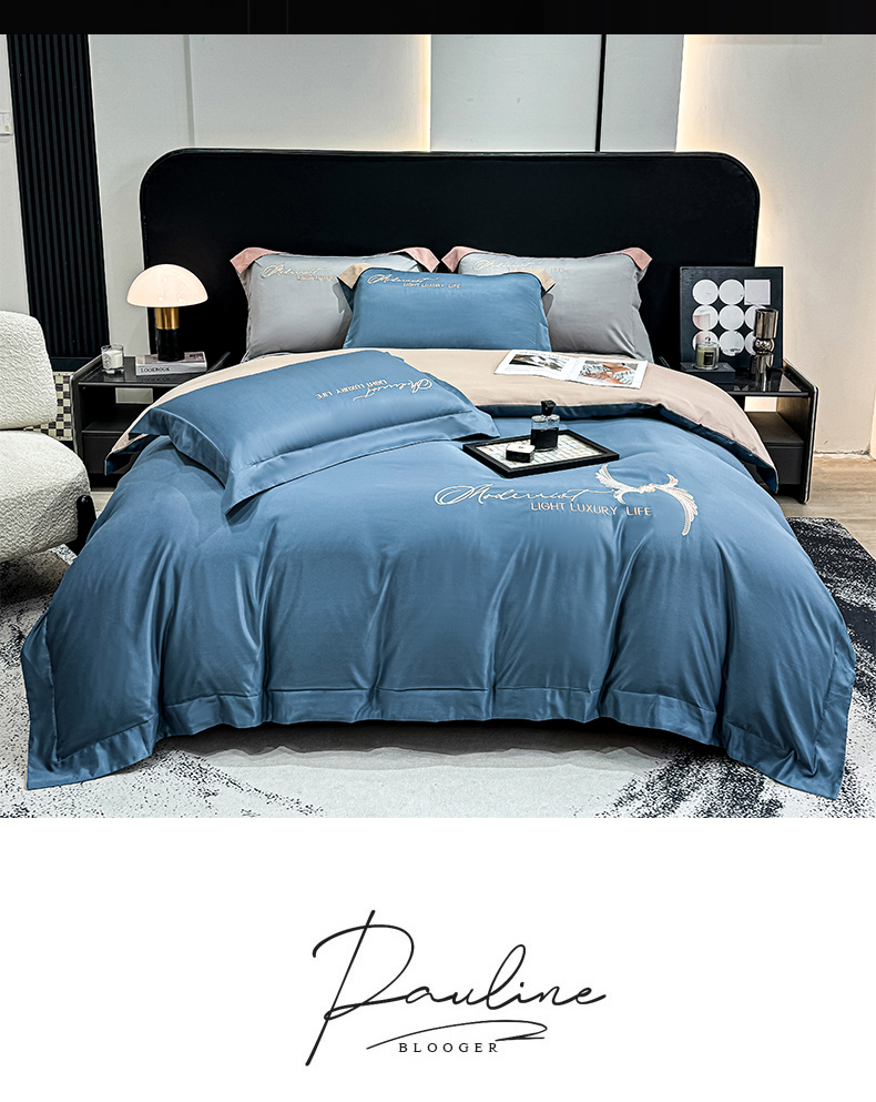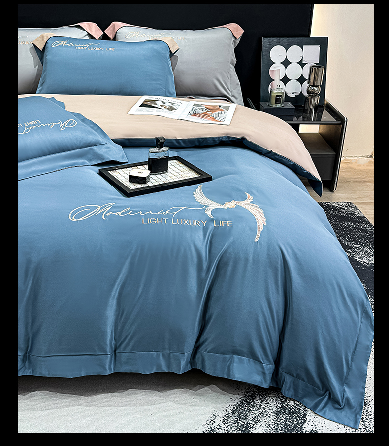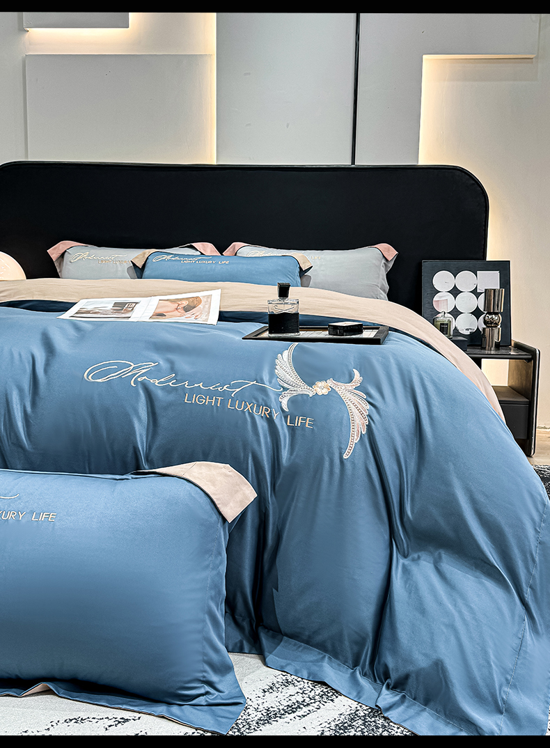 悦织湾家纺 亲肤120克水洗棉磨毛刺绣纯色四件套2025新款轻奢韩版公主风精致床上用品绣花4件套 宽境宾利蓝