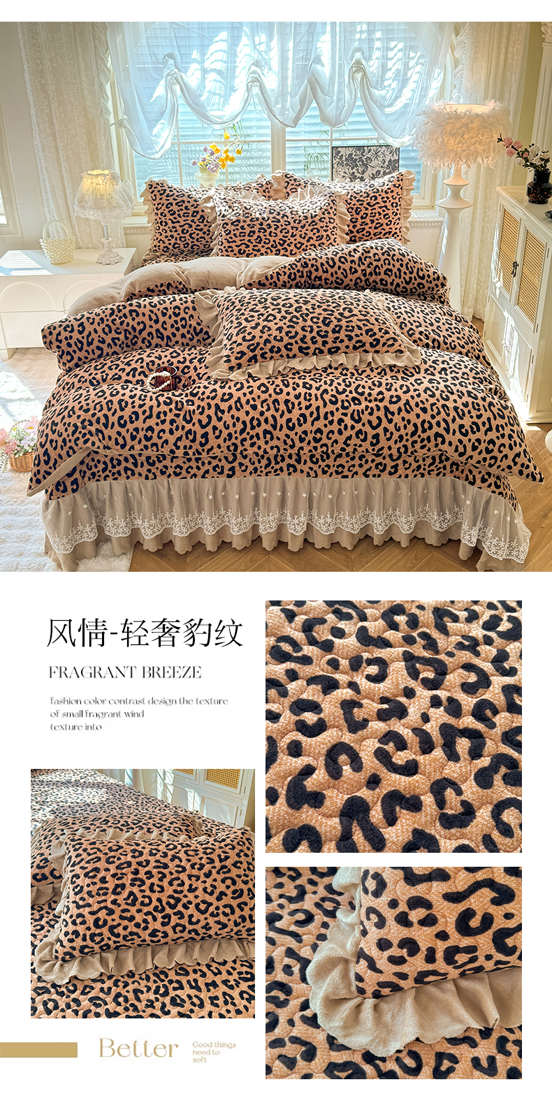 当前位置: 91家纺网 > 商品网购 > 床品套件 > 四件套 > 牛奶绒四件套 > 九诺家纺 2025新款直播热款双层蕾丝花边牛奶绒印花床盖四件套床盖单件三件套 风情-豹纹花语