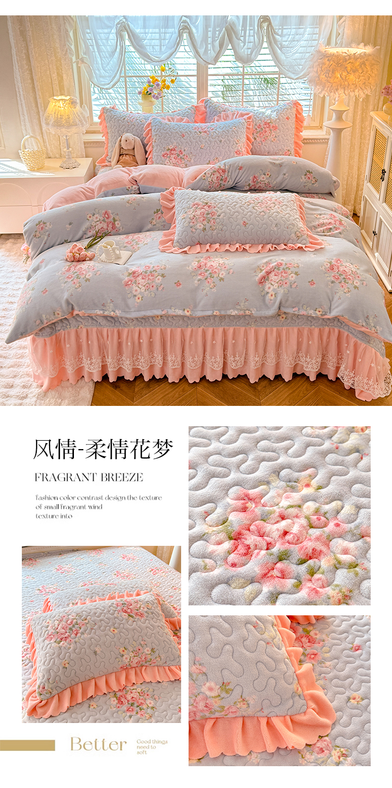 当前位置: 91家纺网 > 商品网购 > 床品套件 > 四件套 > 牛奶绒四件套 > 九诺家纺 2025新款直播热款双层蕾丝花边牛奶绒印花床盖四件套床盖单件三件套 时光-柔情花梦