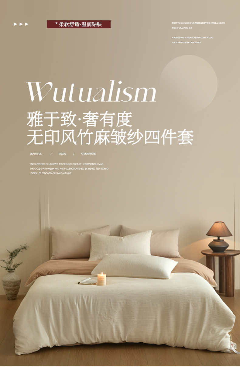商品名称:麦空家居 2025新款无印风竹麻皱纱简约纯色四件套 香槟-卡其