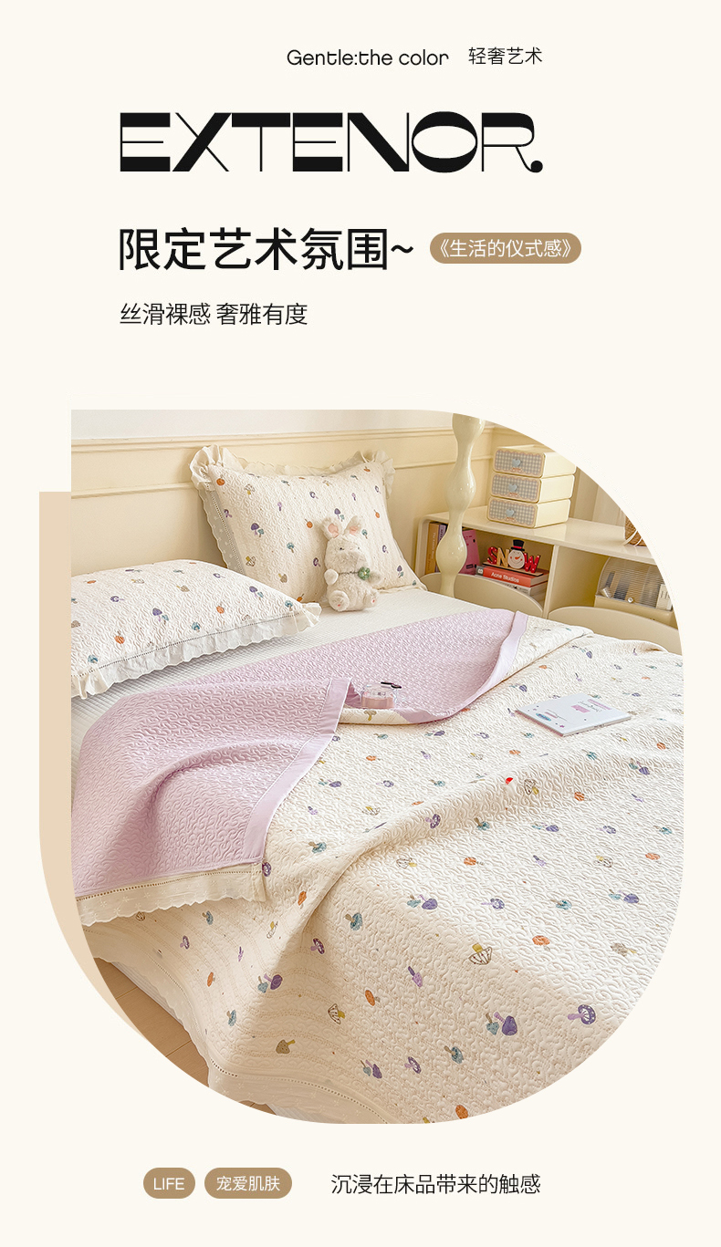 (总)叠派家纺 2026新款A类印花慕丝绵花边款床盖系列(抽空压缩可供跨境)提供买家秀,莫兰迪+浅紫,洛可可+粉,蓝庭叙+灰,锦芙+驼,金兰+黄,凡尔赛+粉,蓝漪+蓝,洛雅+黛紫,墨芳+灰,清漫+绿,波点序章+驼,青妍+粉,星心兔语+粉,熊兔叙+蓝,云菇森林+浅紫,木马童谣+灰,蛋糕熊+绿,甜梦熊+浅粉