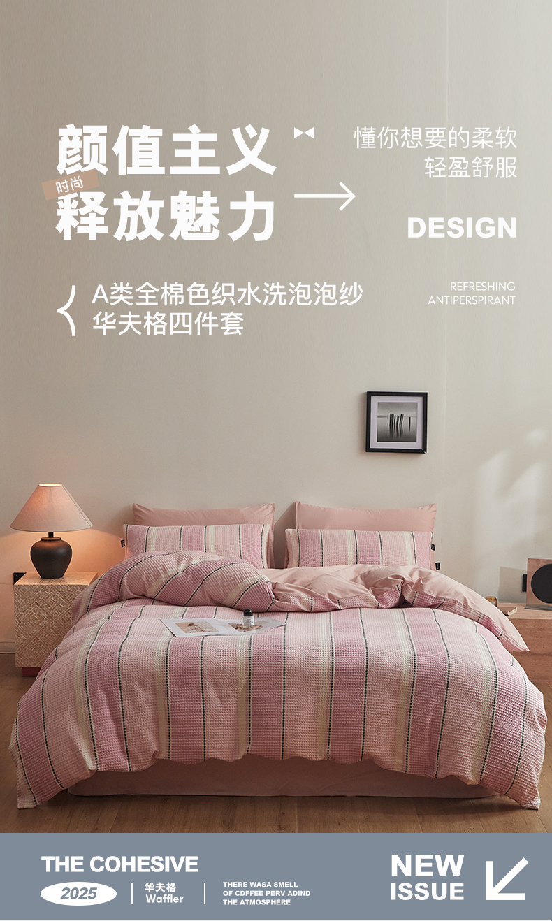 格里芬家纺 2025新款全棉色织水洗泡泡纱华夫格四件套-乐芙 乐芙-粉