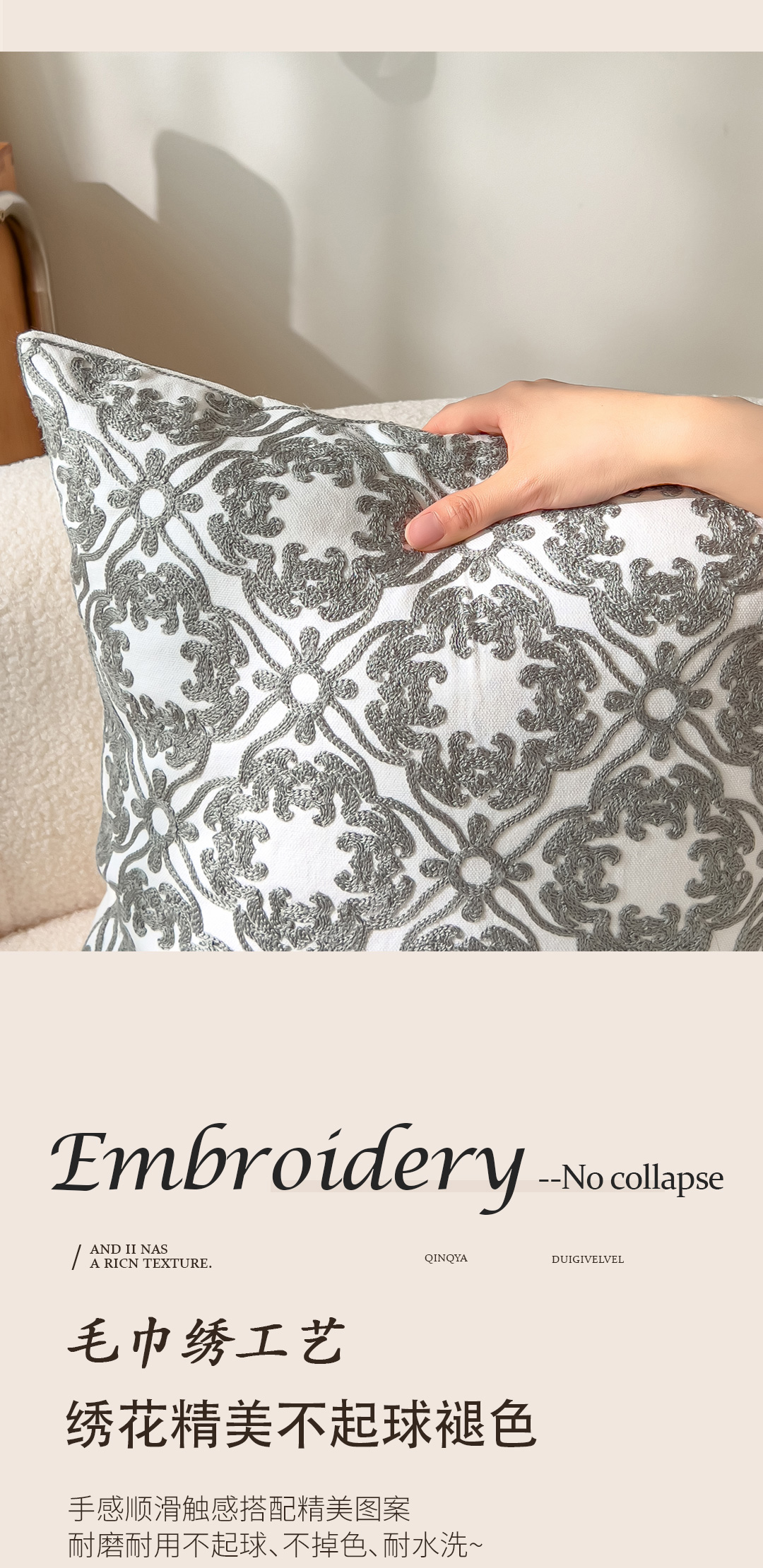 商品名称:诺可 2025新款全棉毛巾绣抱枕外贸跨境电商直播纯色几何系列-灰色 灰-团簇