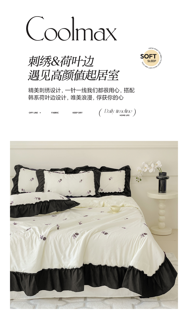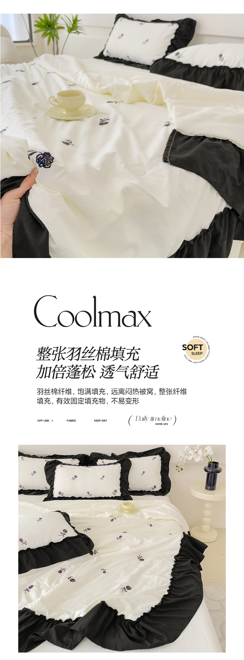 你好美丽 2025新款亲肤舒适水洗磨毛刺绣荷叶夏被四件套—初荷(场景二) 初荷-白黑玫瑰