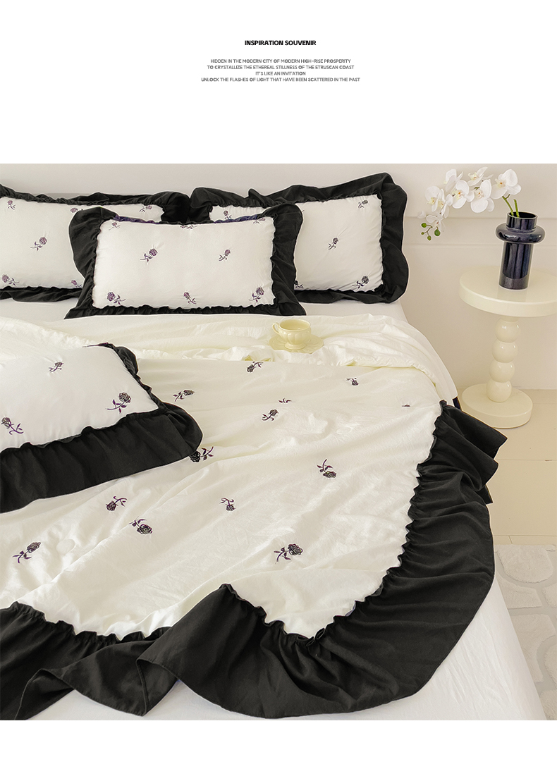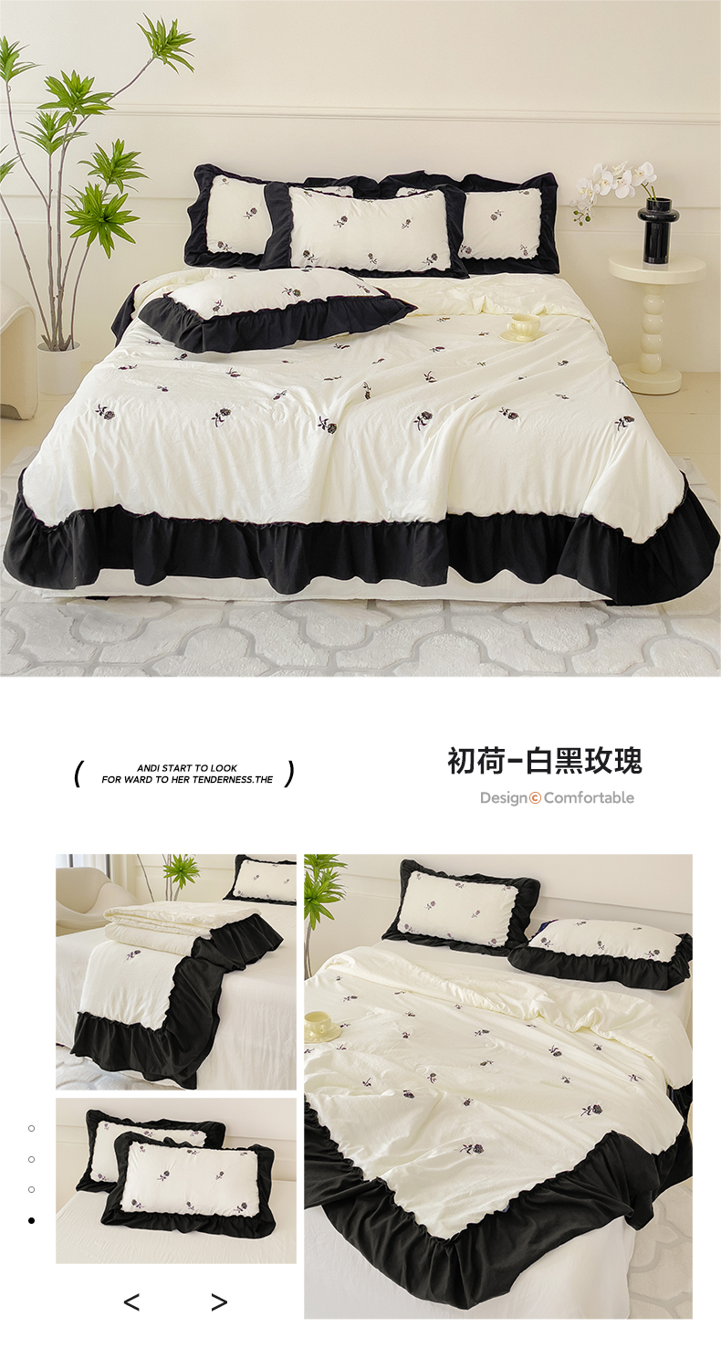 商品名称:你好美丽 2025新款亲肤舒适水洗磨毛刺绣荷叶夏被四件套—初荷(场景二) 初荷-白黑玫瑰