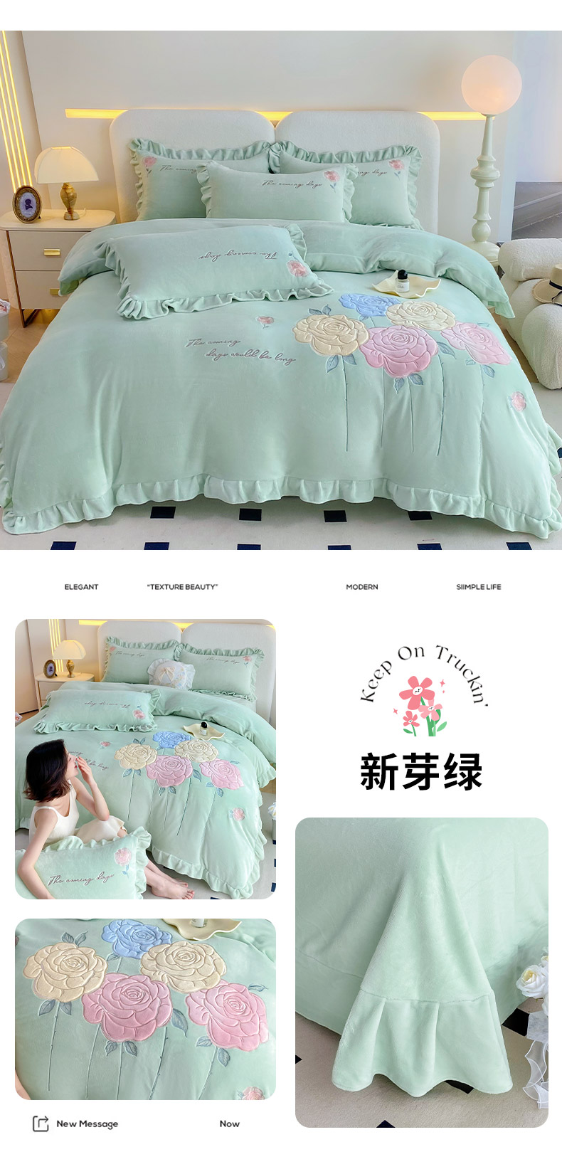 商品名称:可以家居 2024新款超细旦全消光有机云绒四件套-玫瑰的故事 玫瑰的故事-新芽绿