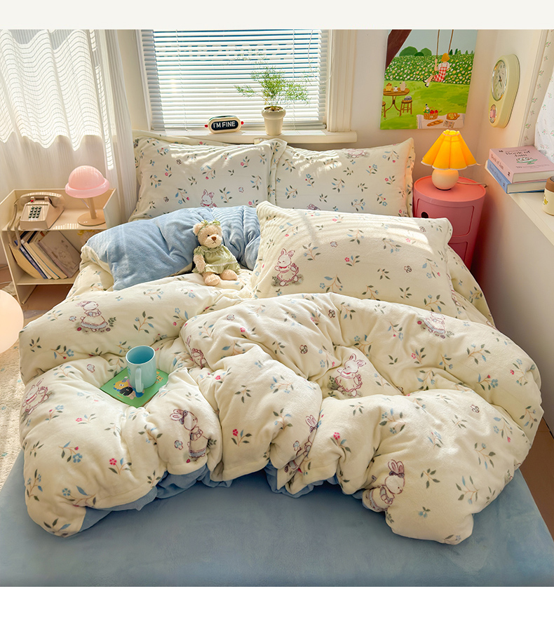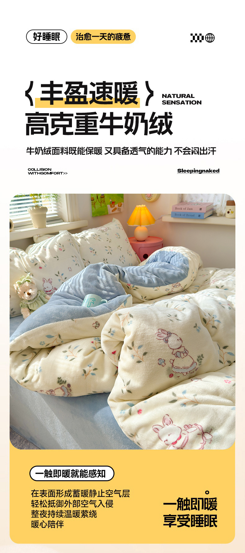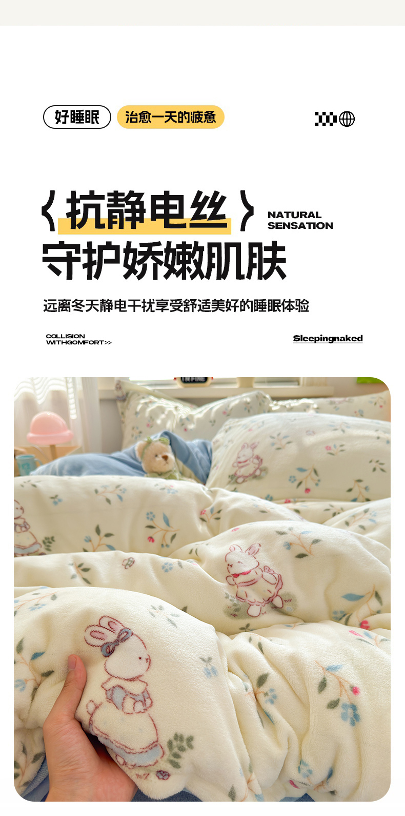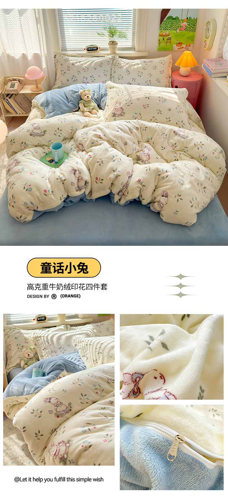 当前位置: 91家纺网 > 商品网购 > 床品套件 > 四件套 > 牛奶绒四件套 > 铭宣 2025新款高克重牛奶绒印花保暖四件套床单床笠单被套款 童话小兔