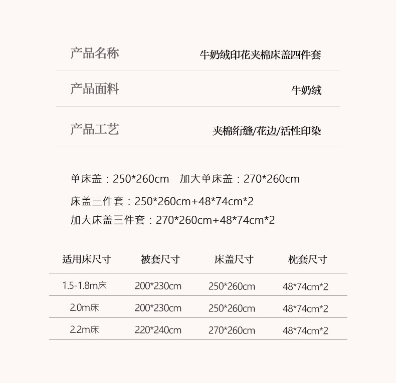 270*260cm床盖48*74cm枕套2只 | ¥70.00 |