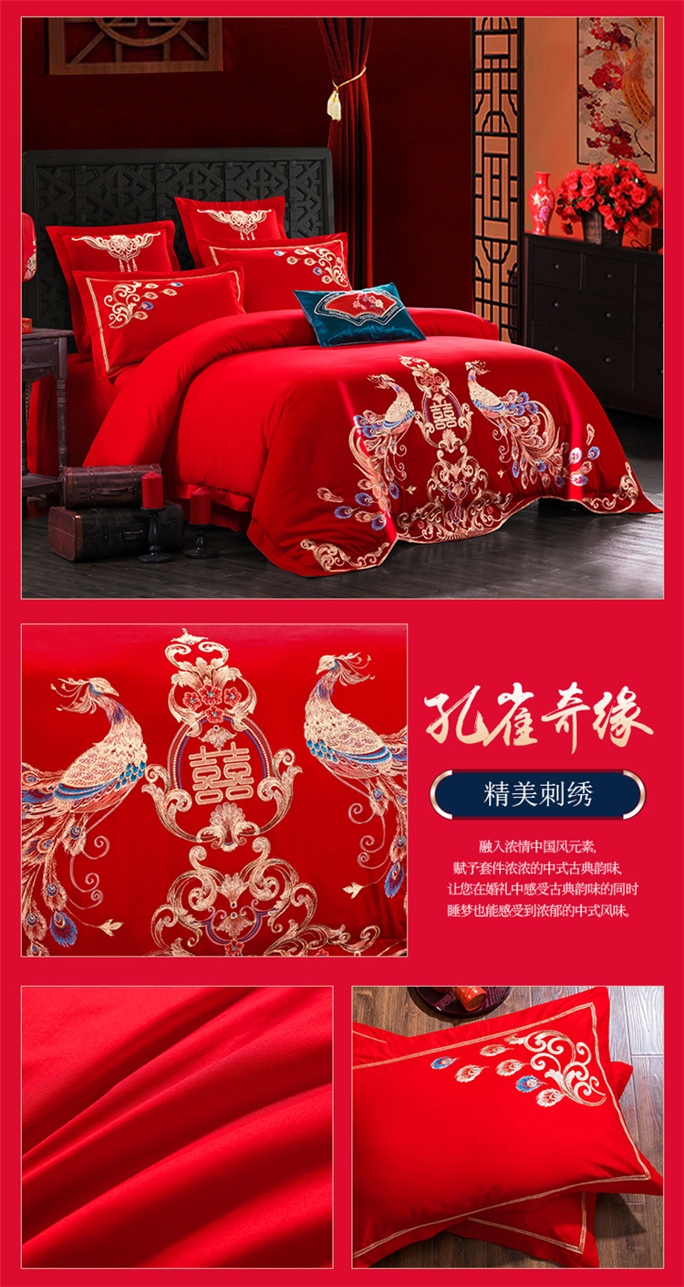 商品名称:千禧婚庆专供 2019新款喷气全棉婚庆四件套多件套 孔雀奇缘