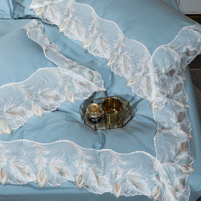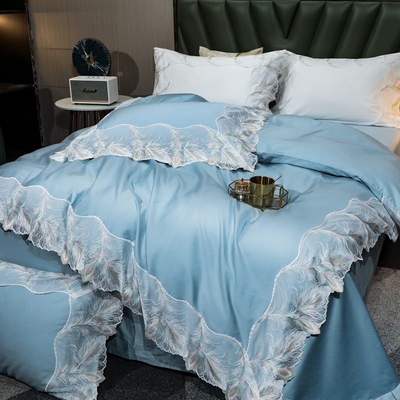 榻尚家居新款纯美蕾丝大花边长绒棉贡缎四件套 安娜 天蓝