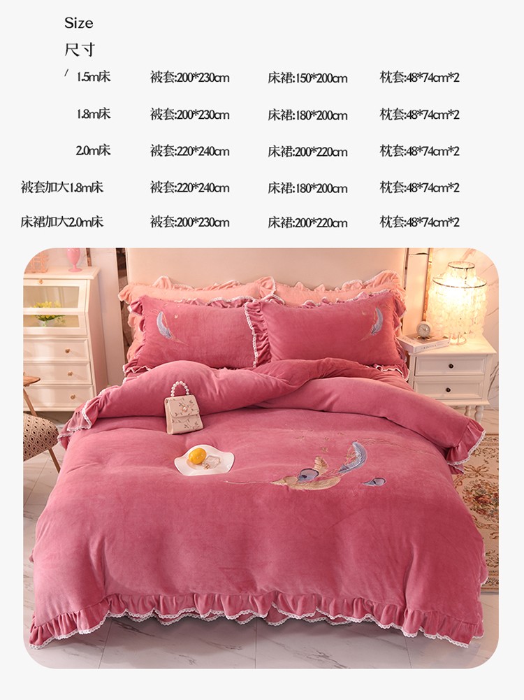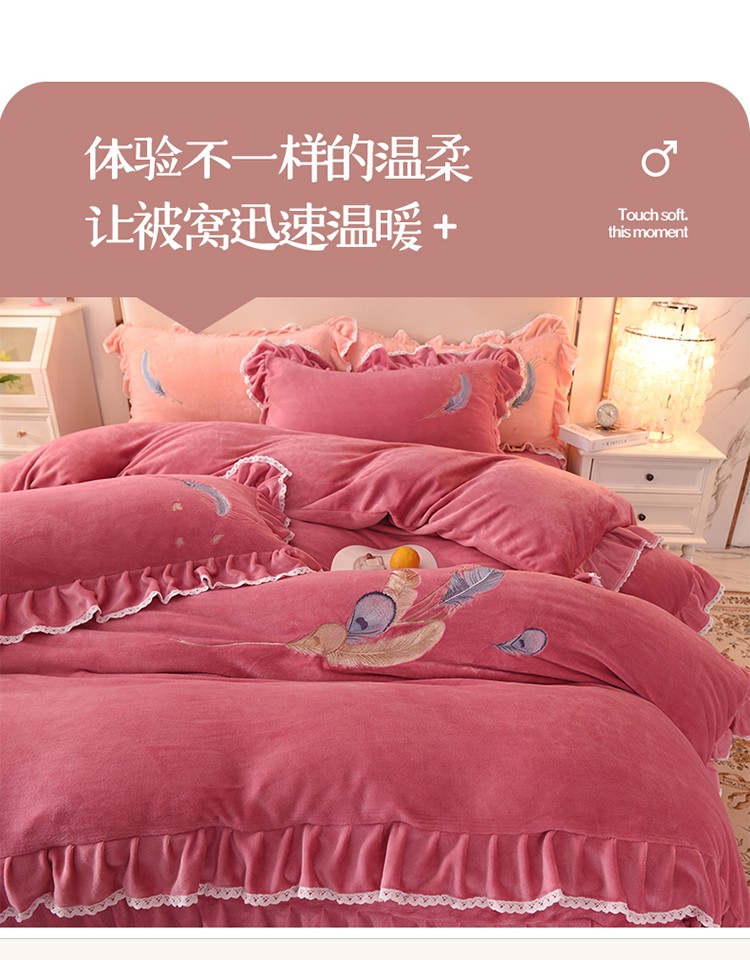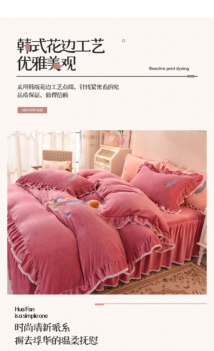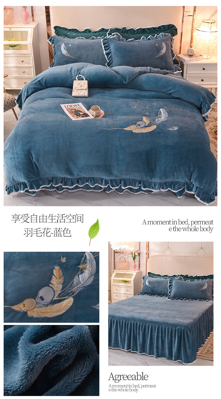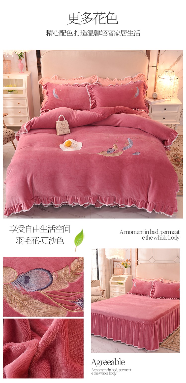 (总)迪欧芙2023新款加厚牛奶绒刺绣床裙款四件套羽毛花