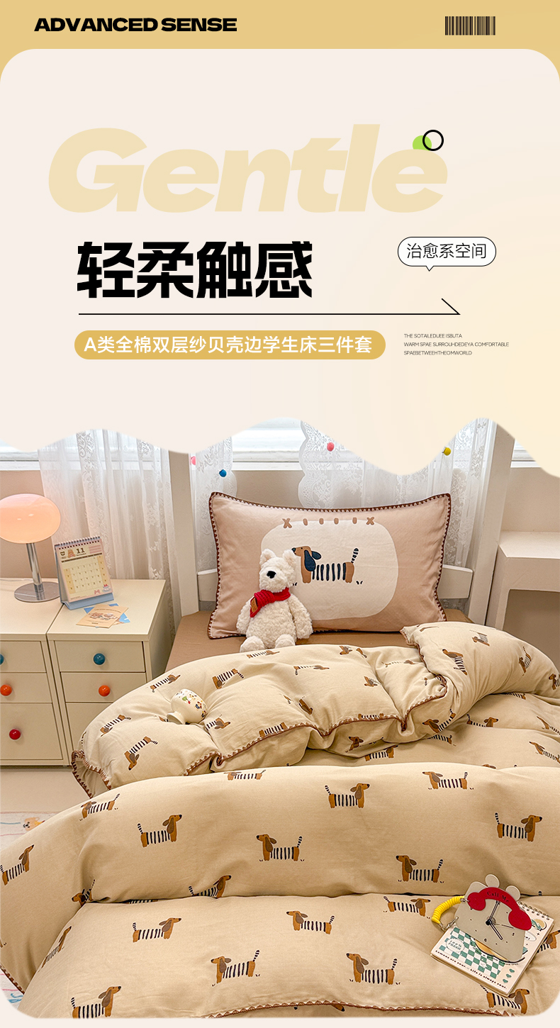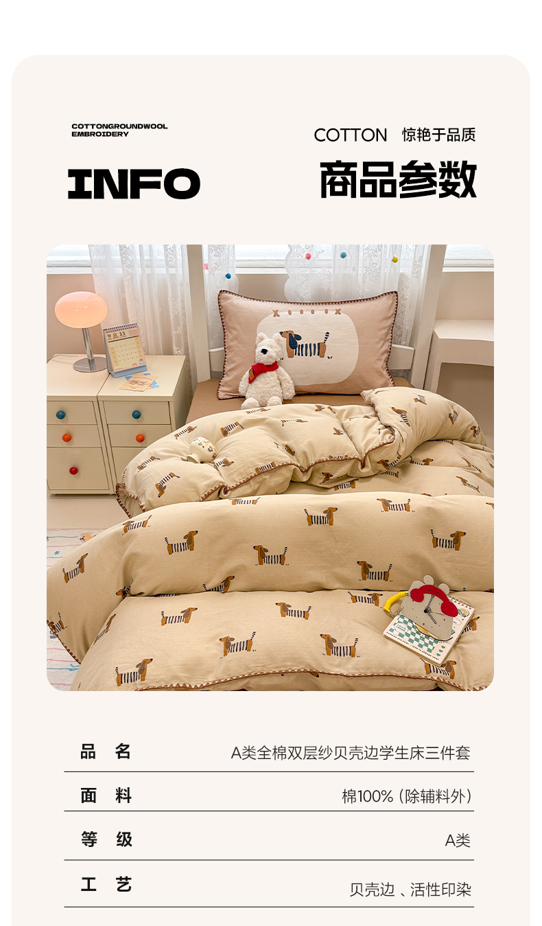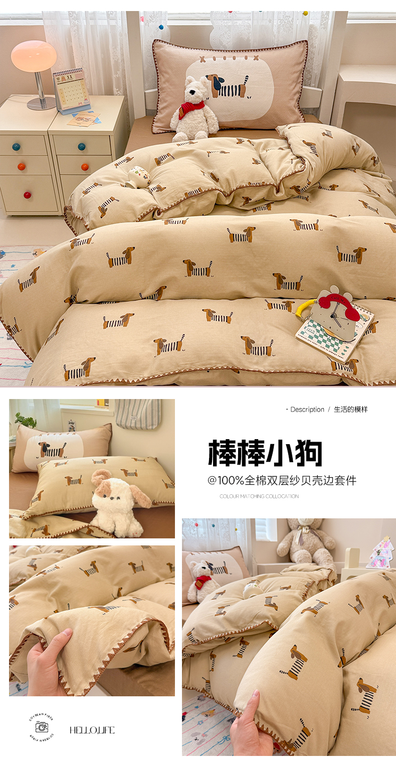 当前位置: 91家纺网 > 商品网购 > 床品套件 > 三件套 > 沐辰 2025新款全棉双层纱A类贝壳边学生床三件套 棒棒小狗
