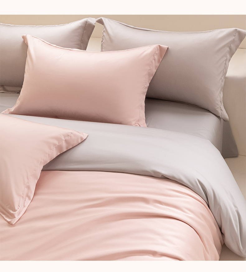 • 91家纺网 家纺一手货源 找家纺 涵宸家纺 2026新款纯色天丝棉四件套-场景二 玫瑰粉+时尚灰