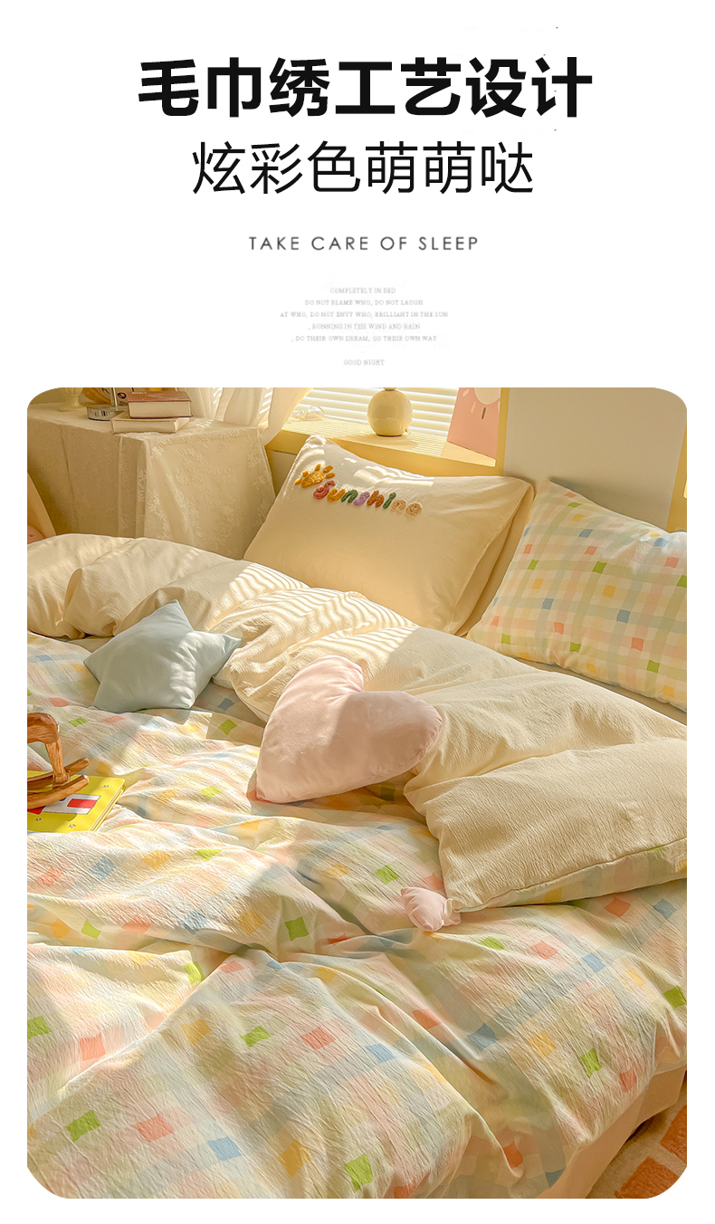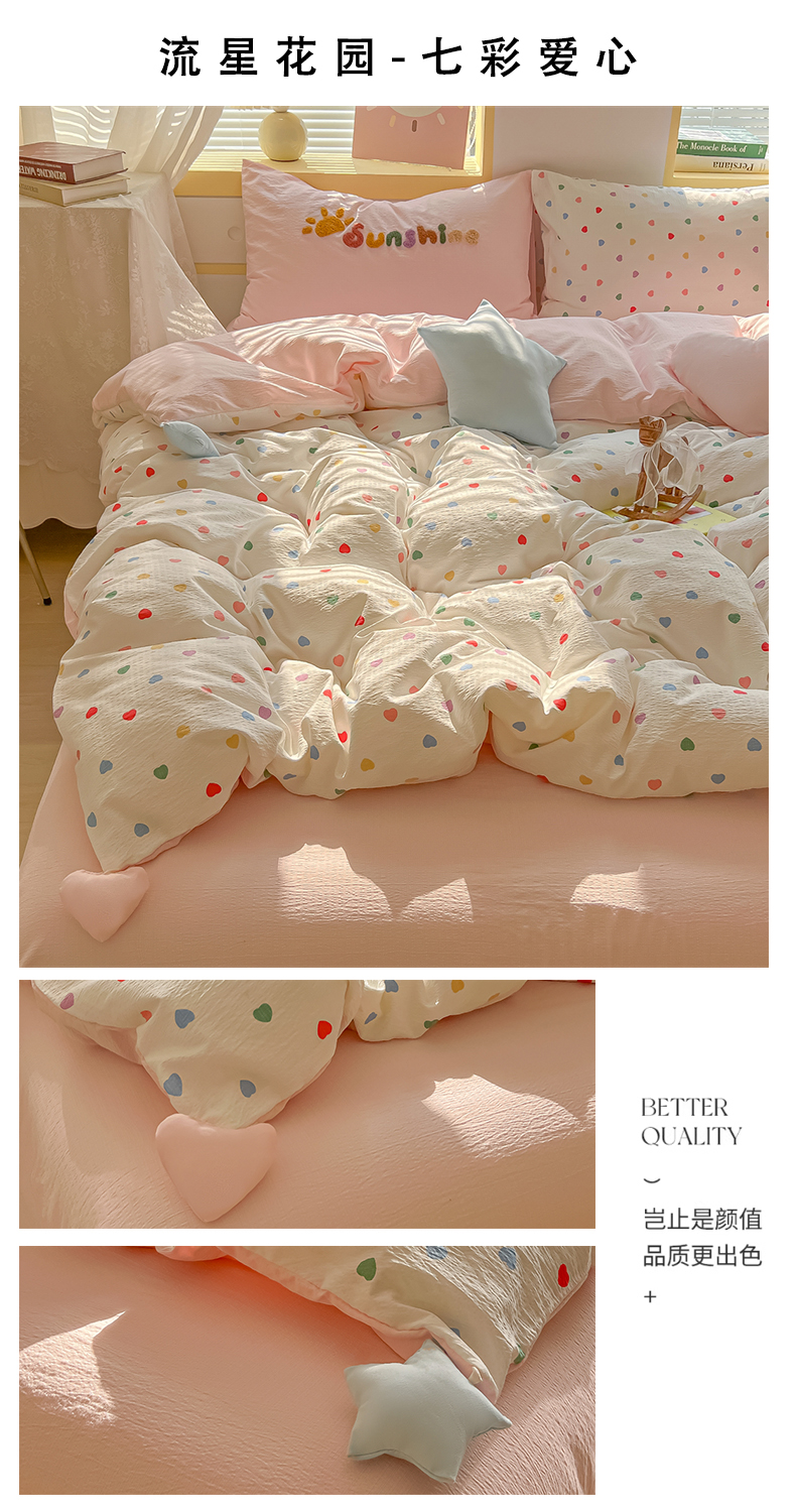 商品名称:子钦家纺 2026春夏新款提花泡芙棉可爱小清新手工爱心小星星系列床单床笠四件套-流星花园 流星花园-七彩格