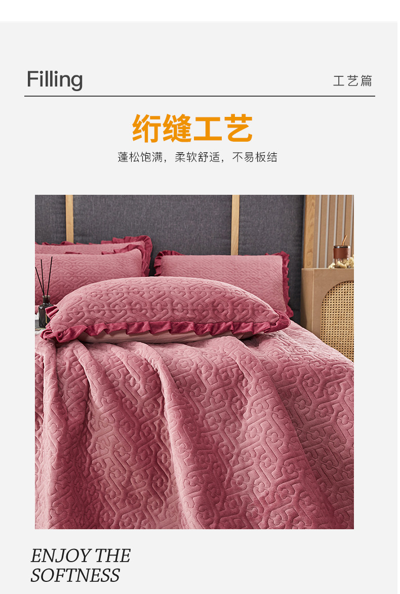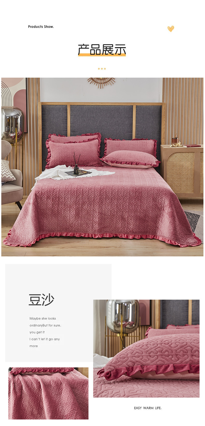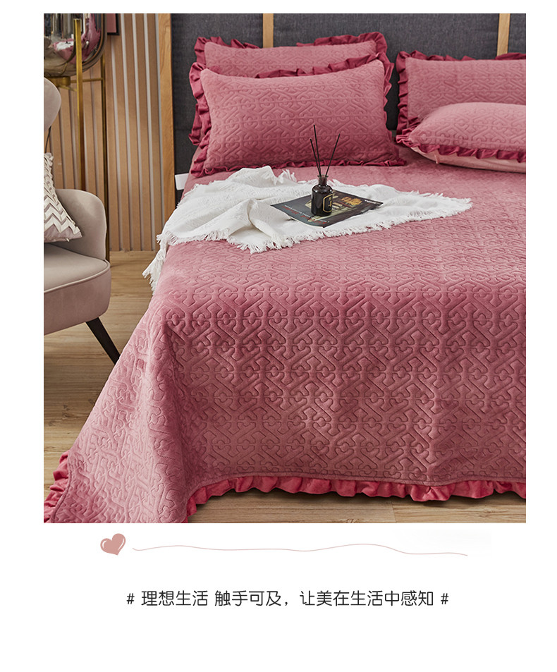佳梦家纺 牛奶绒纯色花边床盖绗缝夹棉绒毯三件套榻榻米席梦思床垫子 豆沙