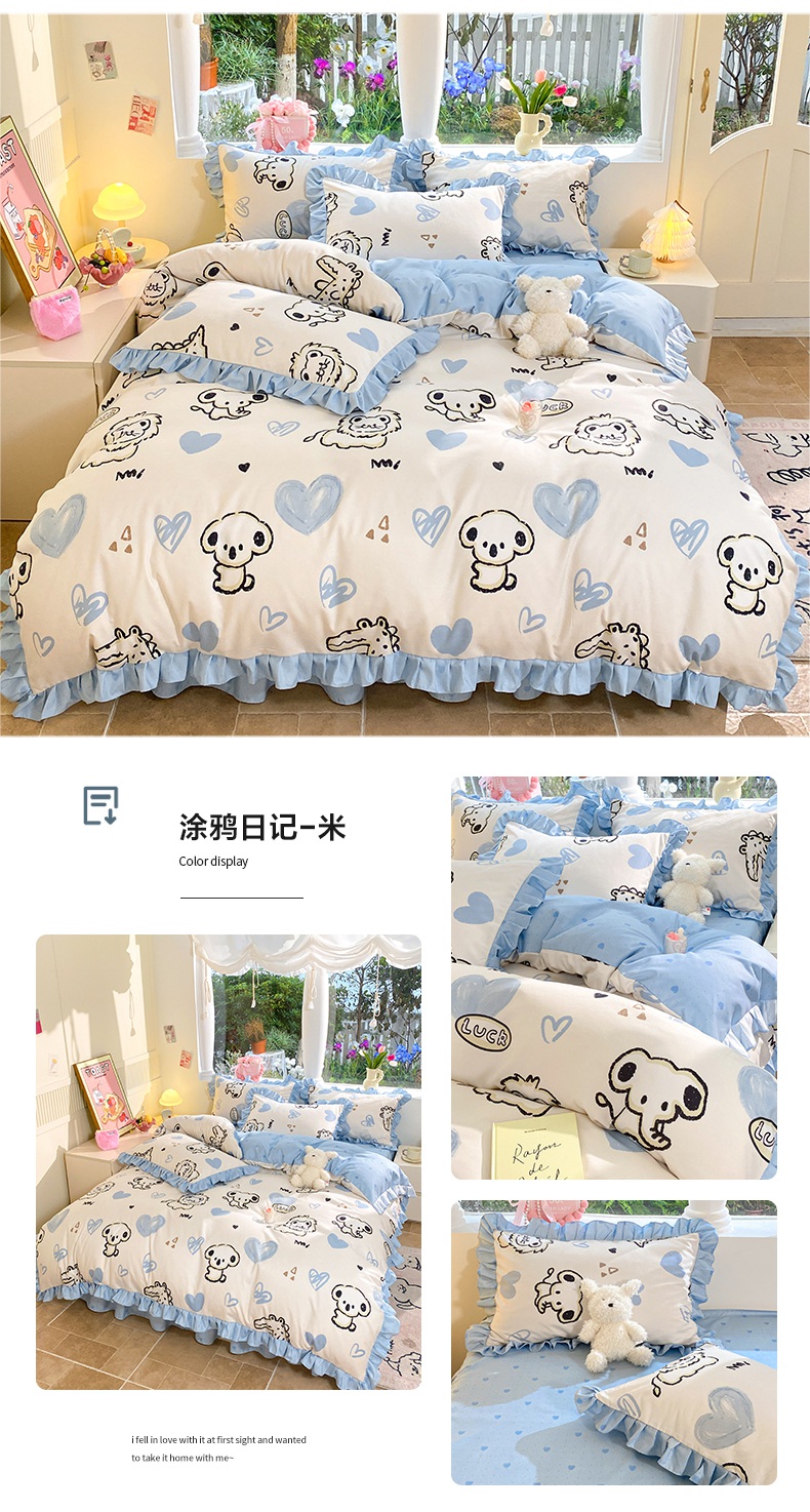 当前位置: 91家纺网 > 商品网购 > 床品套件 > 四件套 > 化纤活性四件套 > 亨通家纺 2025新款亲肤棉花边韩版床裙四件套 涂鸦日记-米