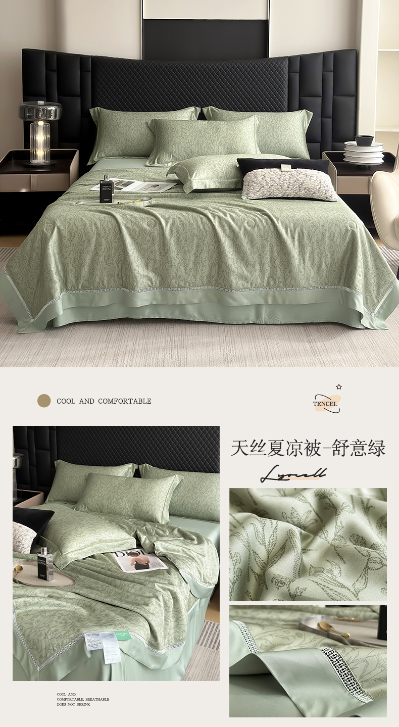 商品名称:娇逸家居 2025新款50支印花莱赛尔天丝夏被镂空款花边夏凉被 舒意-绿