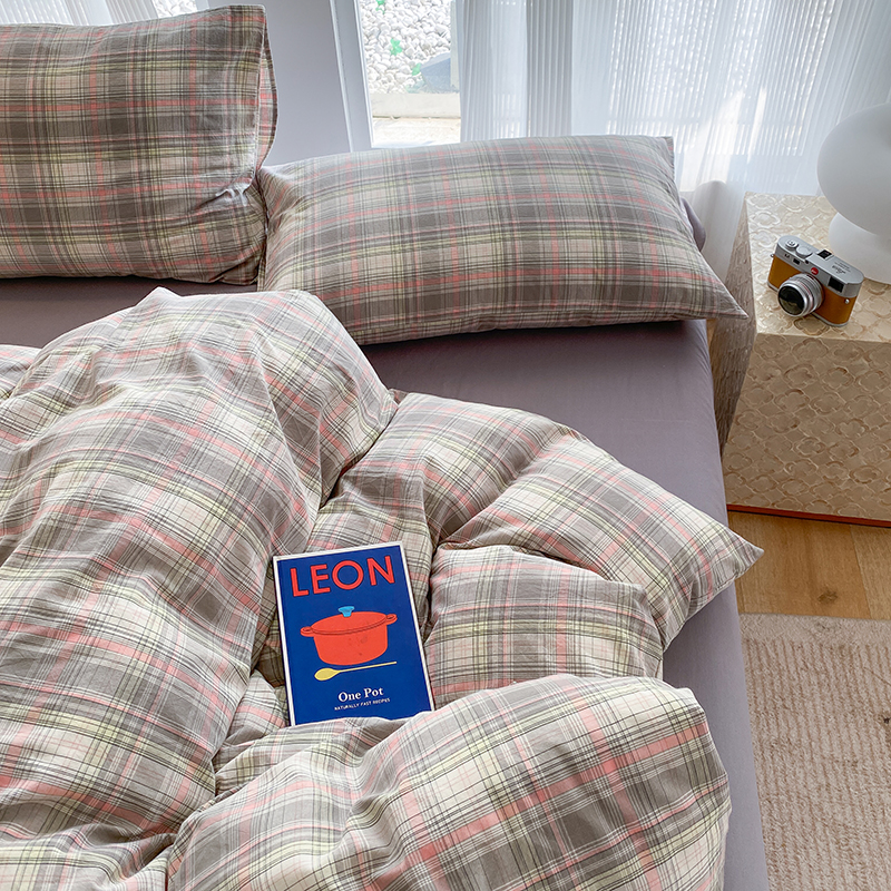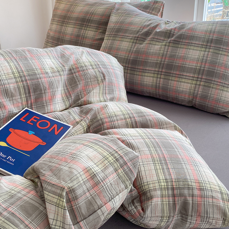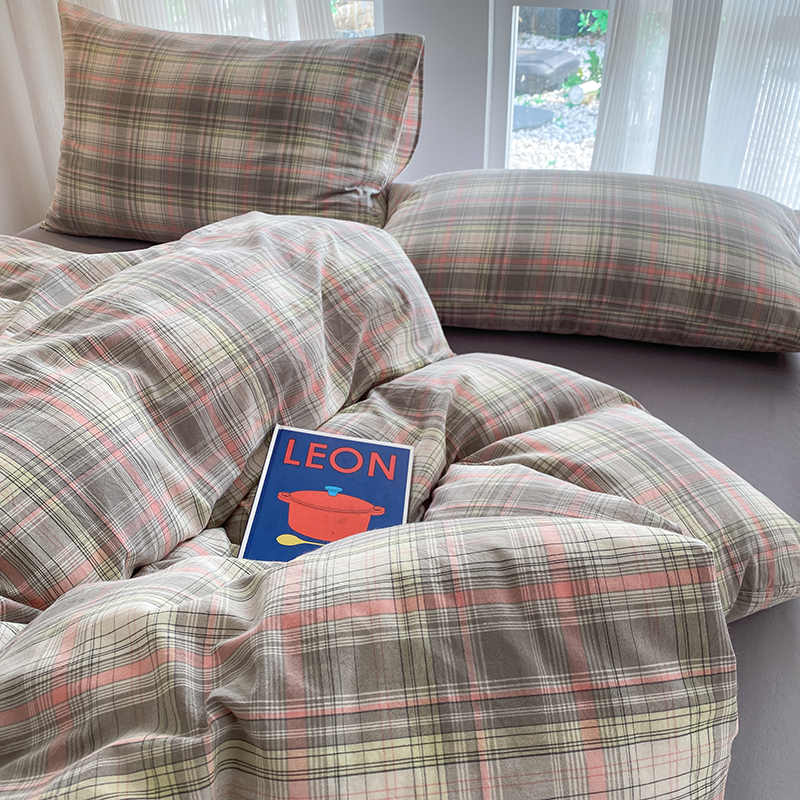 尚品本色 2024新款简约风水洗棉格子条纹系列四件套米兰灰格