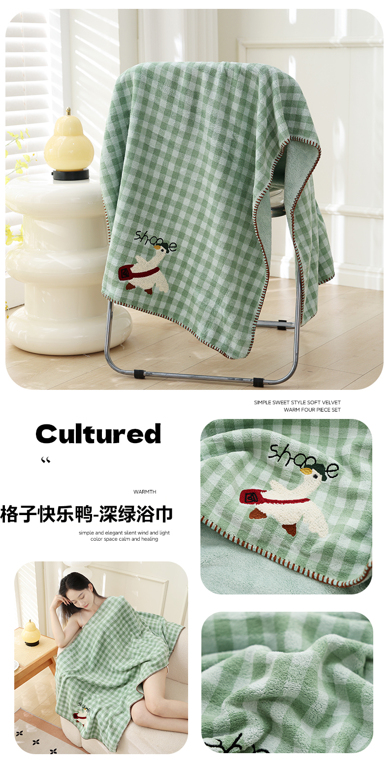 商品名称:(总)朴尔家纺-毛巾被 2025新款毛巾绣勾边小格快乐鸭AB版珊瑚绒速吸速干毛巾