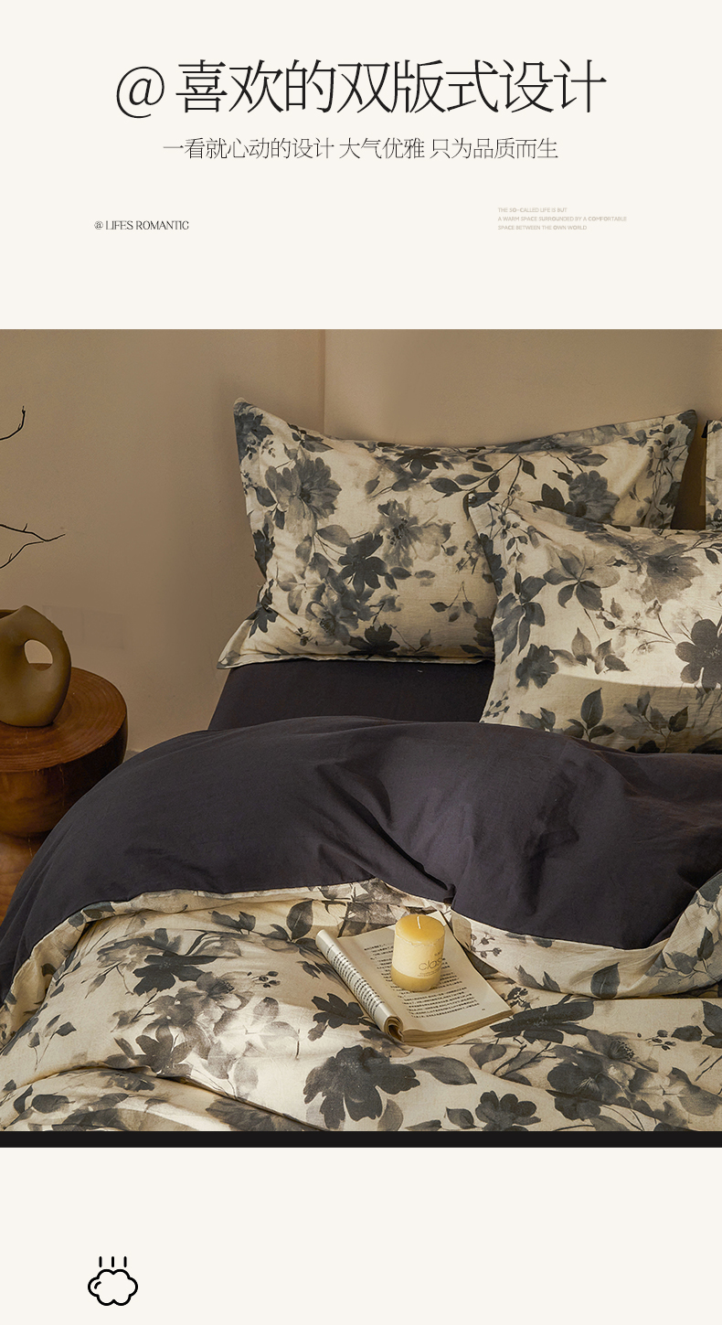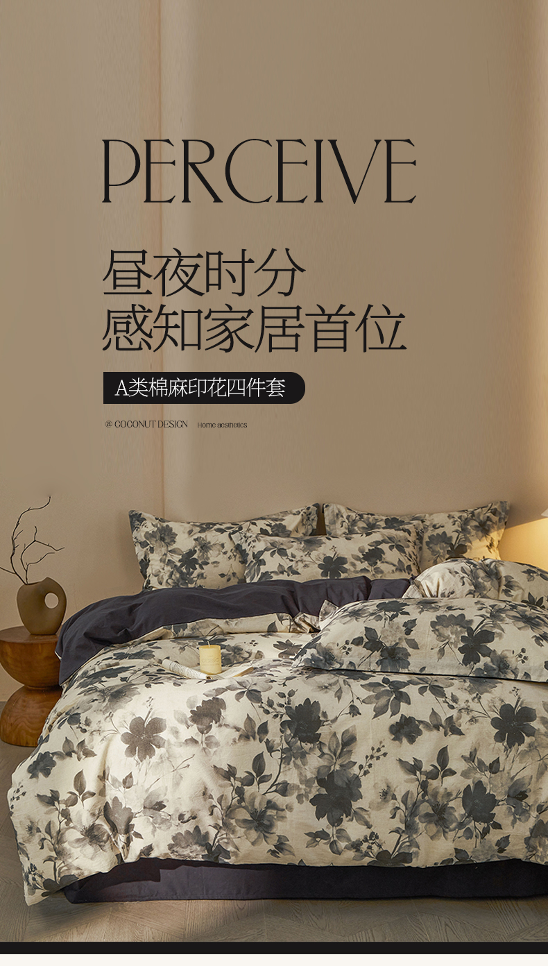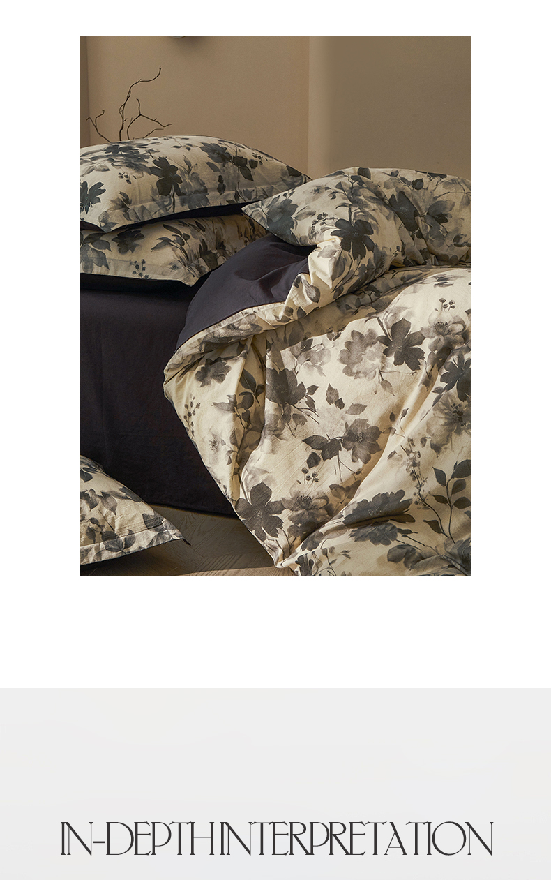 涵宸家纺 2026新款棉麻数码印花四件套 墨染花影