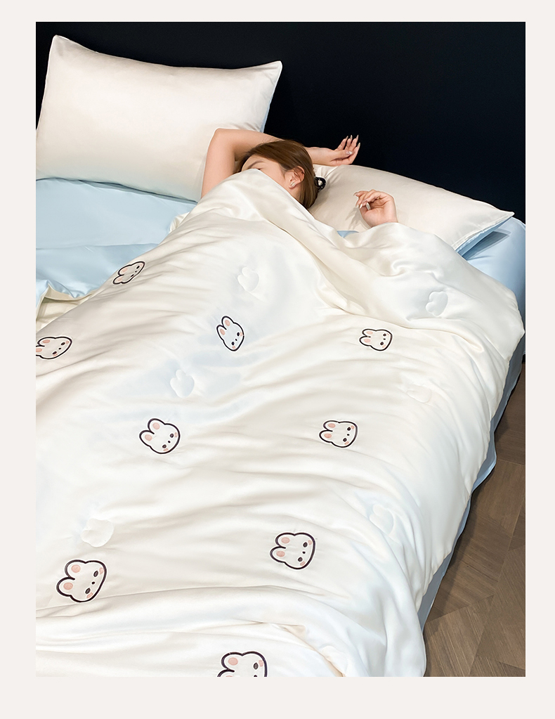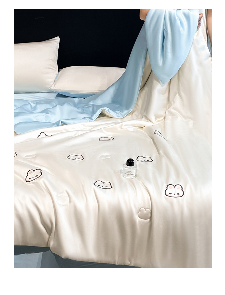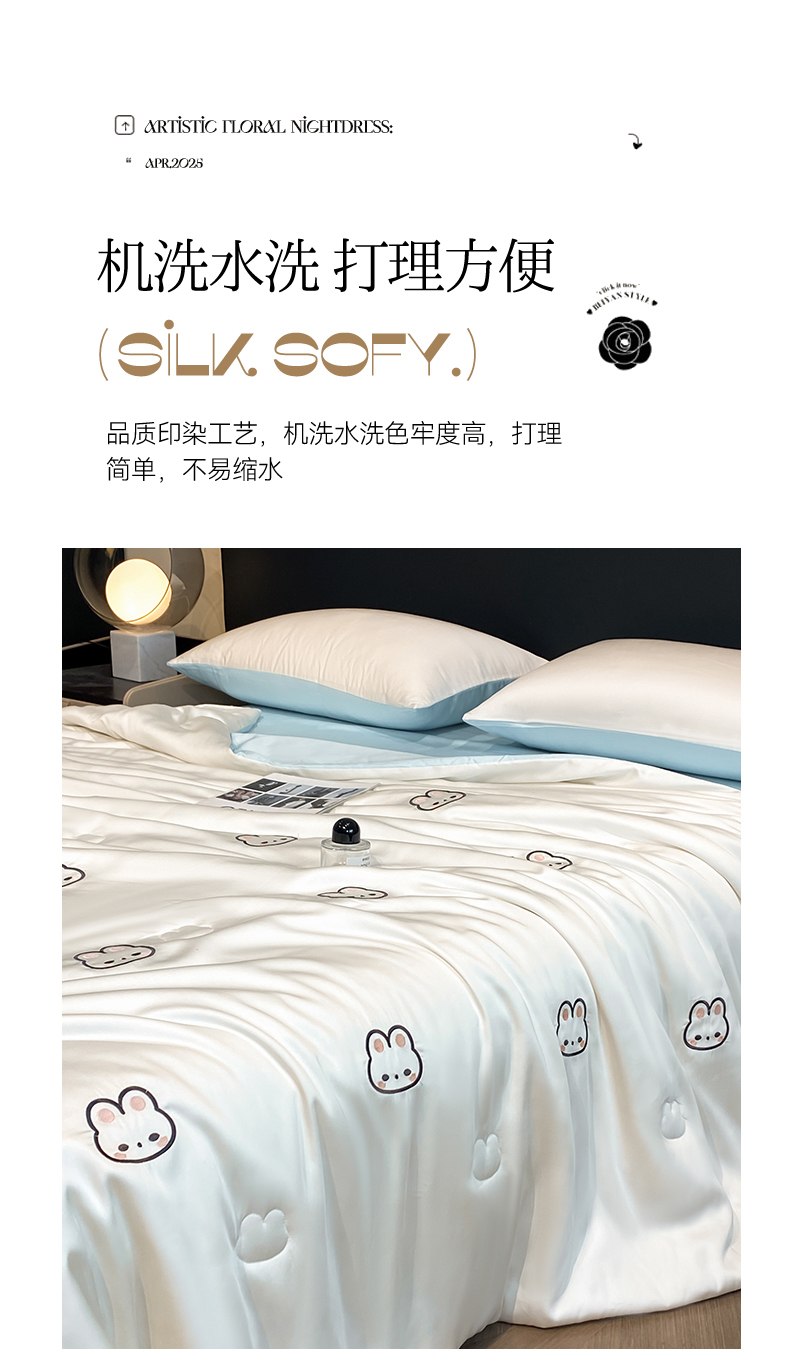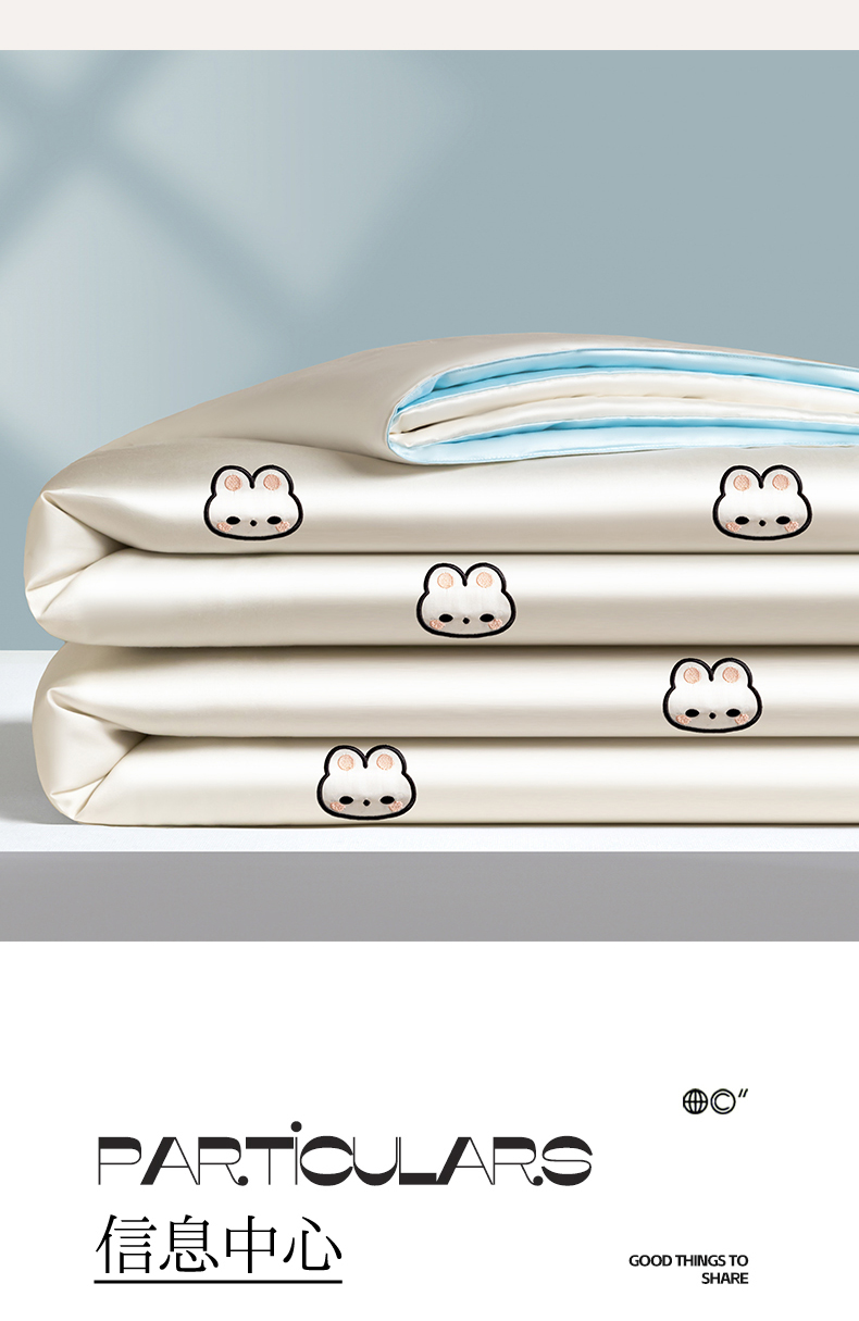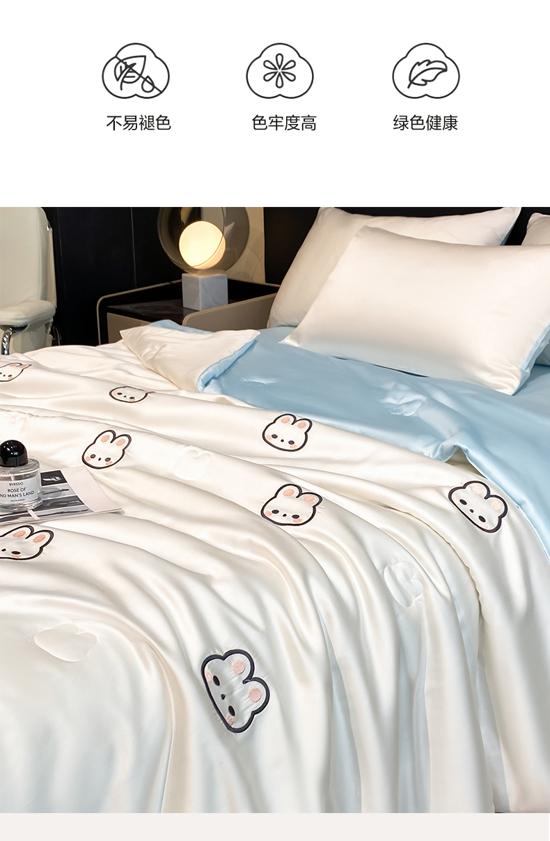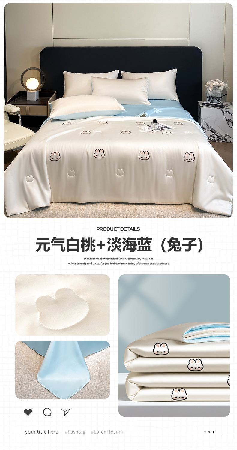 • 91家纺网 家纺一手货源 找家纺 无界 2026新款水洗真丝夏被-散点-贝尔 贝尔 元气白桃+淡海蓝(兔子)