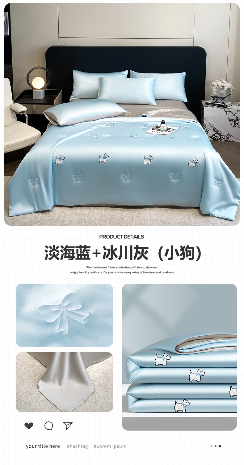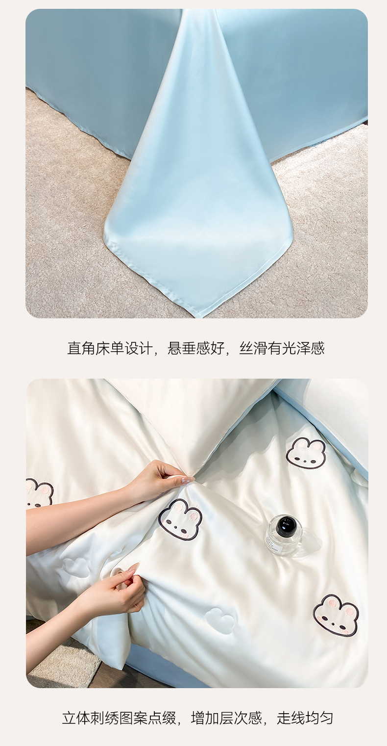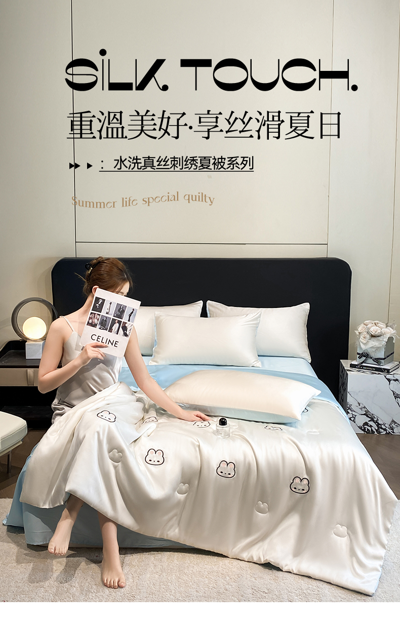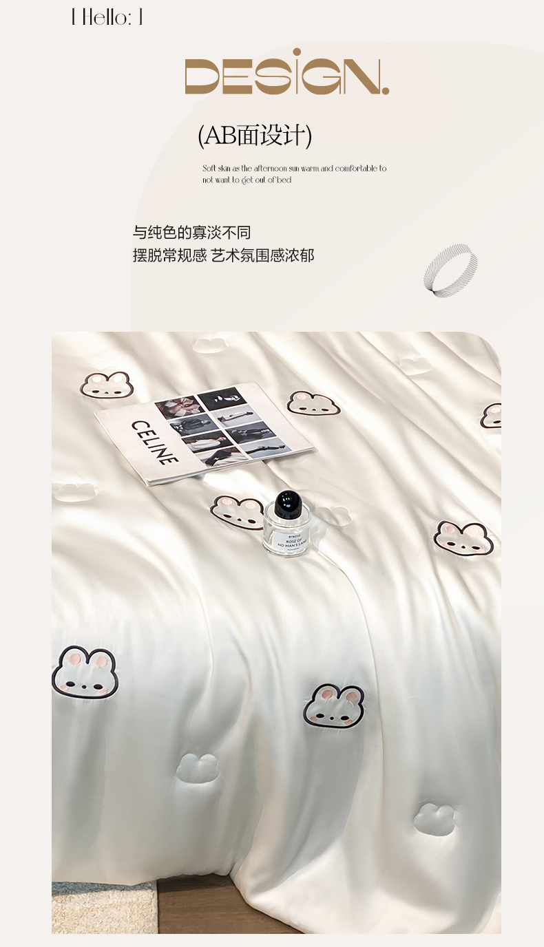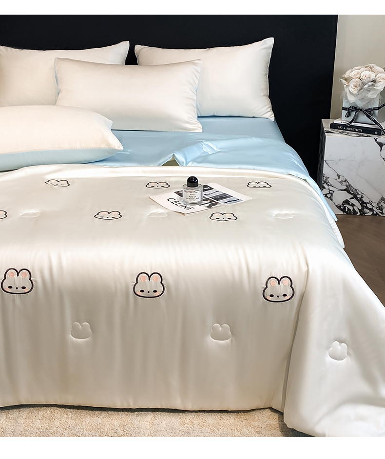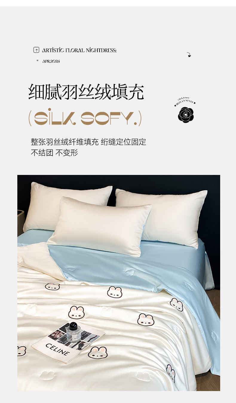 • 91家纺网 家纺一手货源 找家纺 无界 2026新款水洗真丝夏被-散点-贝尔 贝尔 元气白桃+淡海蓝(兔子)