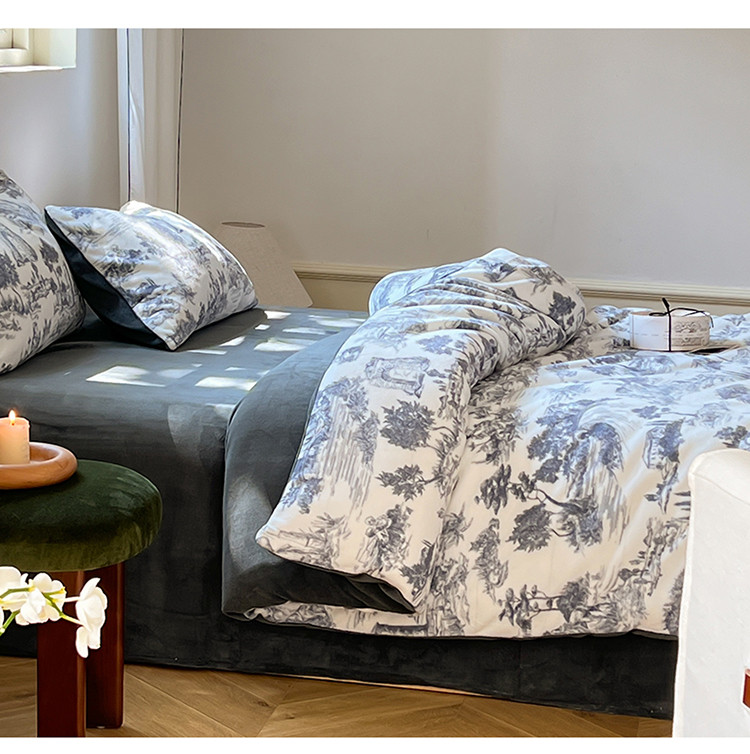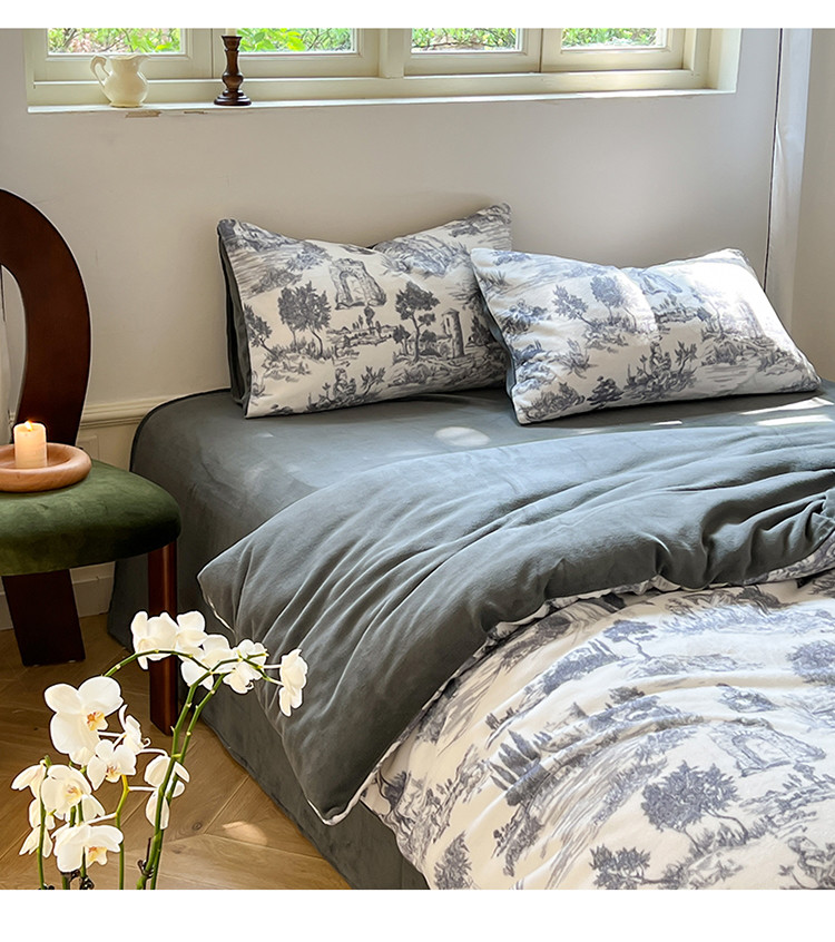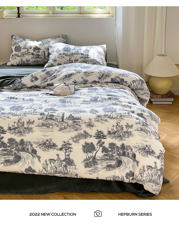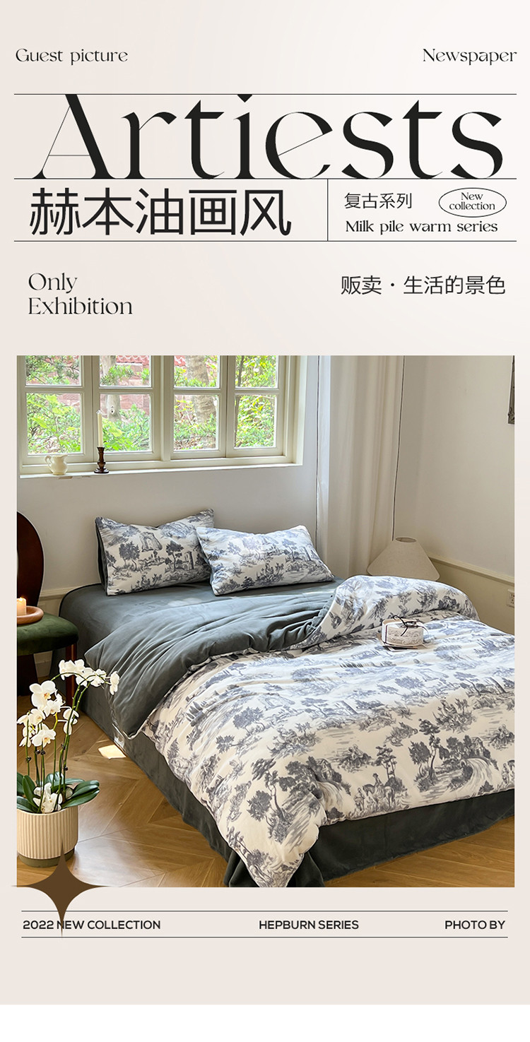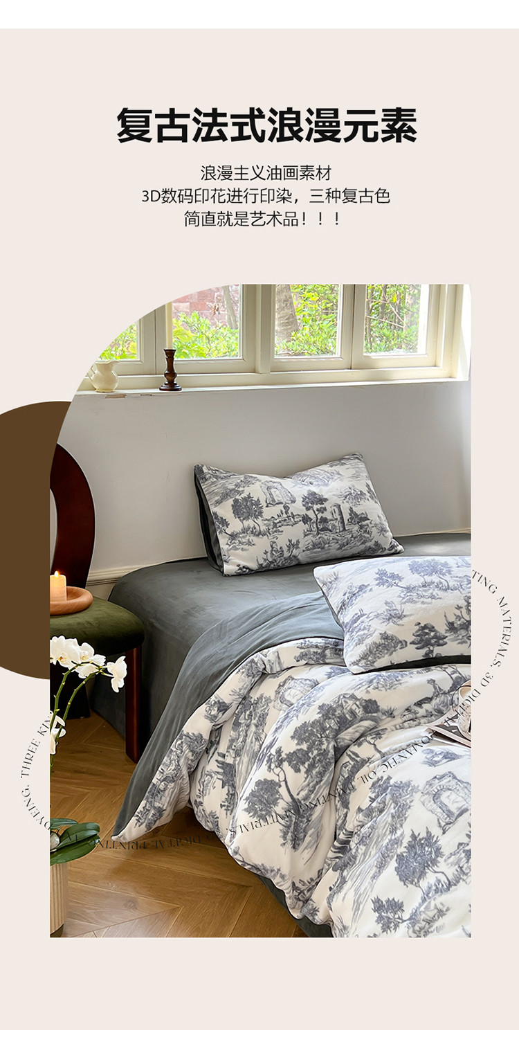 商品名称:六巷胡同 2022新款赫本复古油画风200g牛奶绒四件套 巴赫庄园-深灰