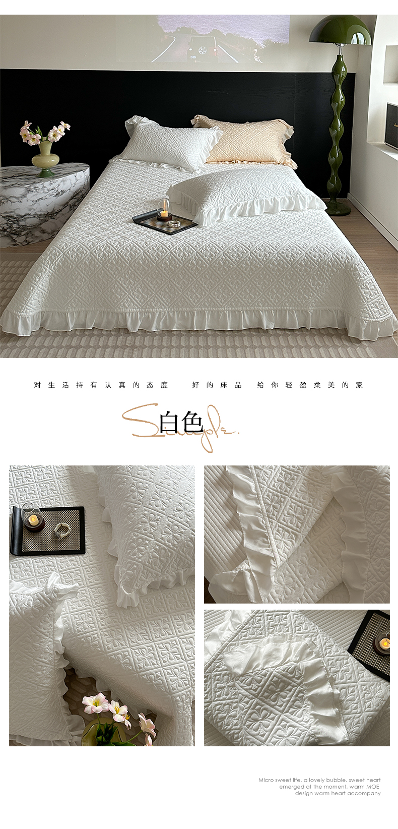 诗黛尔 2024春夏新款莱赛尔克罗星花边床盖系列三件套 白色