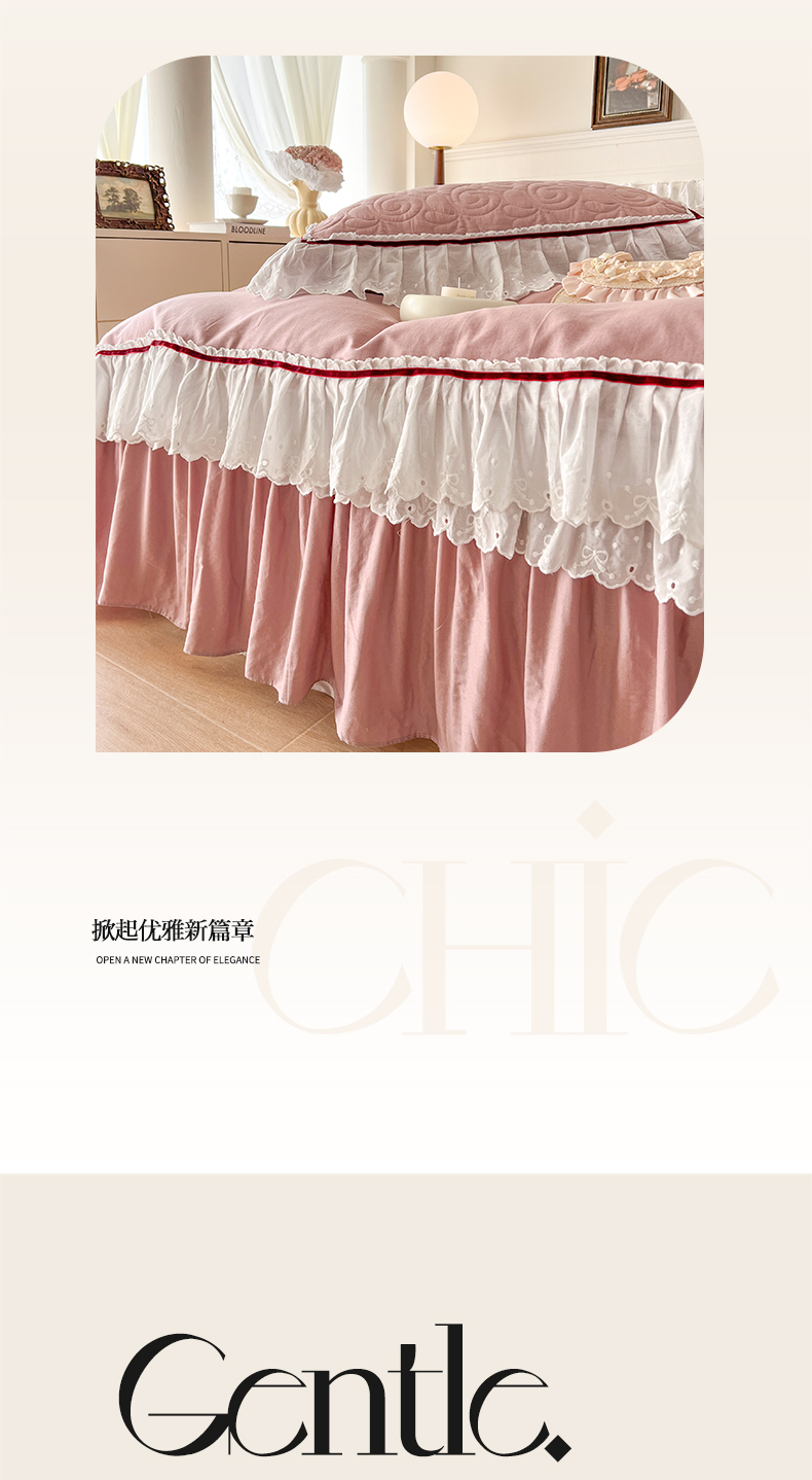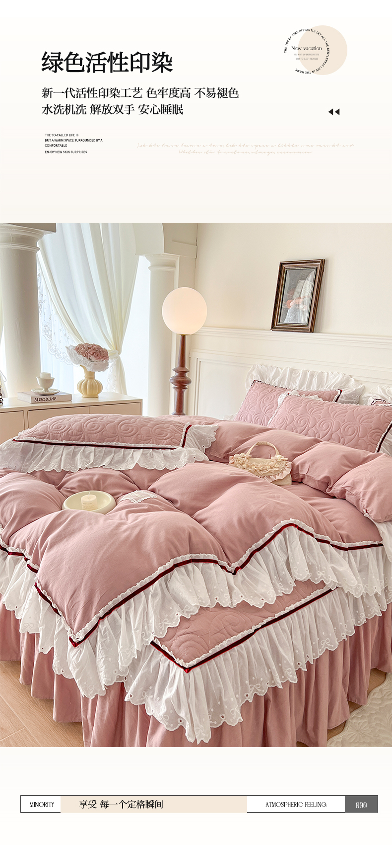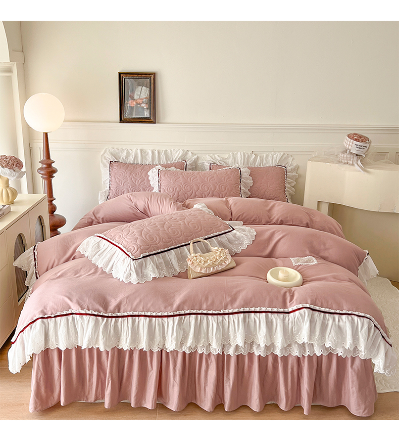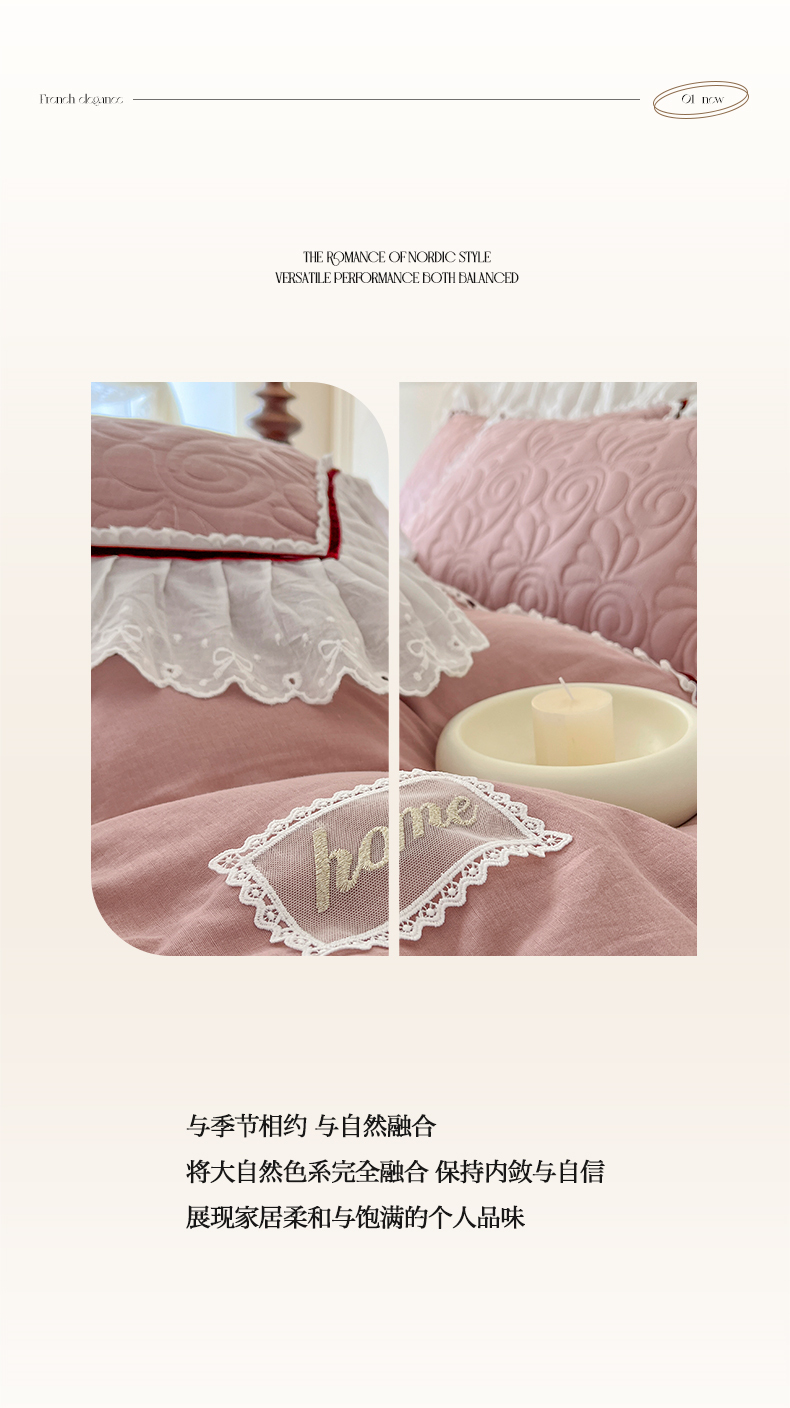 当前位置: 91家纺网 > 商品网购 > 床品套件 > 四件套 > 双层纱四件套 > 麒豆豆 2024新款全棉双层纱花边款爱丽丝系列四件套 凝烟粉