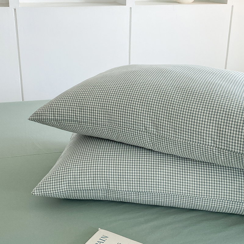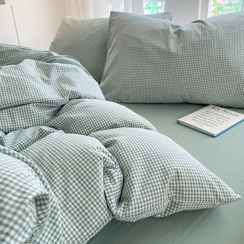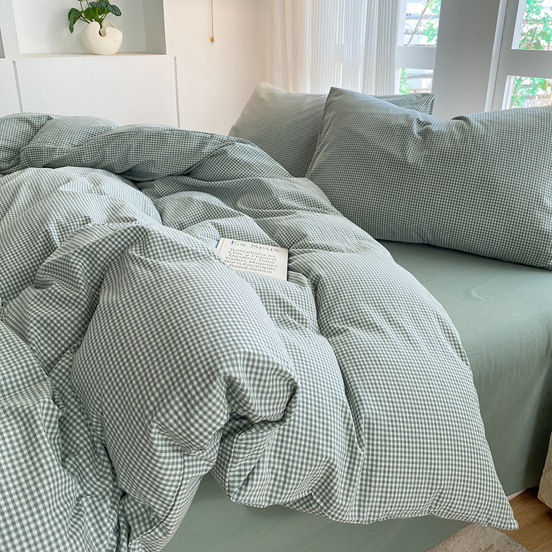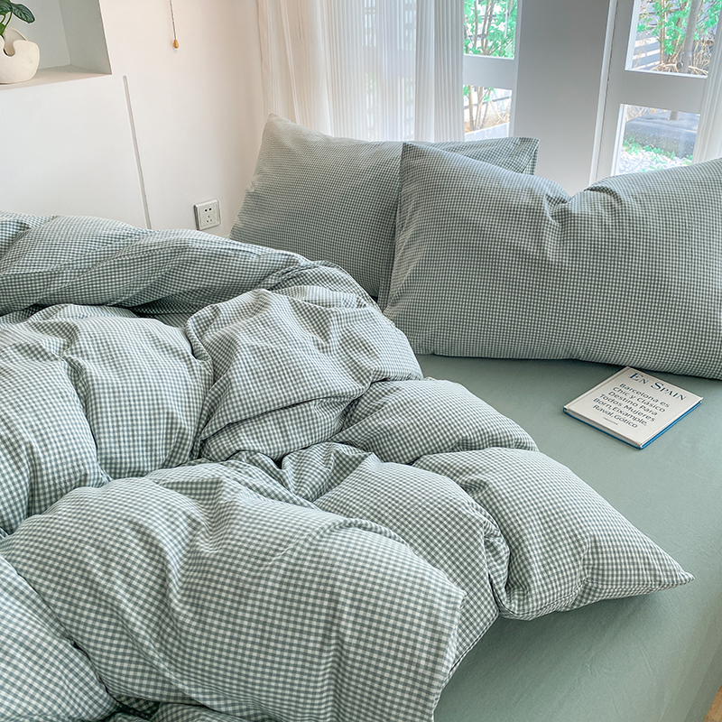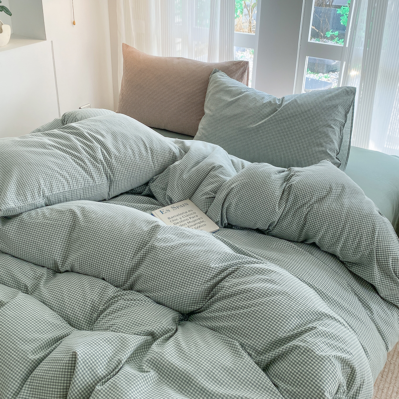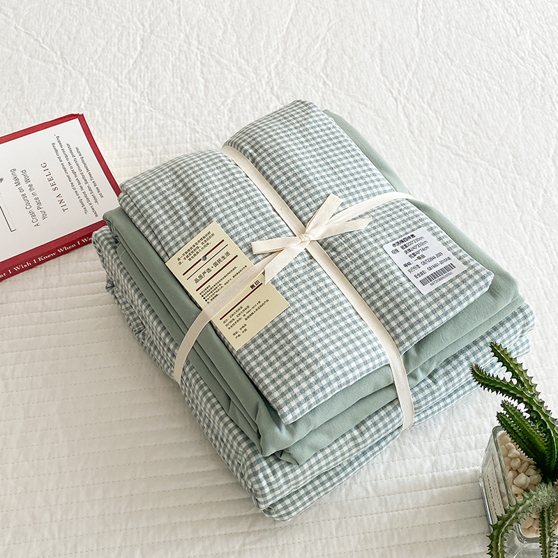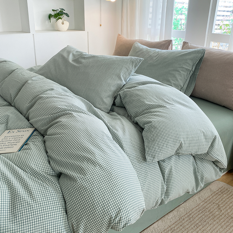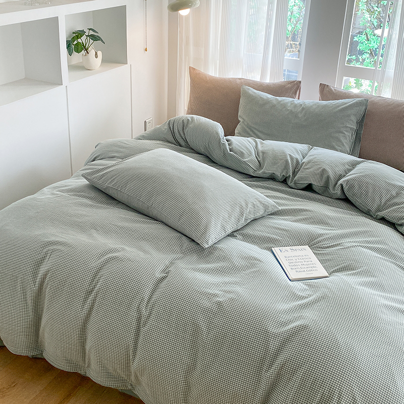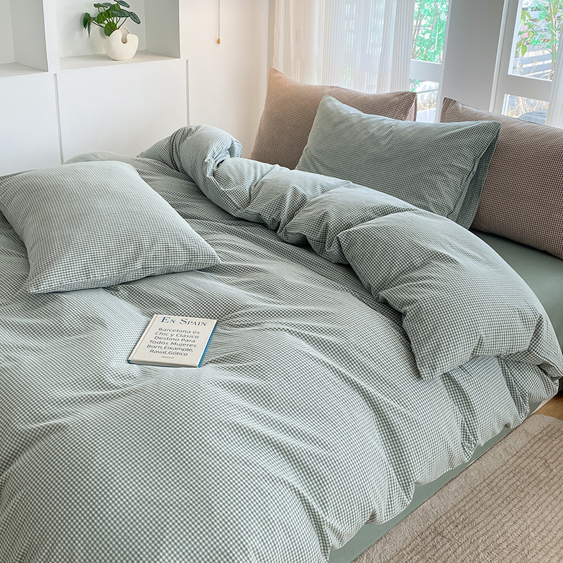尚品本色 2024新款简约风水洗棉格子条纹系列四件套绿密格
