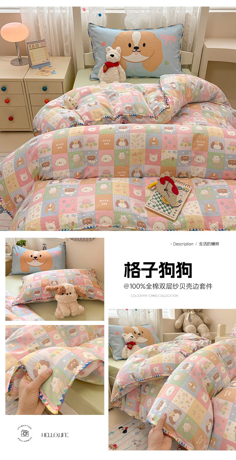 当前位置: 91家纺网 > 商品网购 > 床品套件 > 三件套 > 沐辰 2025新款全棉双层纱A类贝壳边学生床三件套 格子狗狗