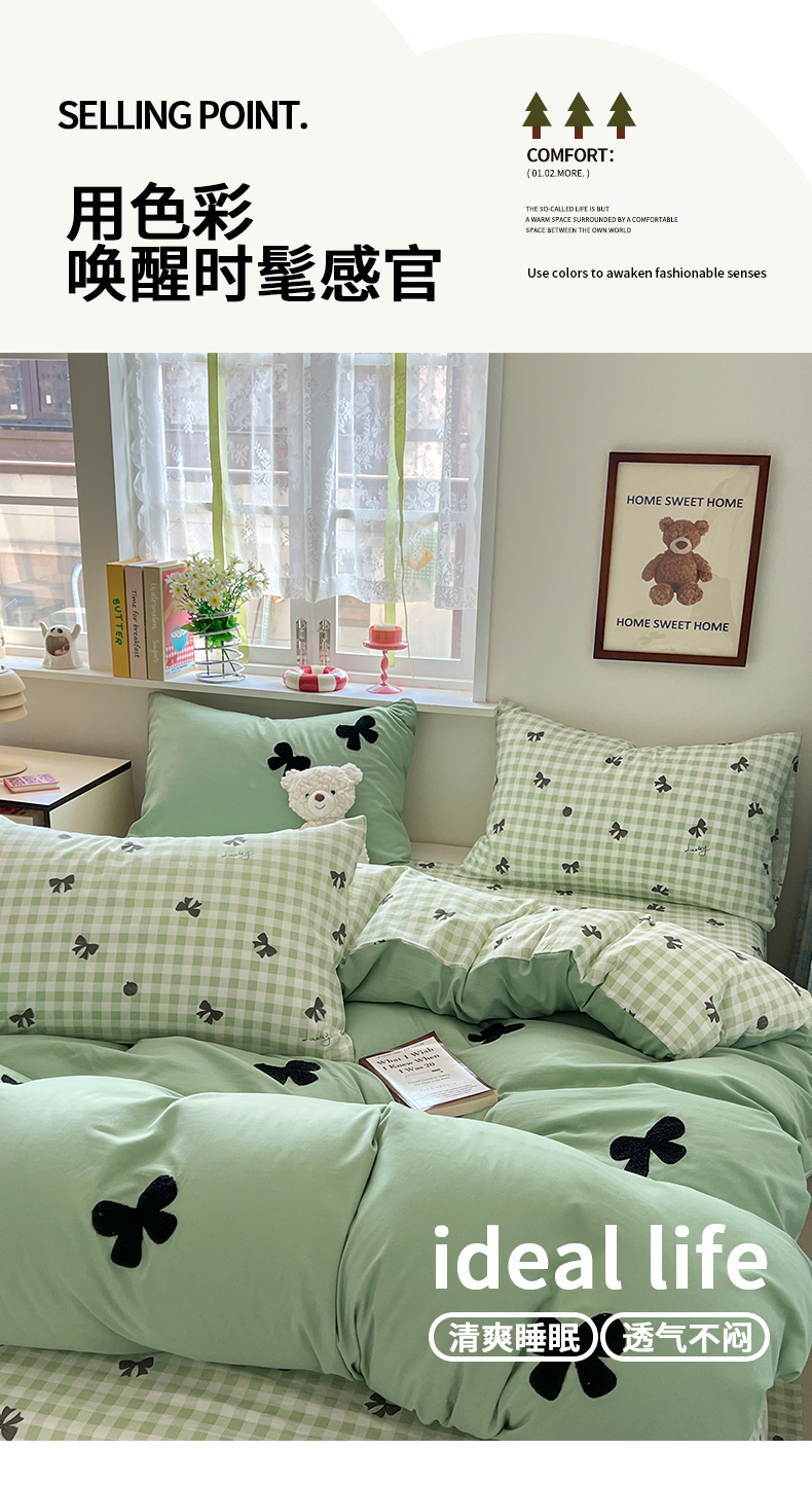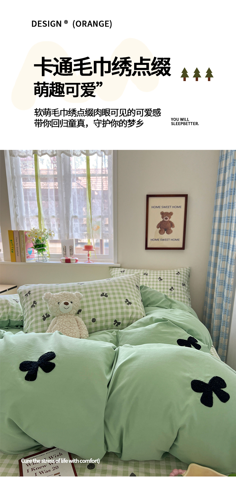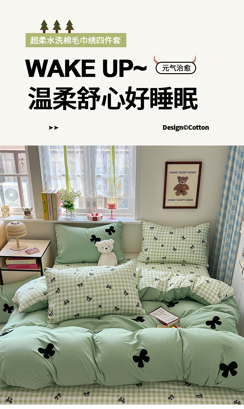 当前位置: 91家纺网 > 商品网购 > 床品套件 > 四件套 > 毛巾绣四件套 > 喜颜 2025新款超柔水洗糯糯棉爆款毛巾绣四件套学生宿舍三件套 蝴蝶结-香草绿