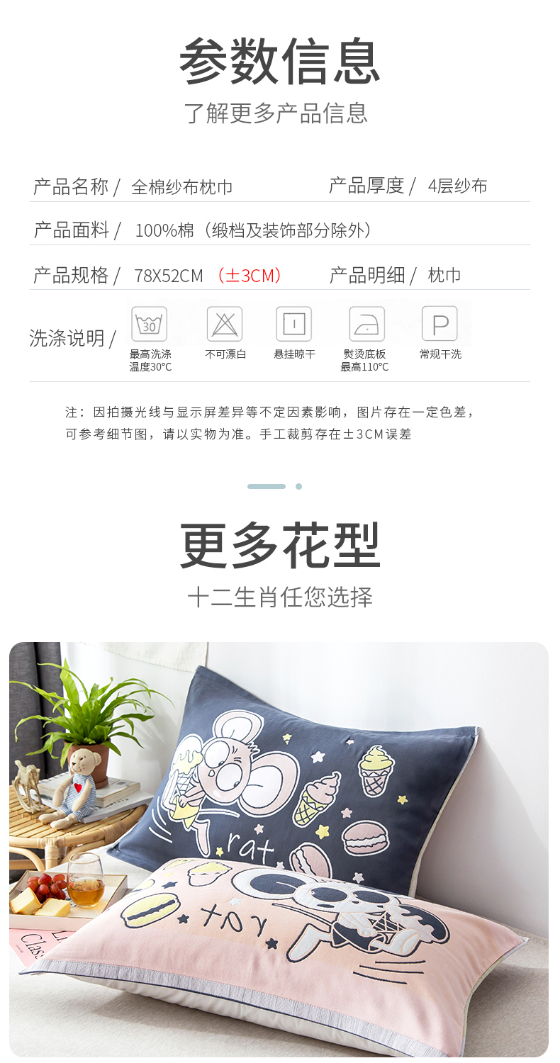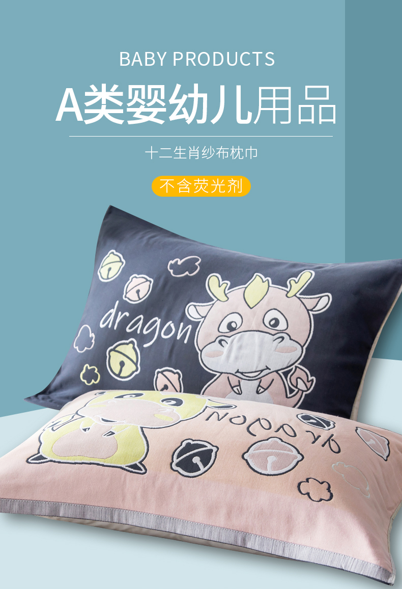 • 91家纺网 家纺一手货源 找家纺 朴尔家纺-毛巾被 2025新款儿童定位卡通大版花全棉纯棉四层纱布枕巾 牛小兽 53x78cm成人枕巾/对
