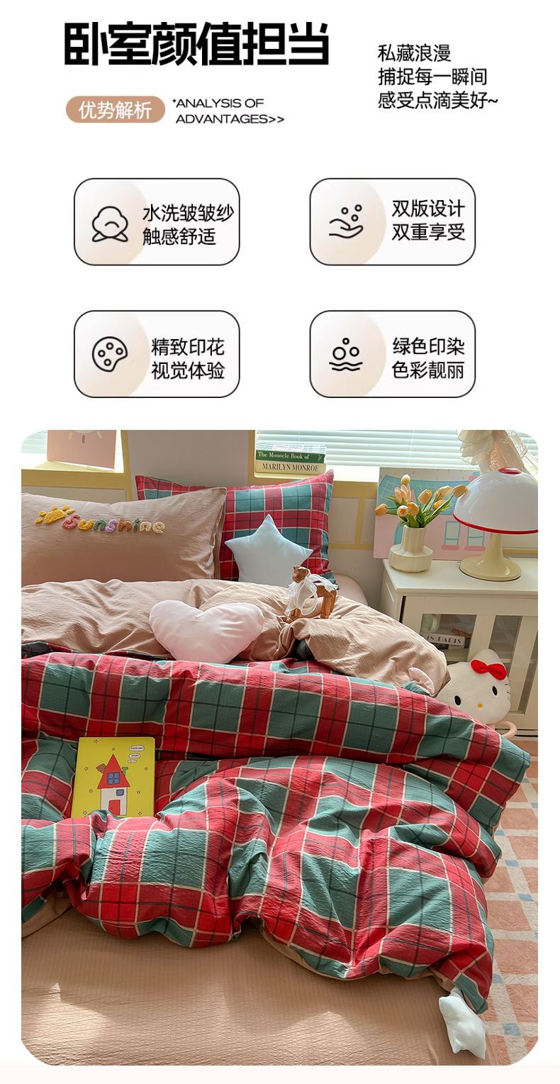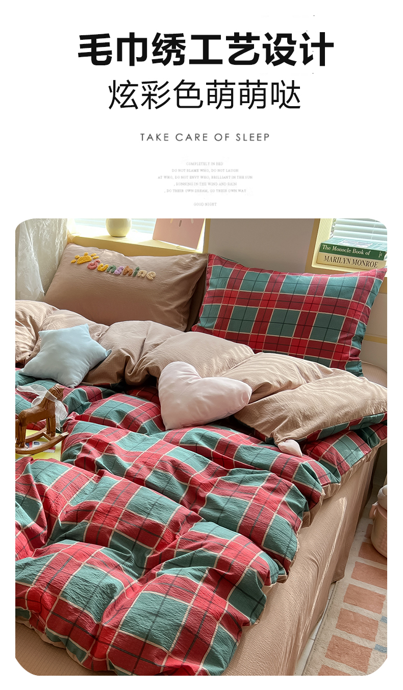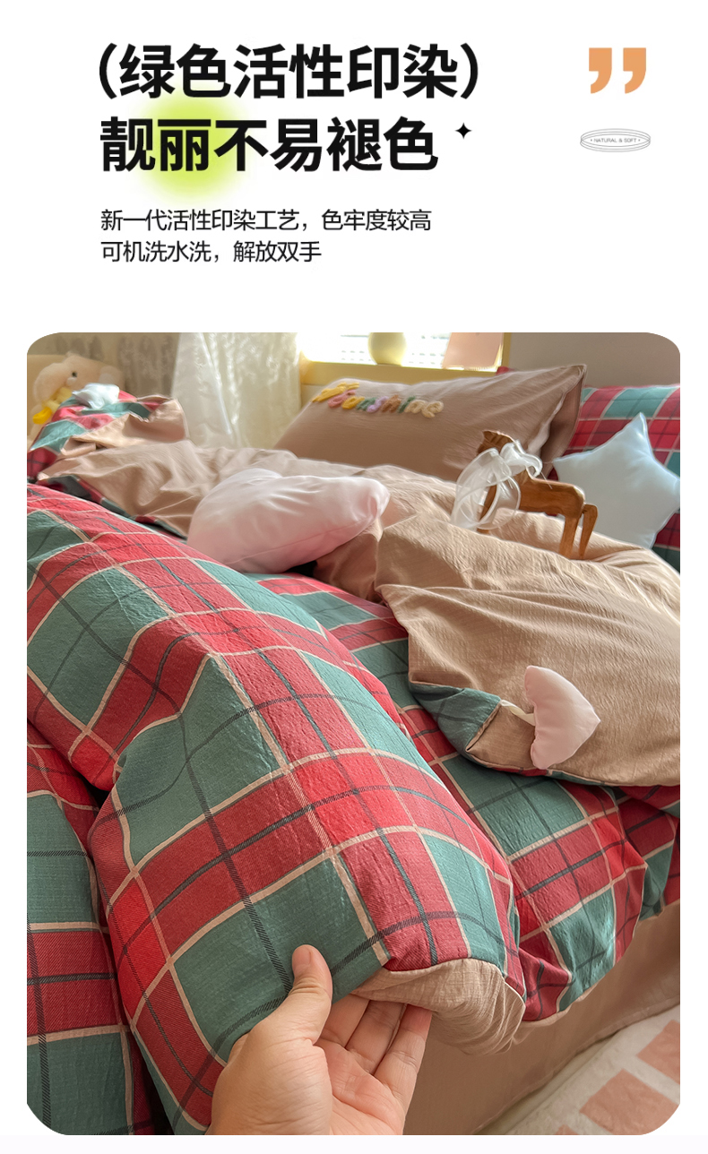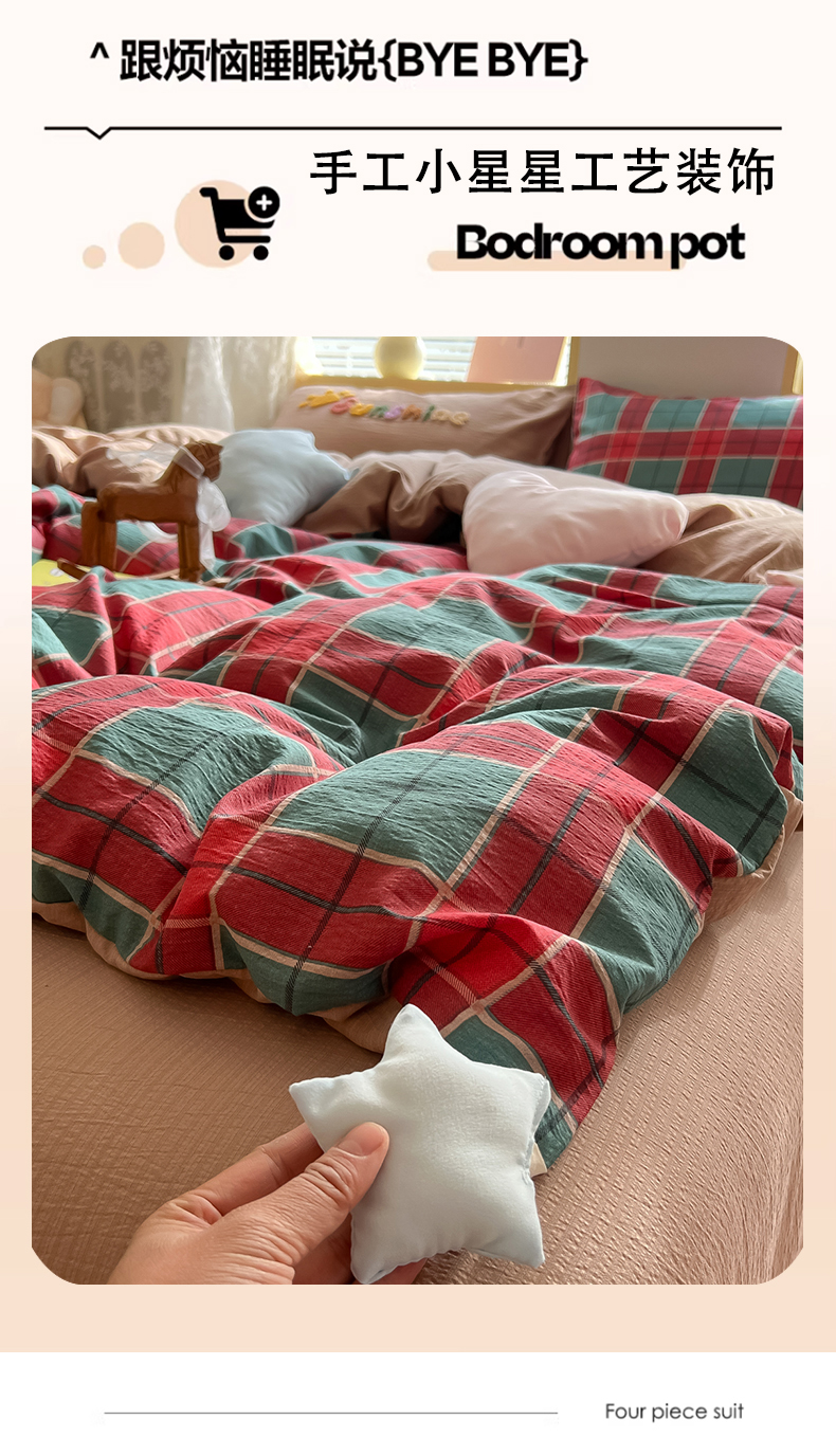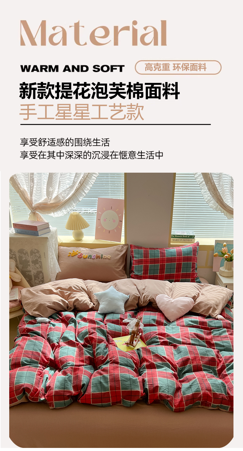 商品名称:子钦家纺 2026春夏新款提花泡芙棉可爱小清新手工爱心小星星系列床单床笠四件套-流星花园 流星花园-苏格兰格