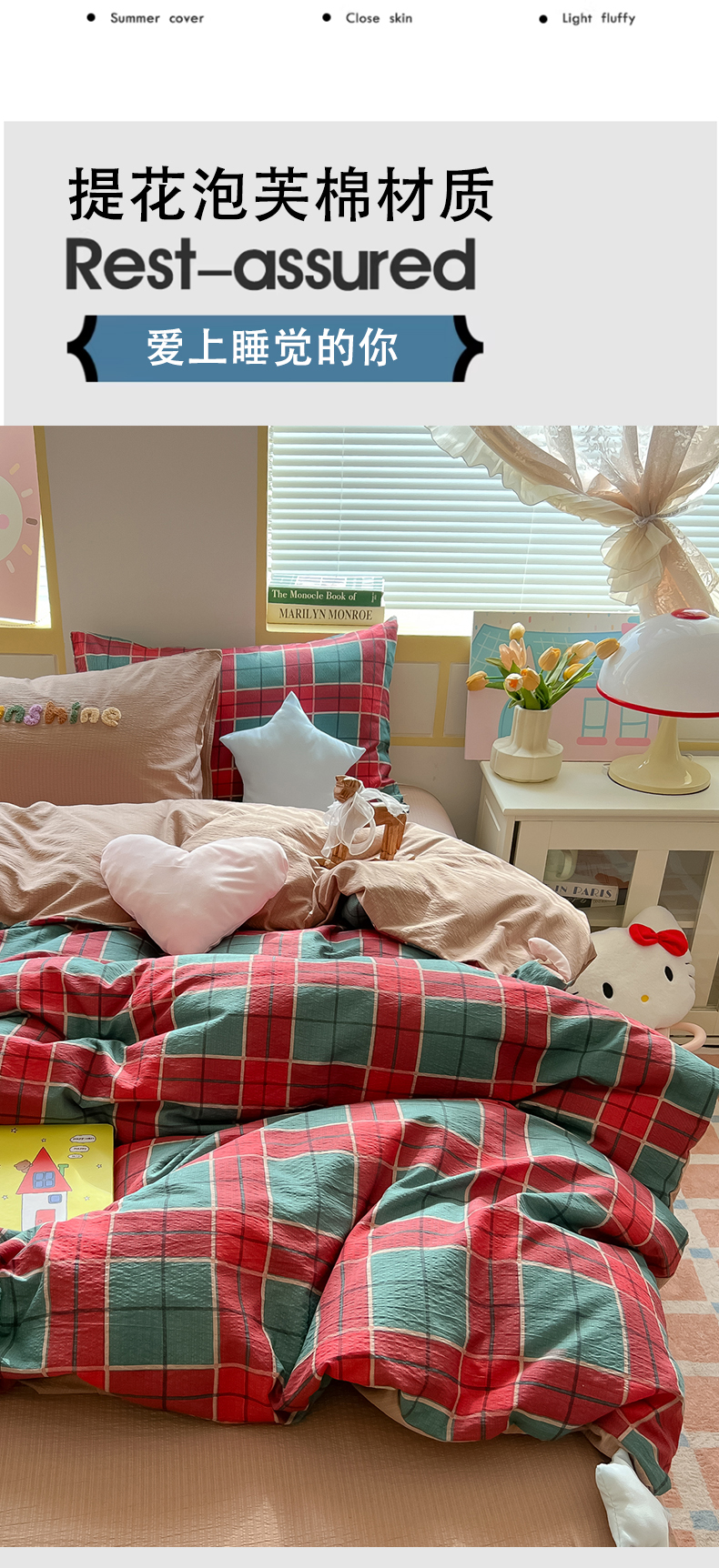 子钦家纺 2026春夏新款提花泡芙棉可爱小清新手工爱心小星星系列床单床笠四件套-流星花园 流星花园-苏格兰格