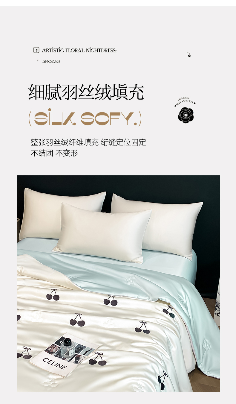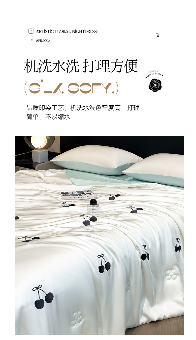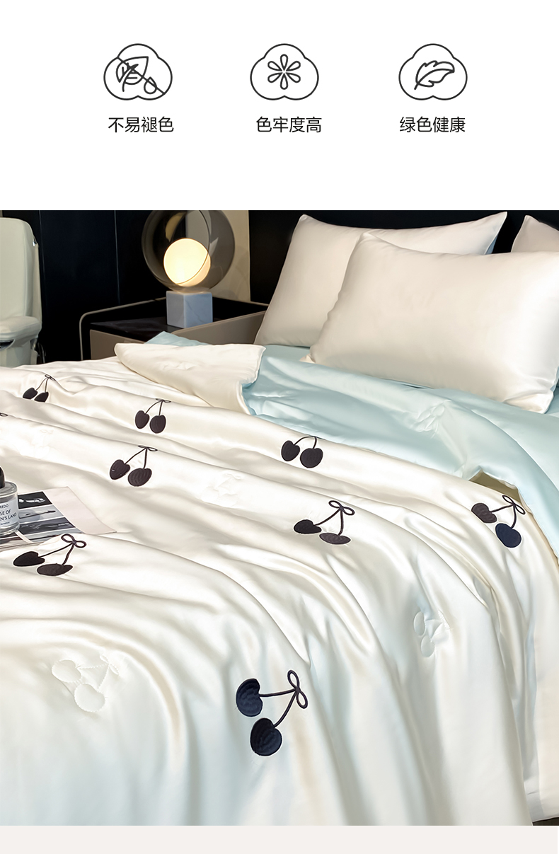 • 91家纺网 家纺一手货源 找家纺 无界 2026新款水洗真丝夏被-散点-贝尔 贝尔 元气白桃+风铃蓝(樱桃)
