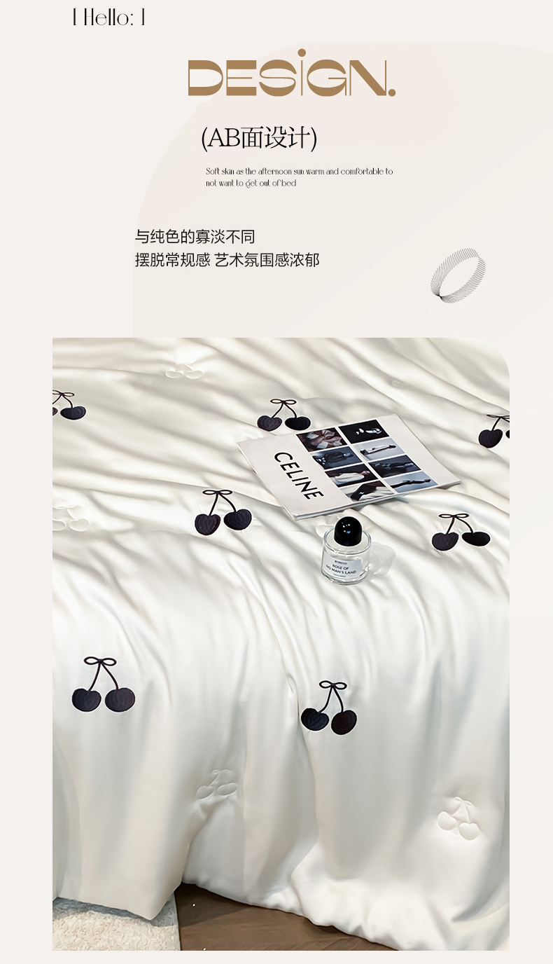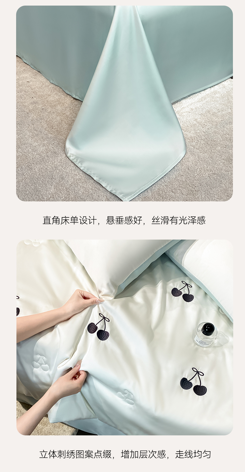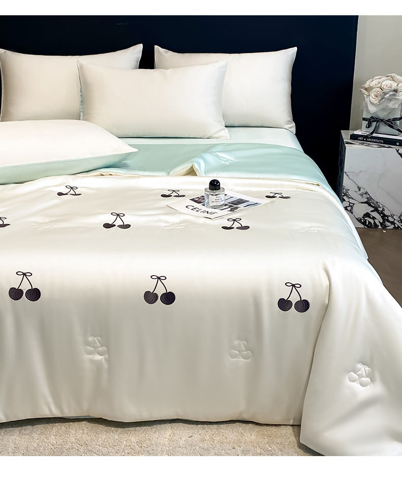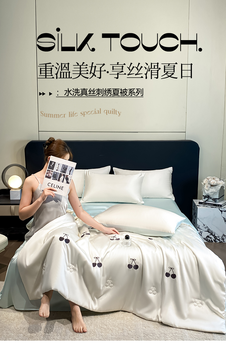 • 91家纺网 家纺一手货源 找家纺 无界 2026新款水洗真丝夏被-散点-贝尔 贝尔 元气白桃+风铃蓝(樱桃)
