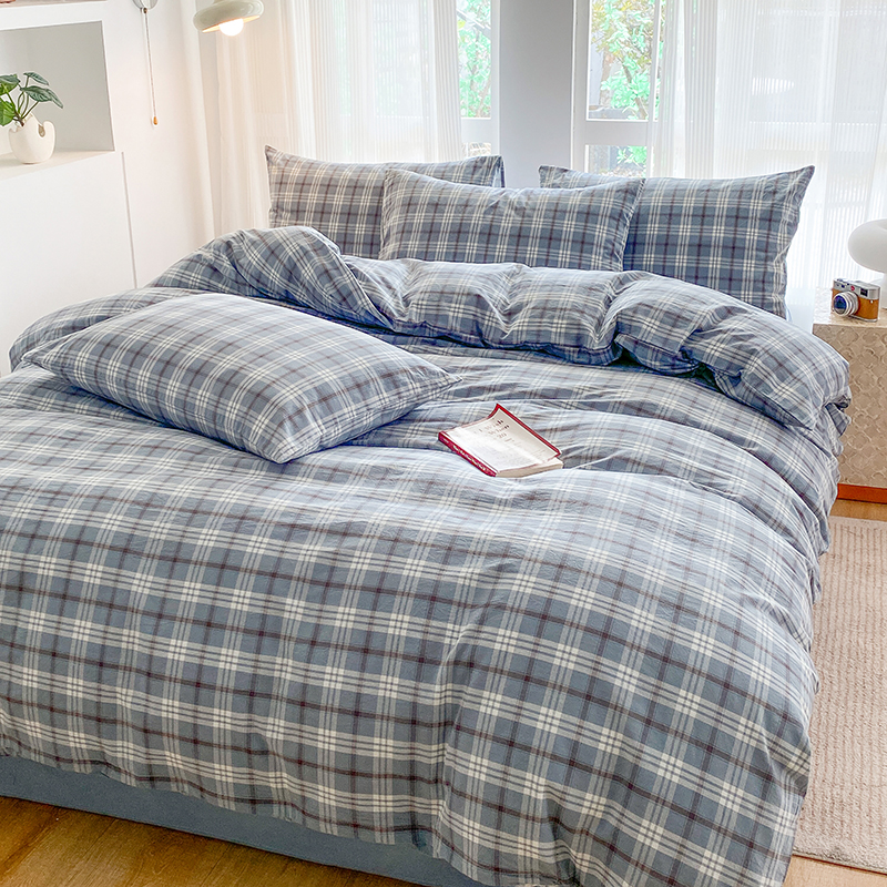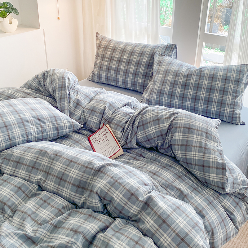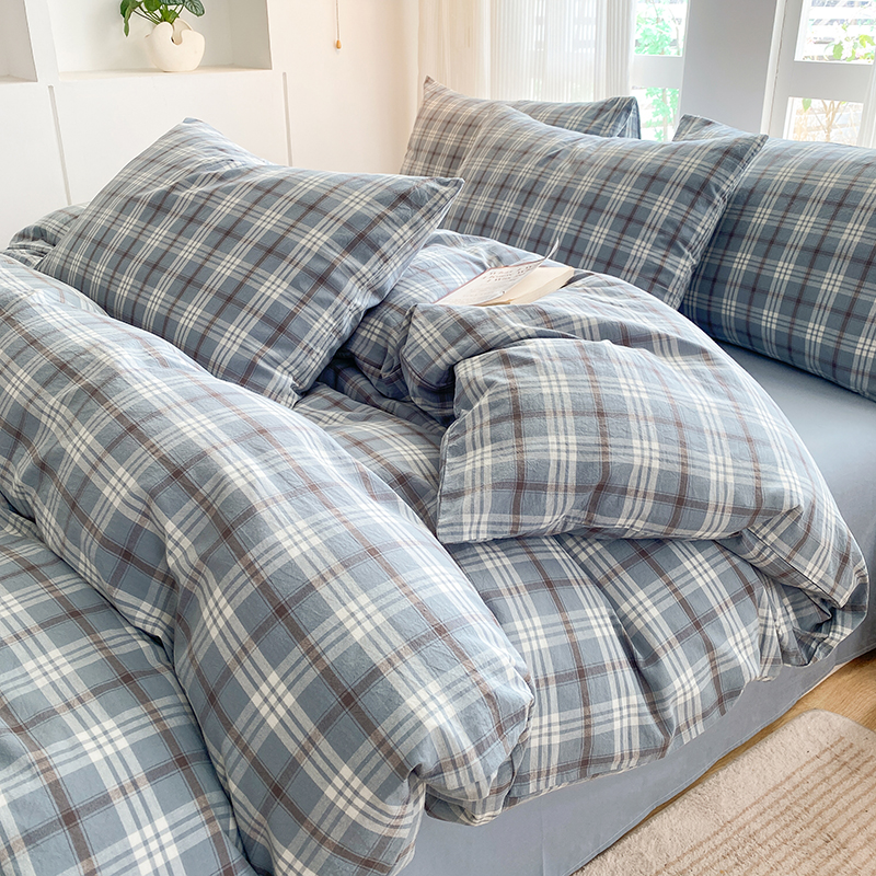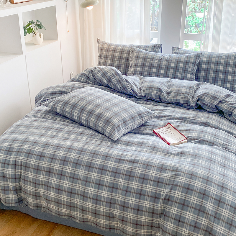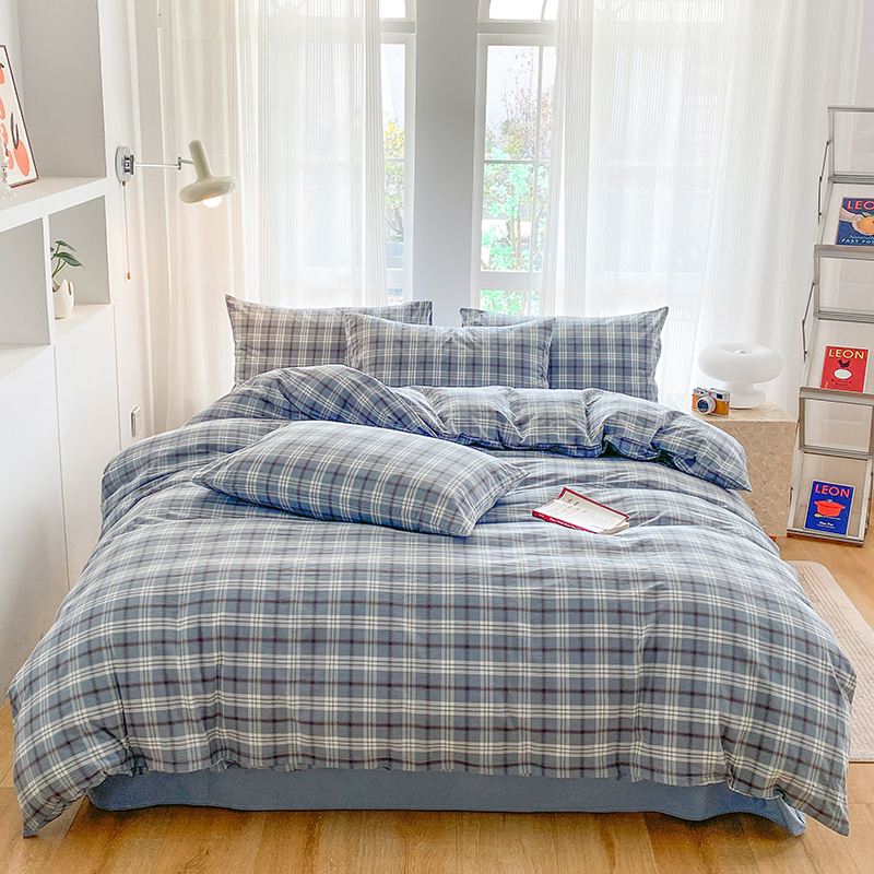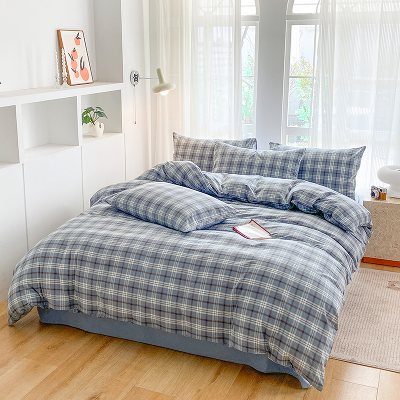 尚品本色 2024新款简约风水洗棉格子条纹系列四件套简爱-蓝