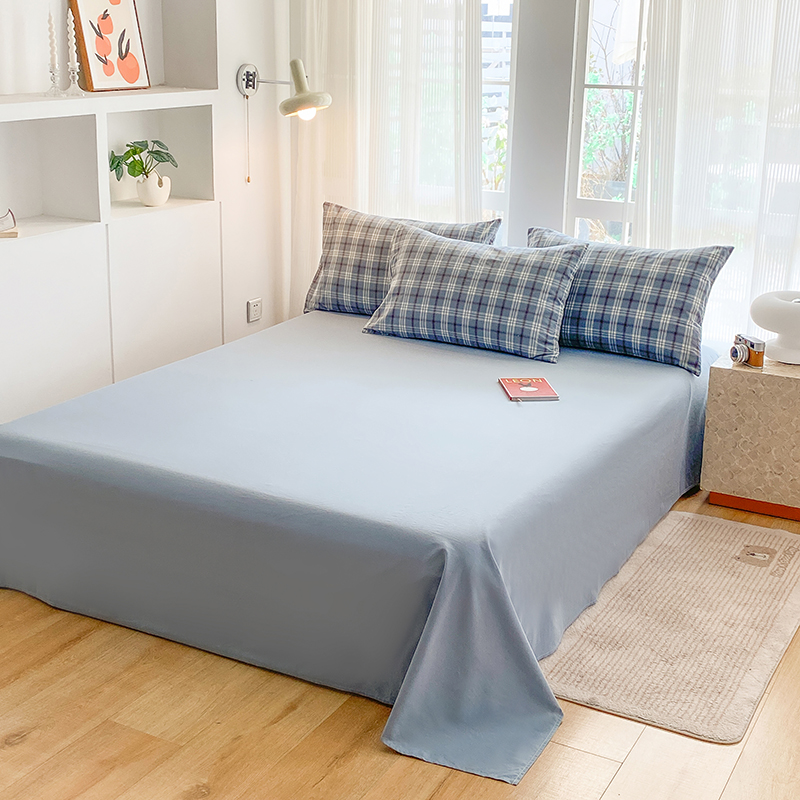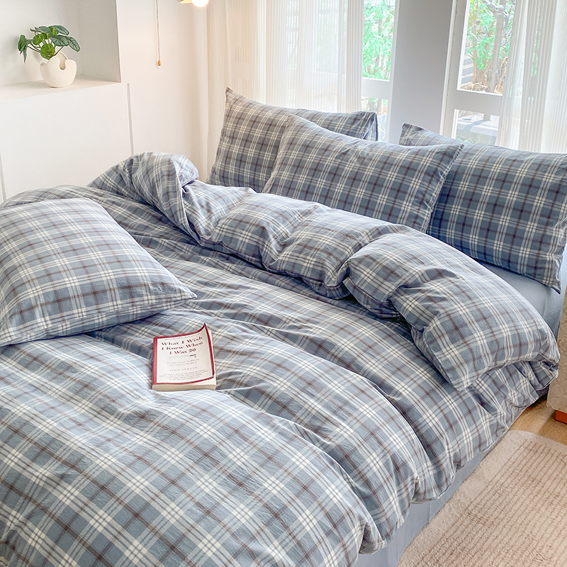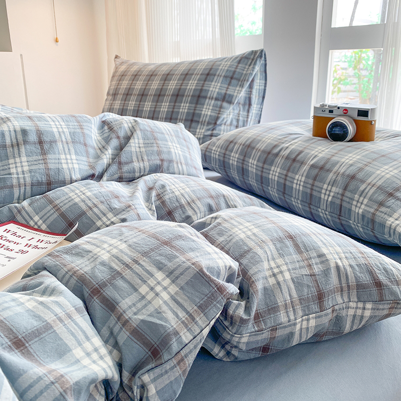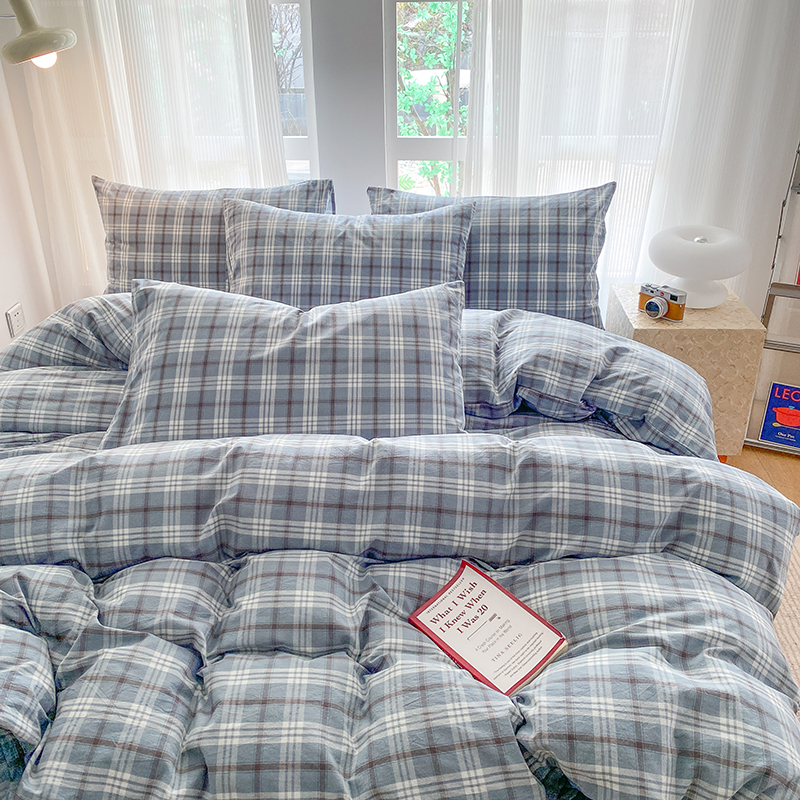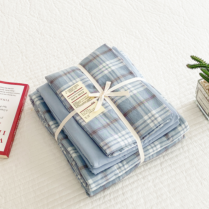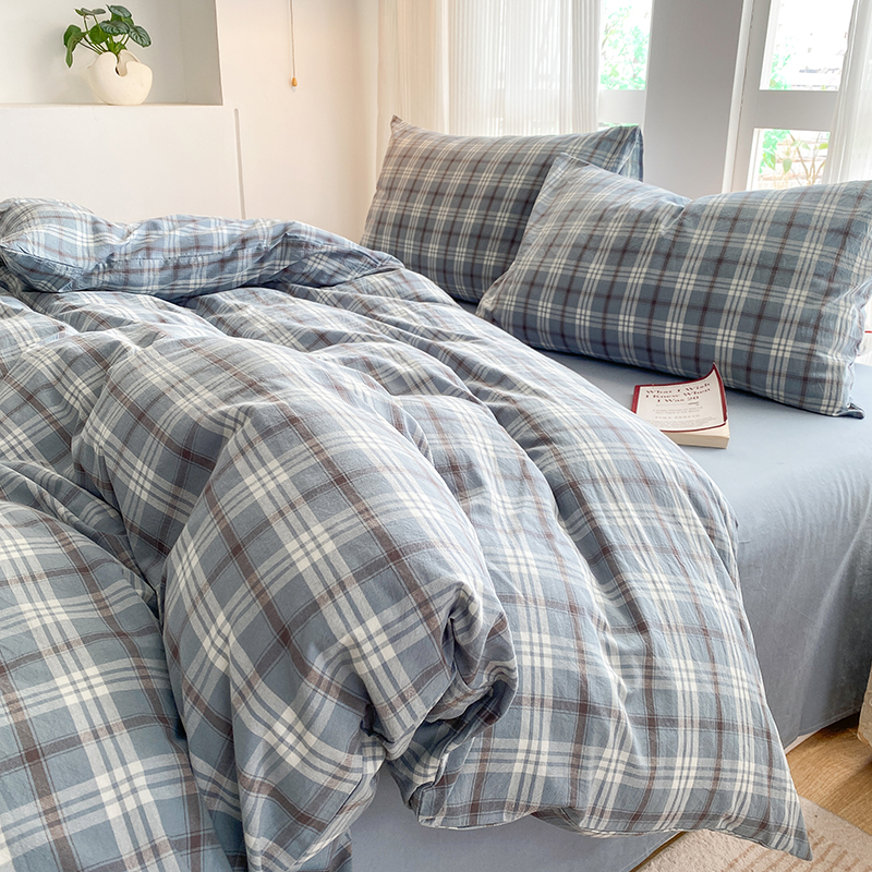 尚品本色 2024新款简约风水洗棉格子条纹系列四件套简爱-蓝