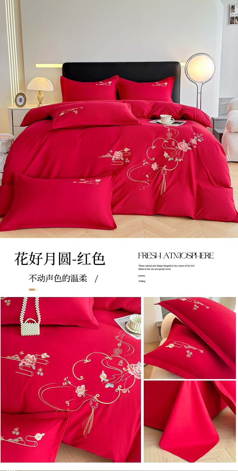 商品名称:帝菲妮 2025新款国潮风高克重超柔水洗棉针织棉糯小棉带质检报告刺绣四件套--花好月圆 花好月圆-红色