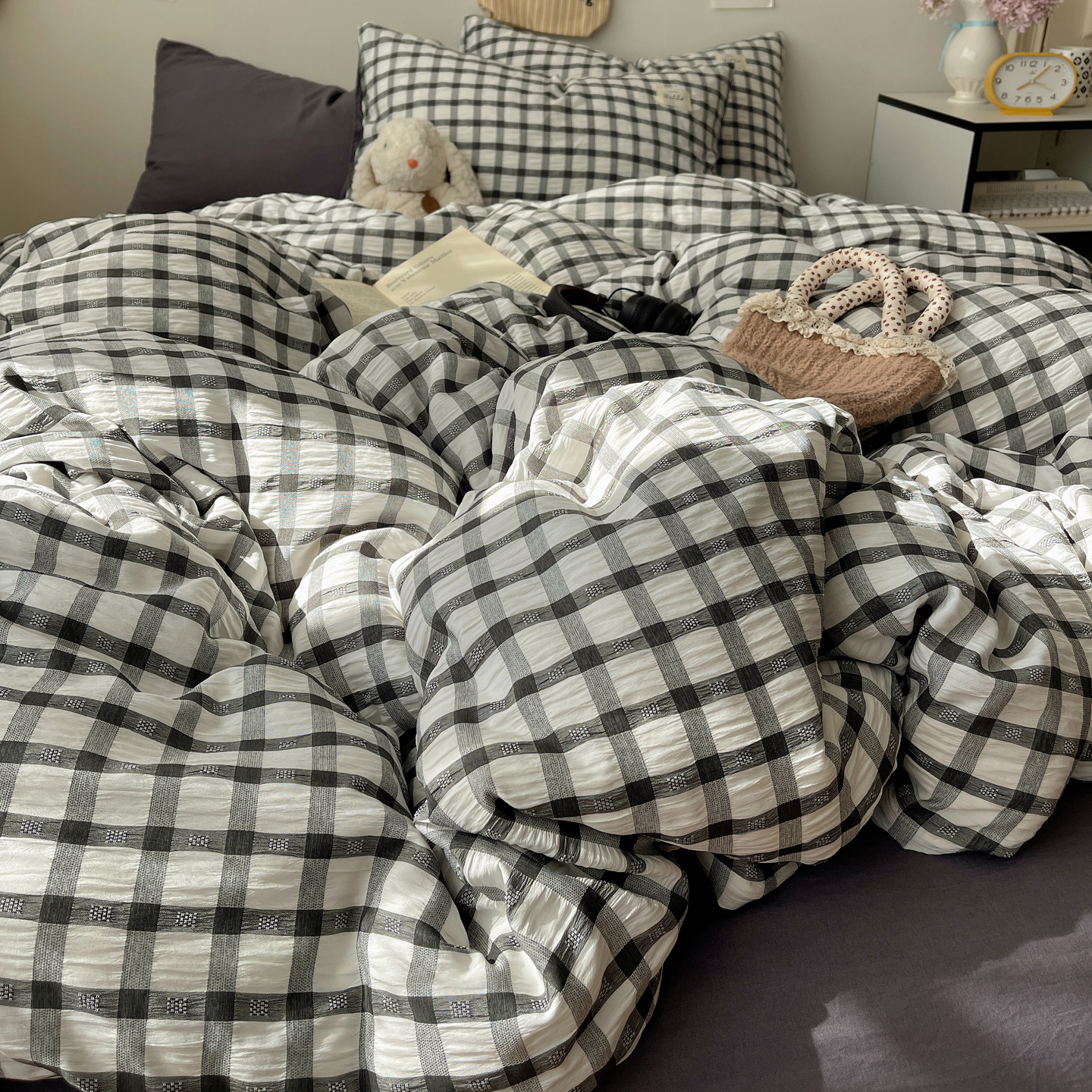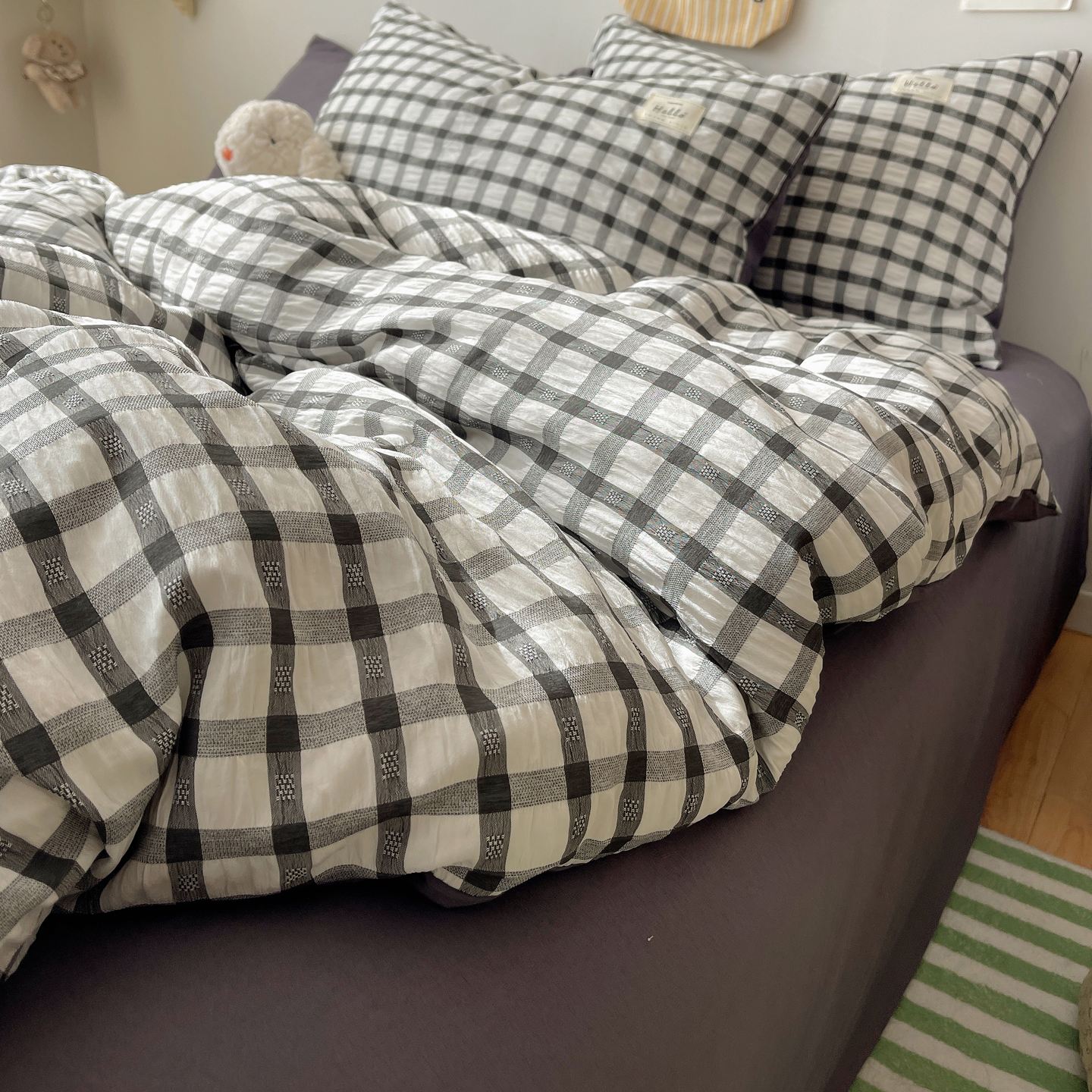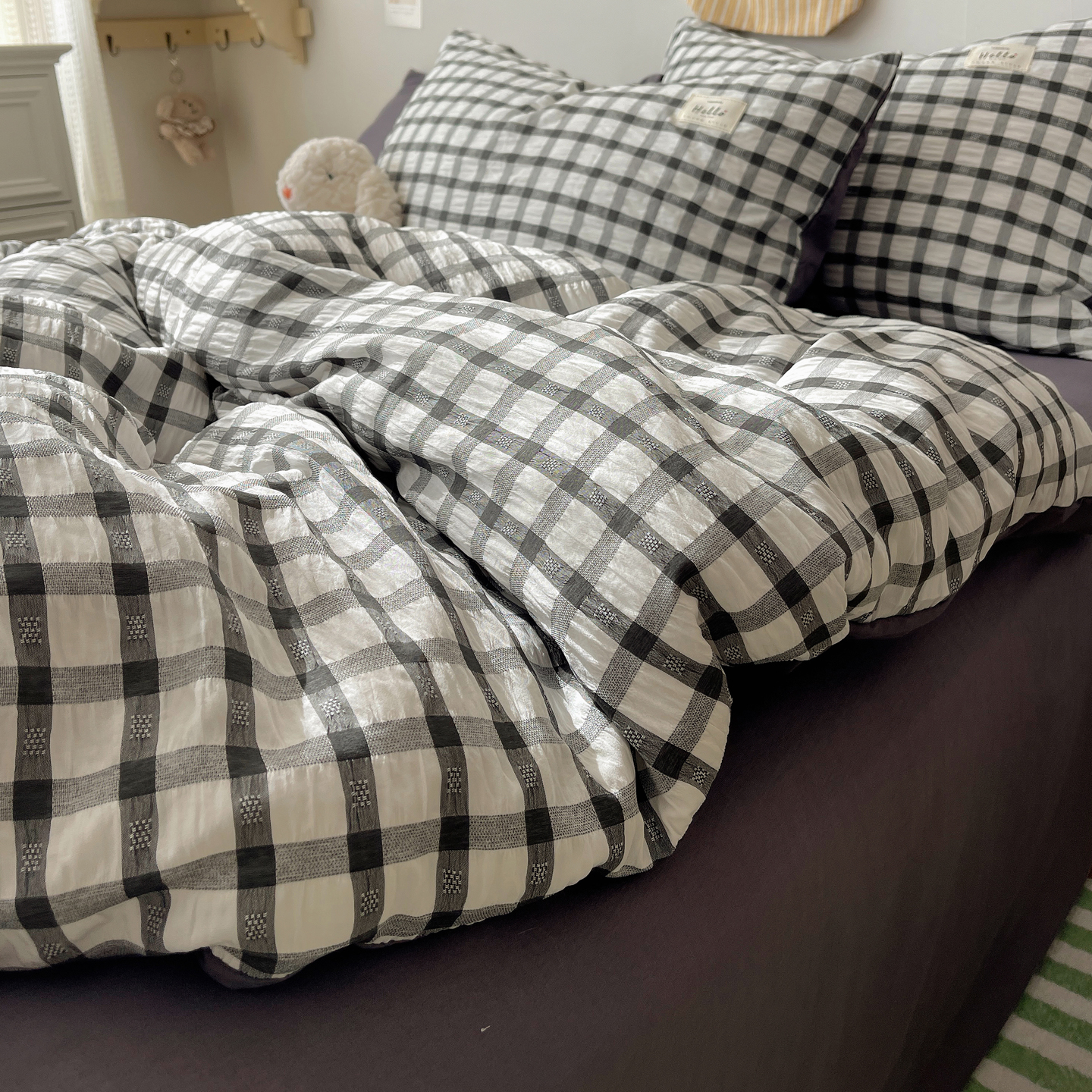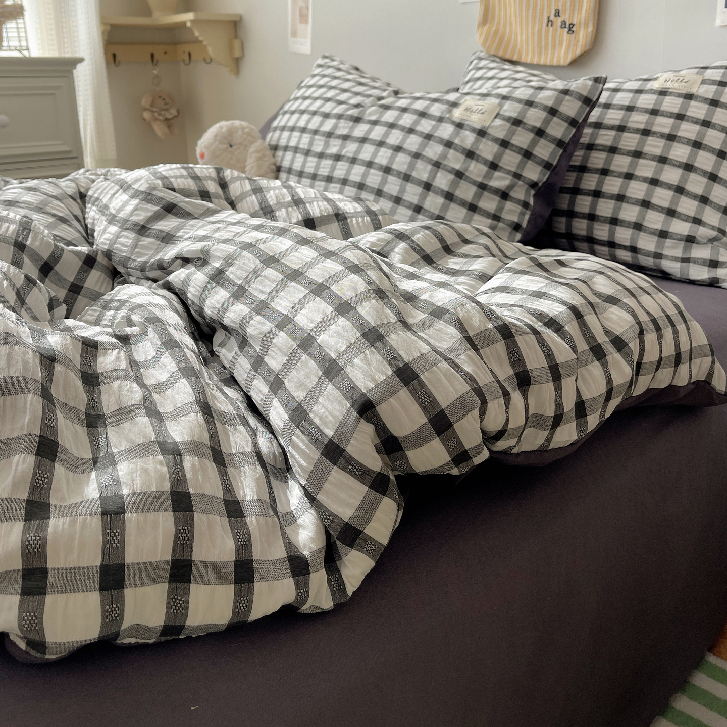 当前位置: 91家纺网 > 商品网购 > 床品套件 > 四件套 > 双层纱四件套 > 顾里2025新款韩系格子阳离子泡泡纱四件套-第二组 经典黑格