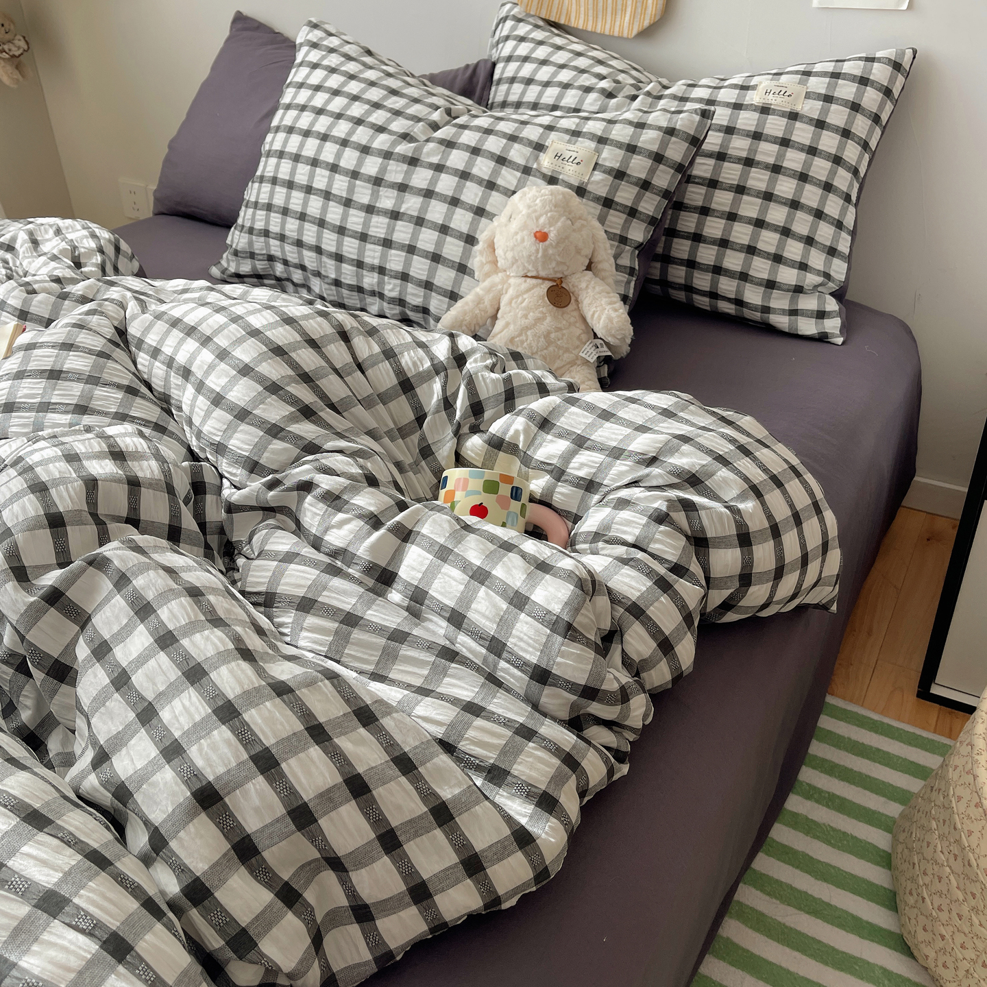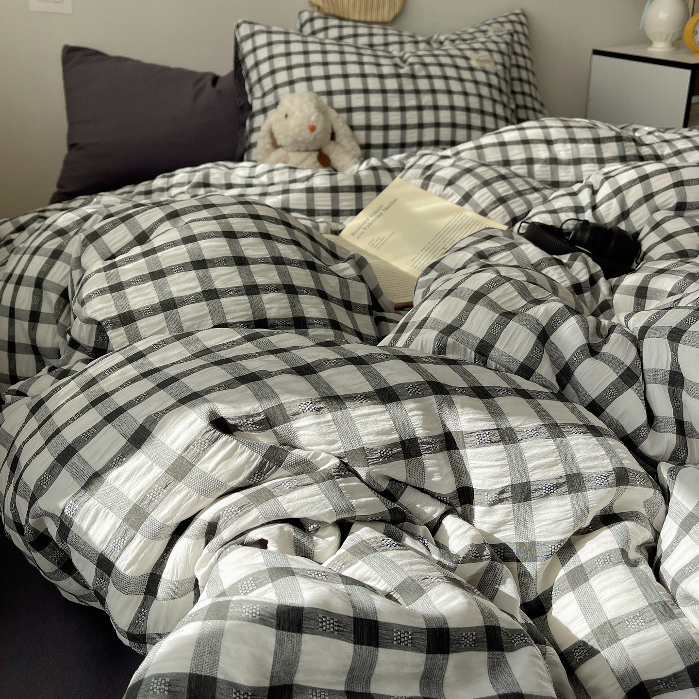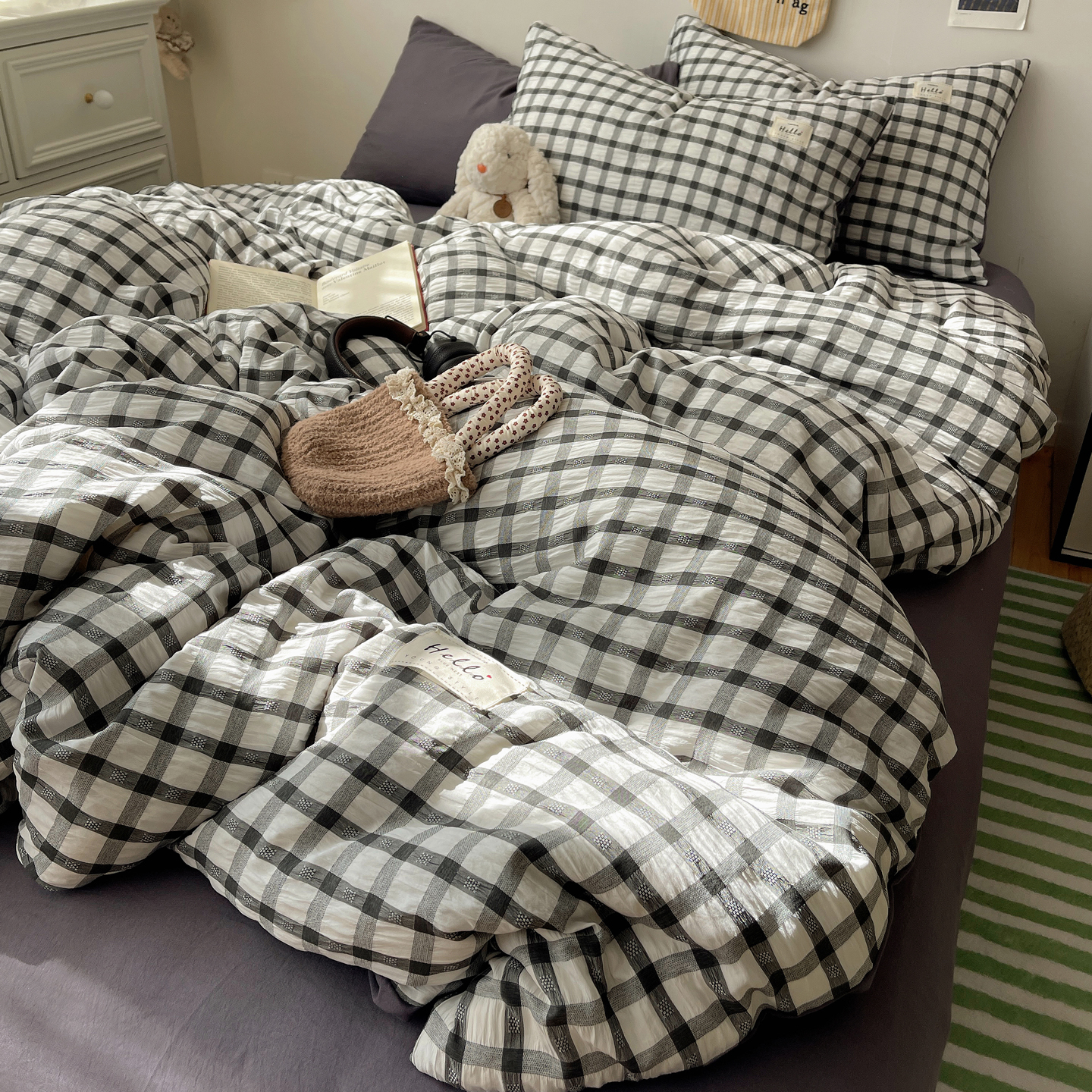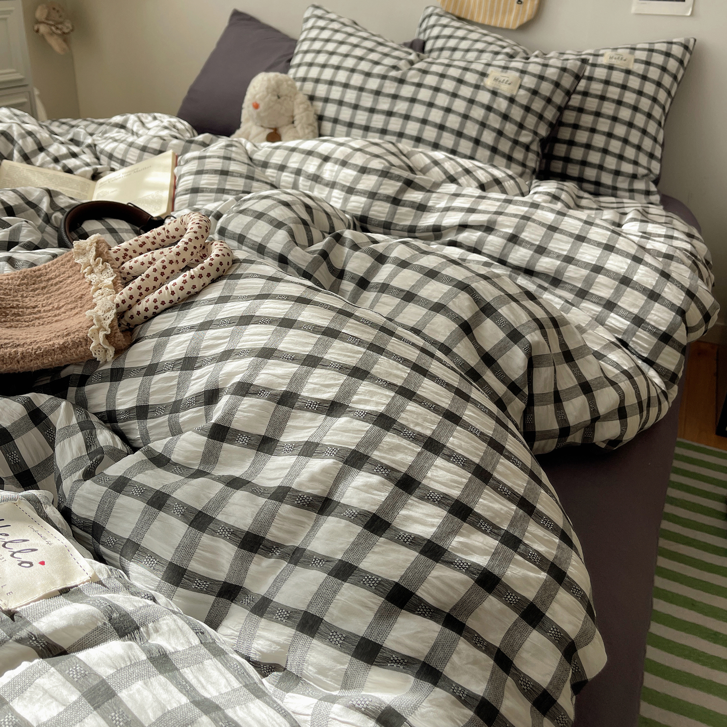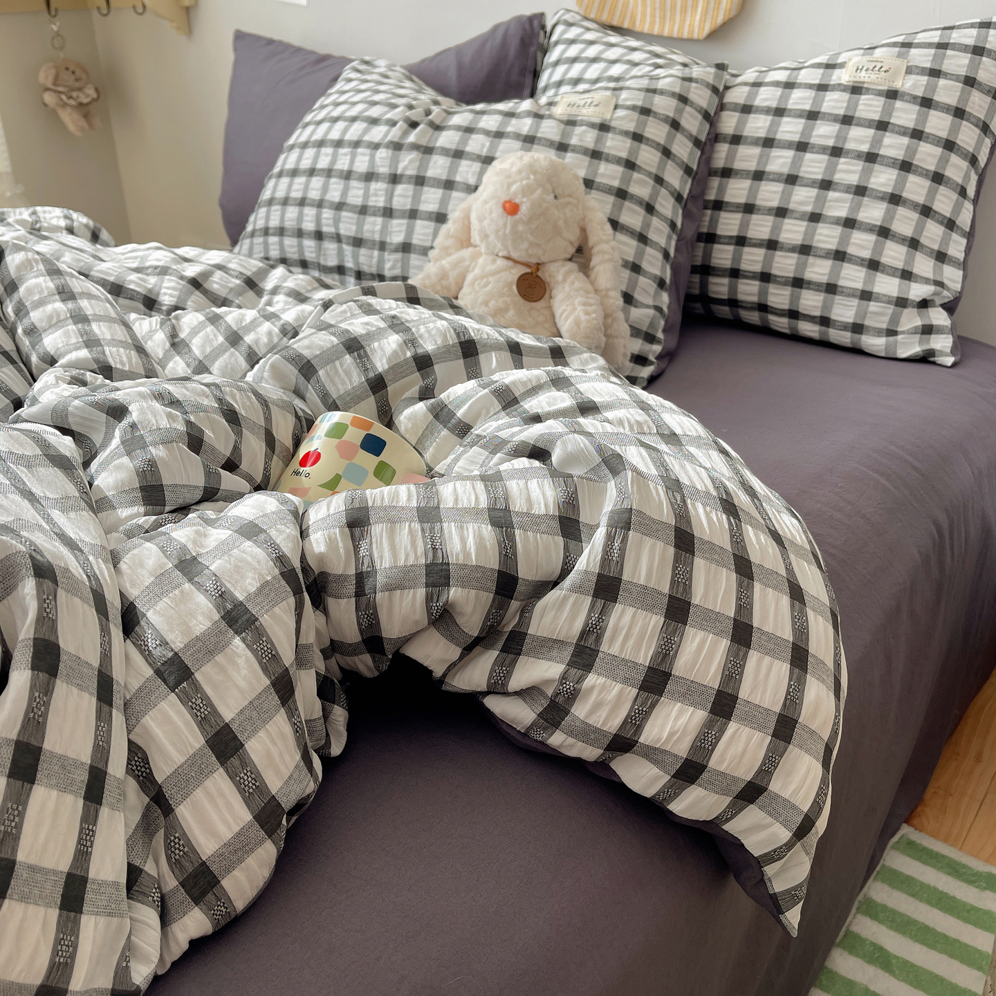 当前位置: 91家纺网 > 商品网购 > 床品套件 > 四件套 > 双层纱四件套 > 顾里2025新款韩系格子阳离子泡泡纱四件套-第二组 经典黑格