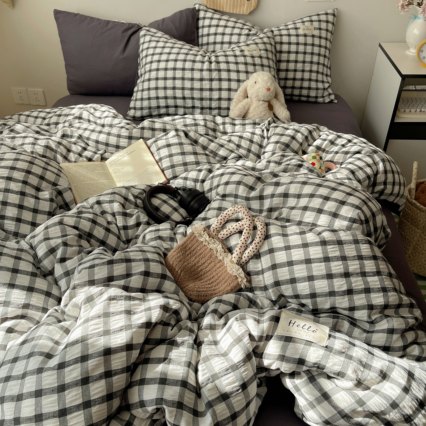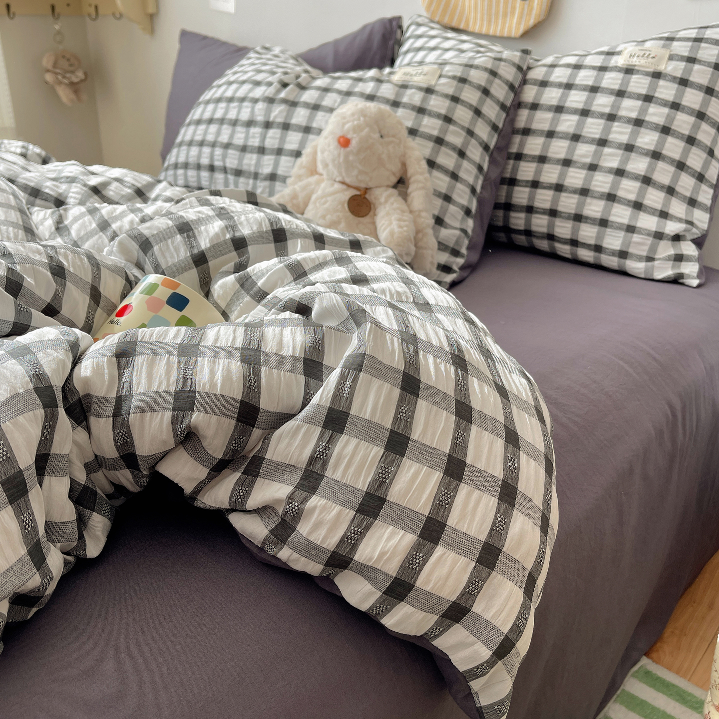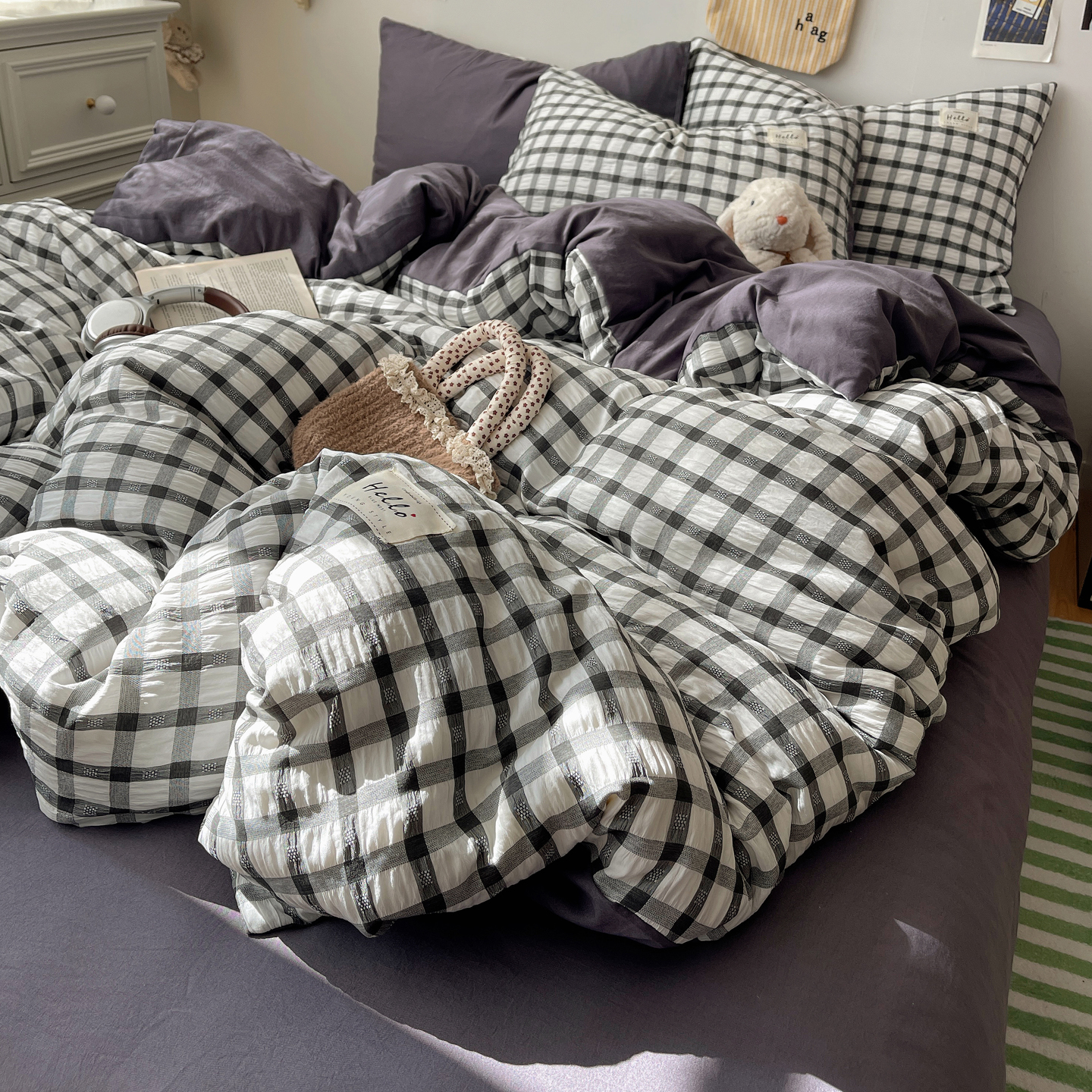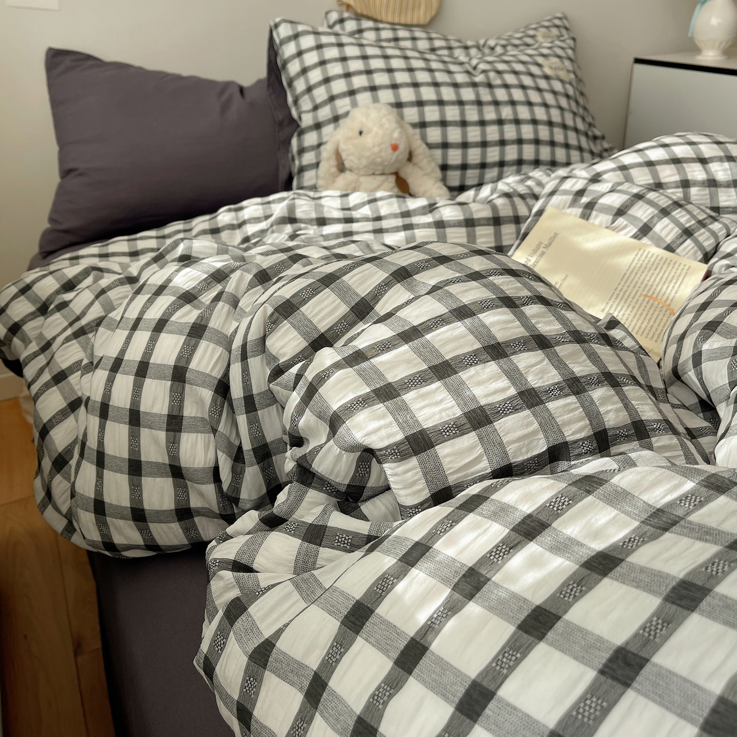 当前位置: 91家纺网 > 商品网购 > 床品套件 > 四件套 > 双层纱四件套 > 顾里2025新款韩系格子阳离子泡泡纱四件套-第二组 经典黑格