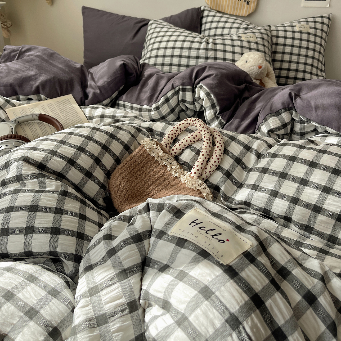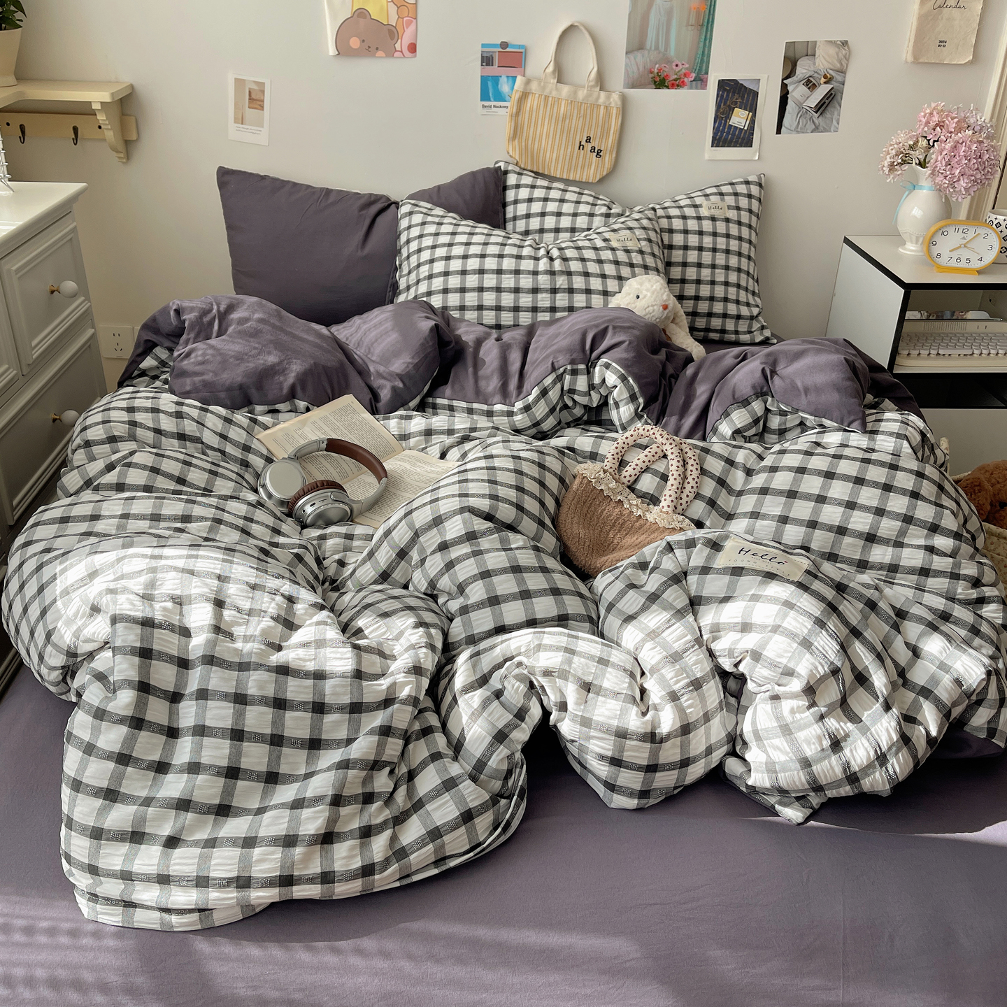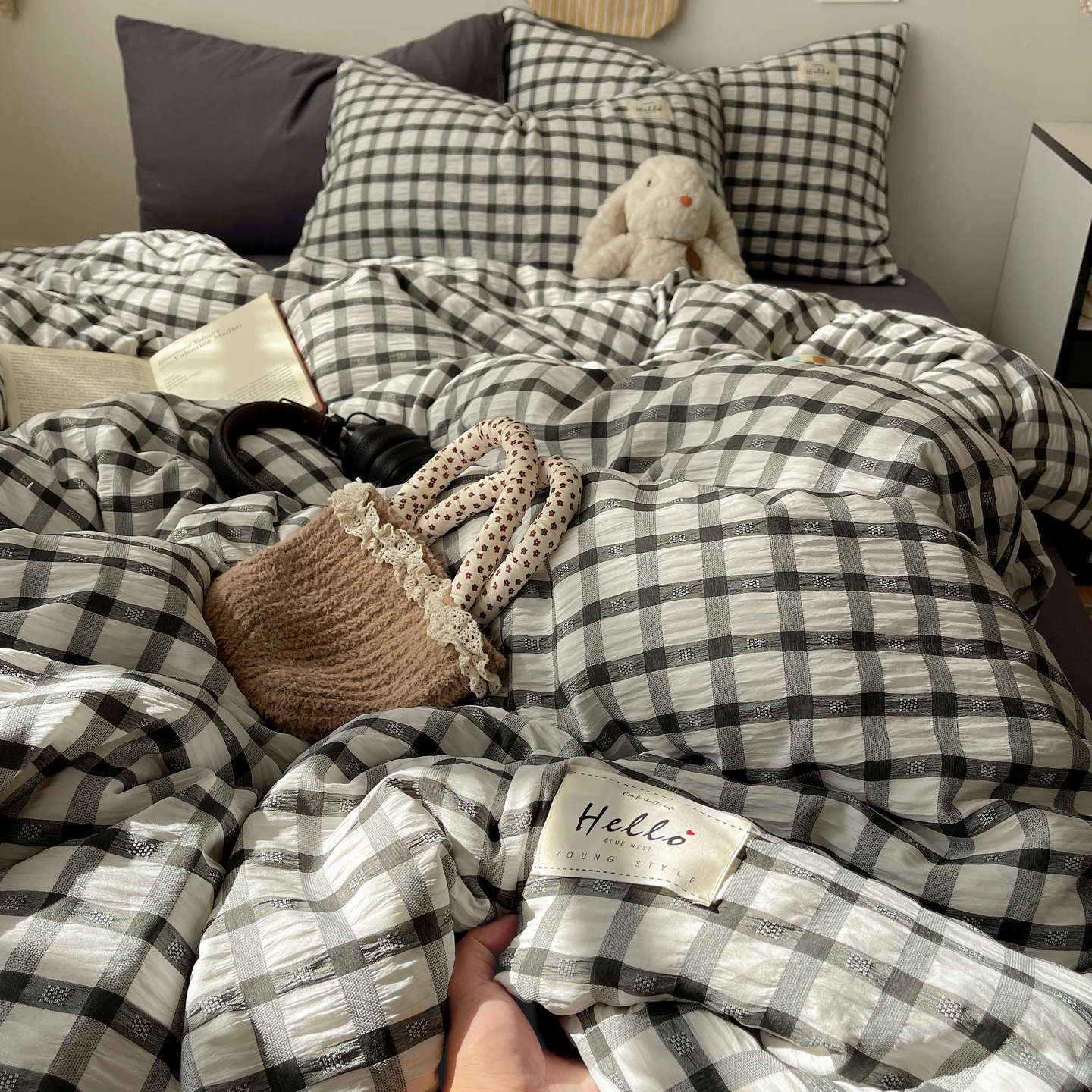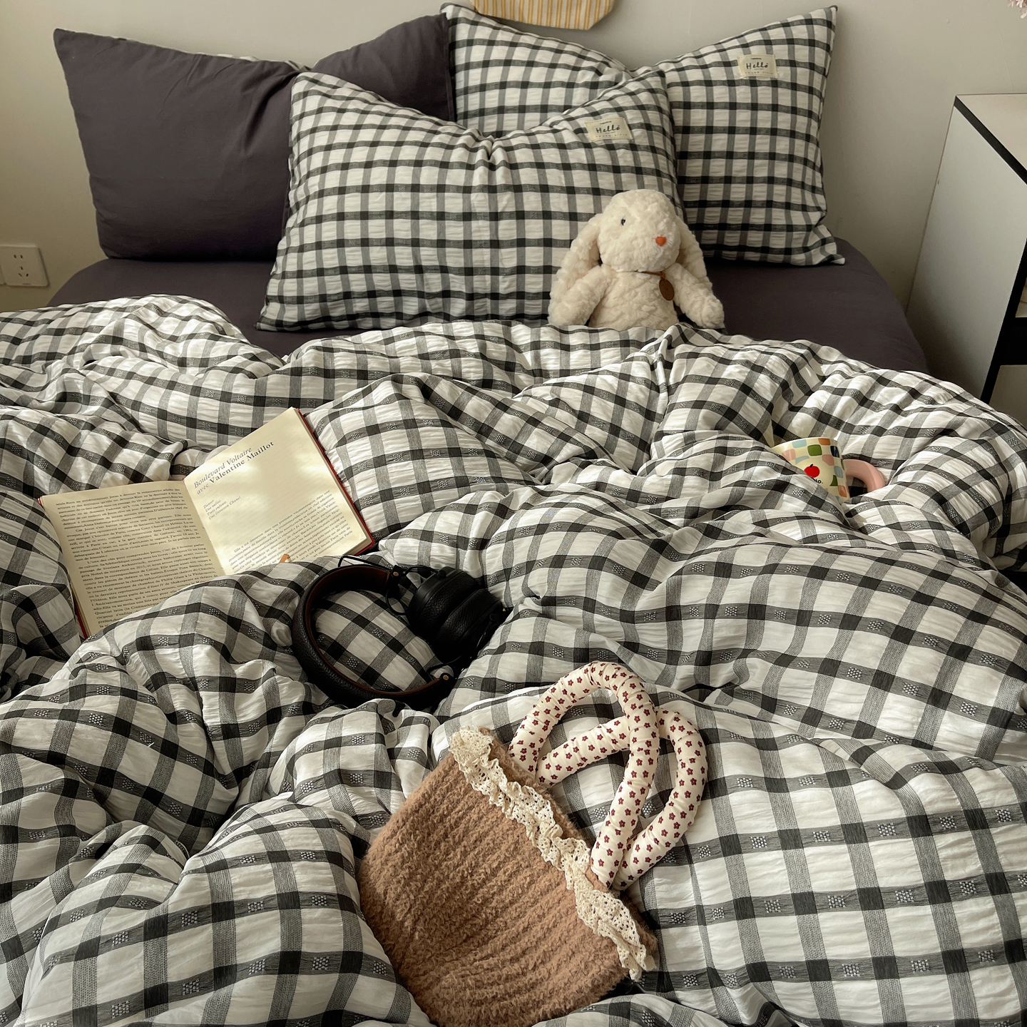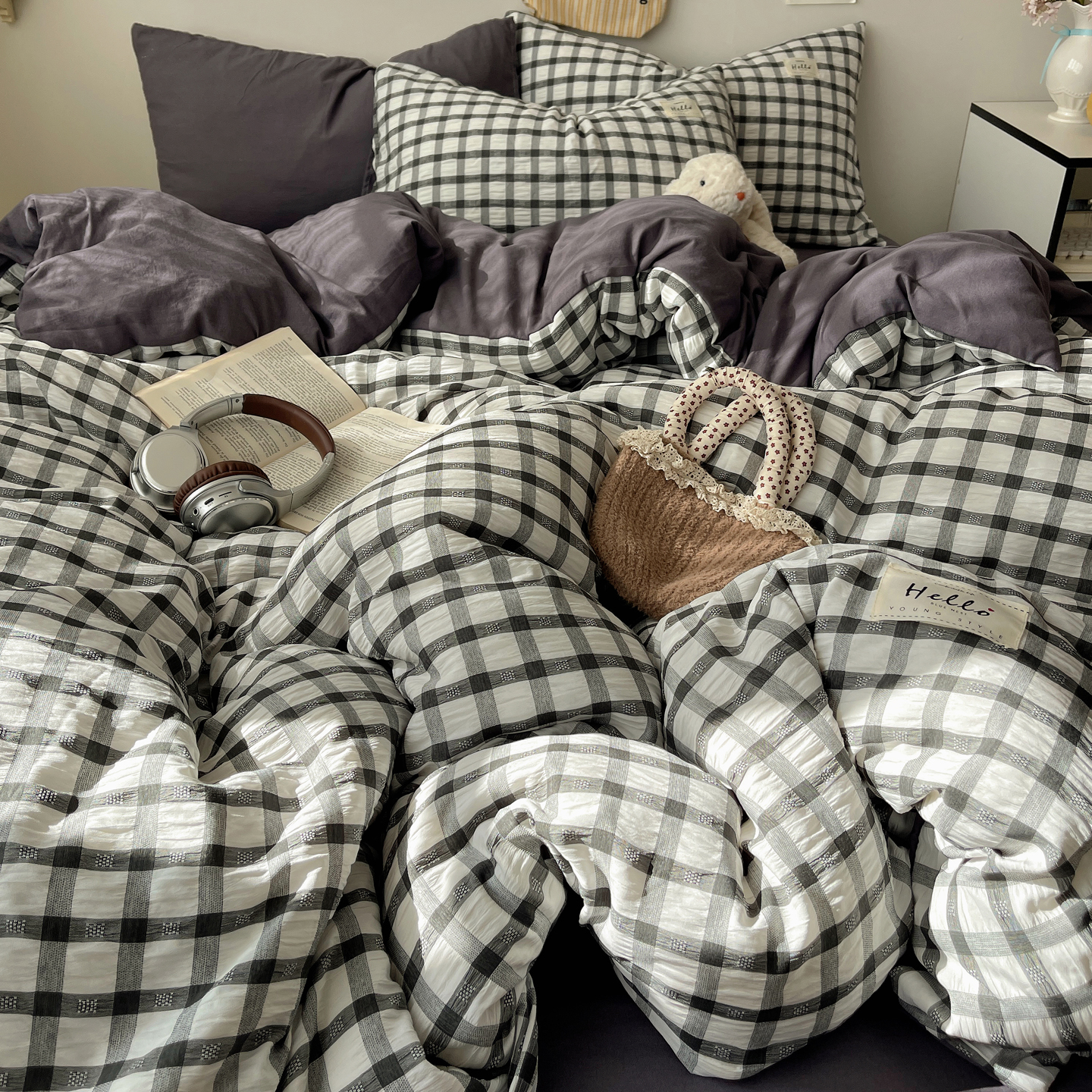 当前位置: 91家纺网 > 商品网购 > 床品套件 > 四件套 > 双层纱四件套 > 顾里2025新款韩系格子阳离子泡泡纱四件套-第二组 经典黑格