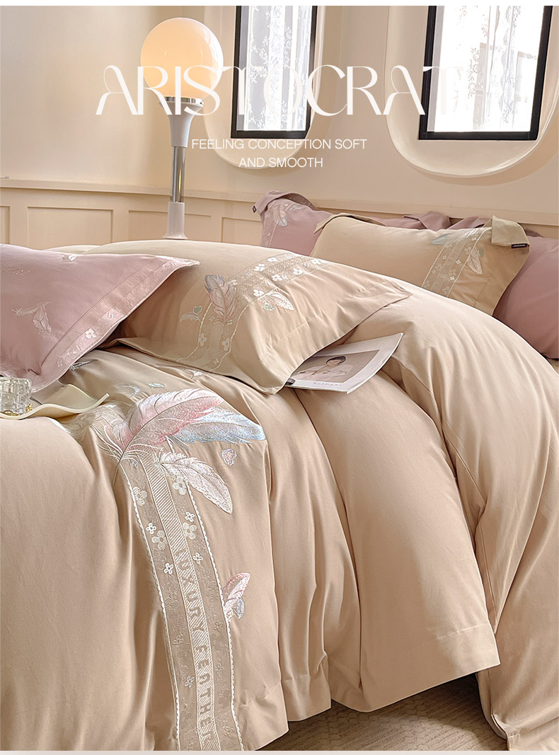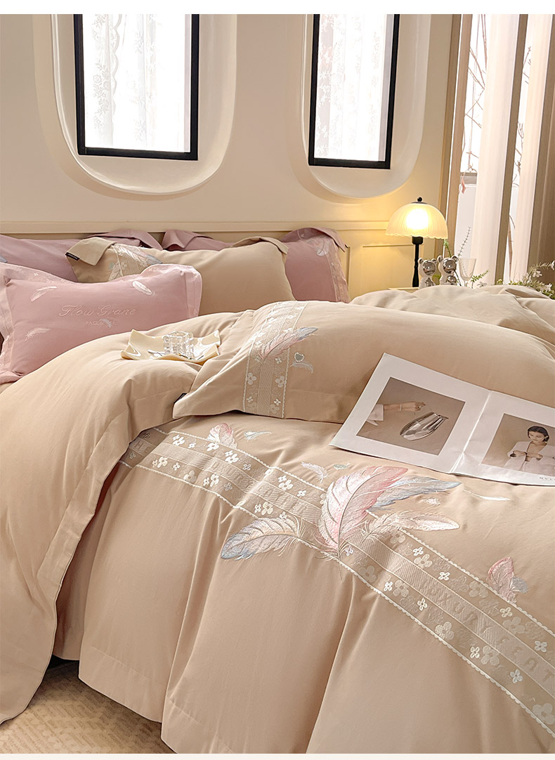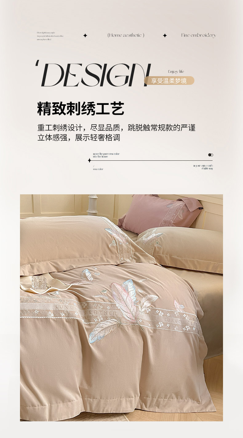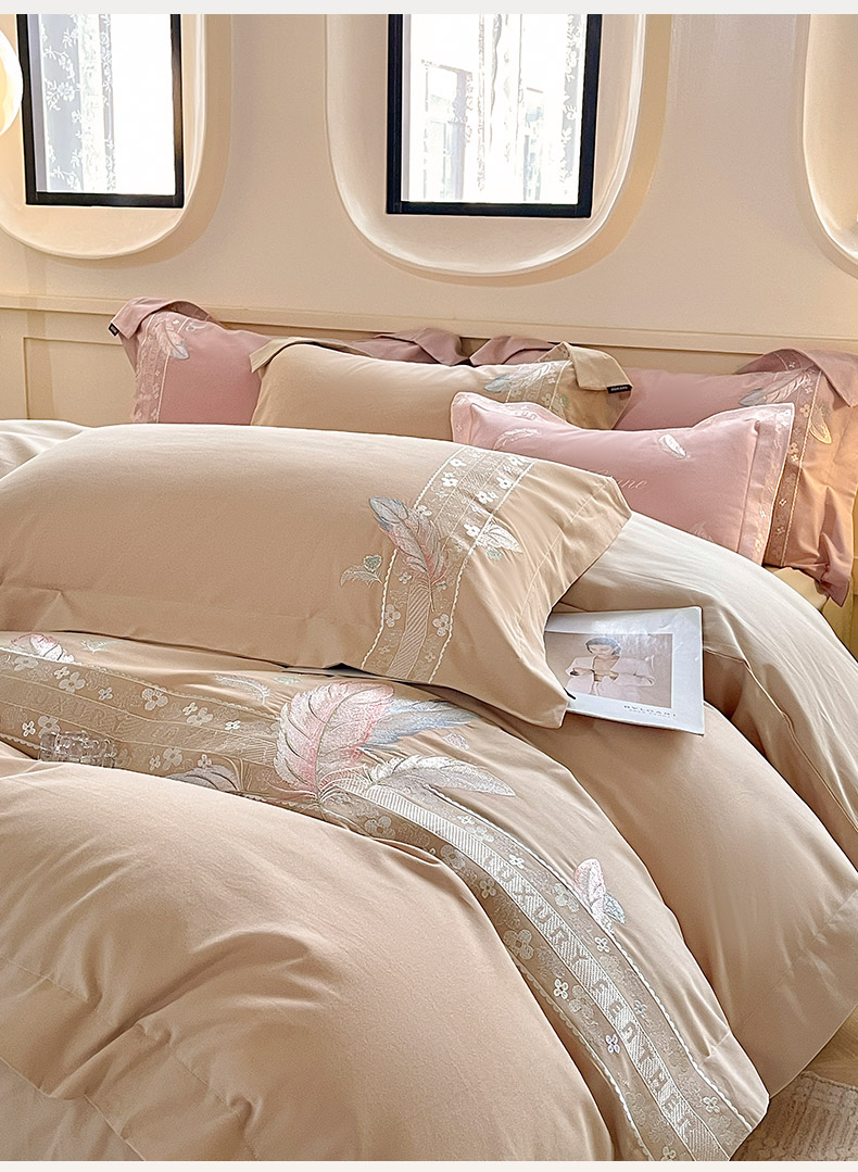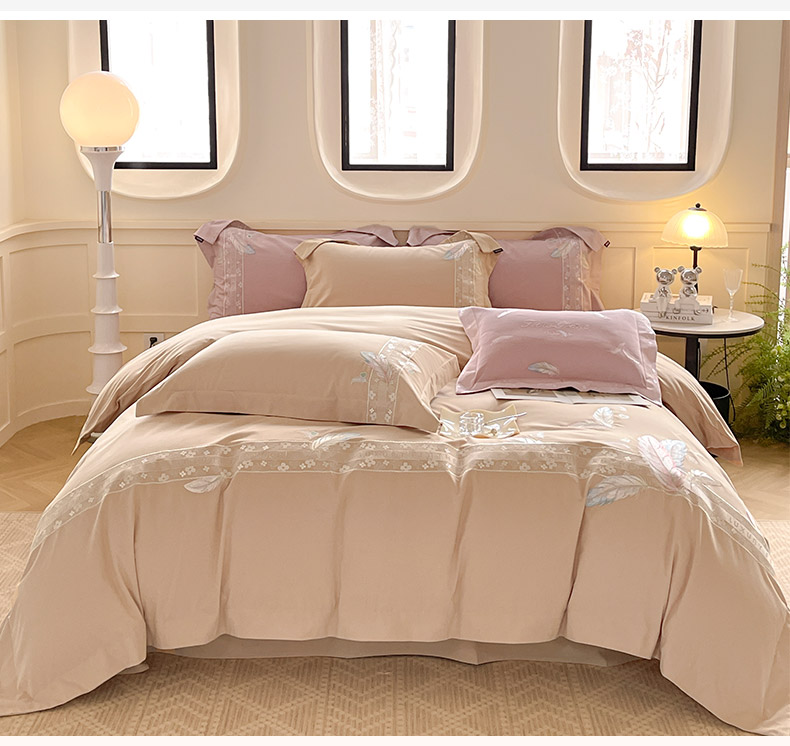 商品名称:2025秋冬新品A类加厚保暖全棉磨毛四件套纯棉被套重工刺绣轻奢床笠款直播热款床上用品 缦禾-拿铁