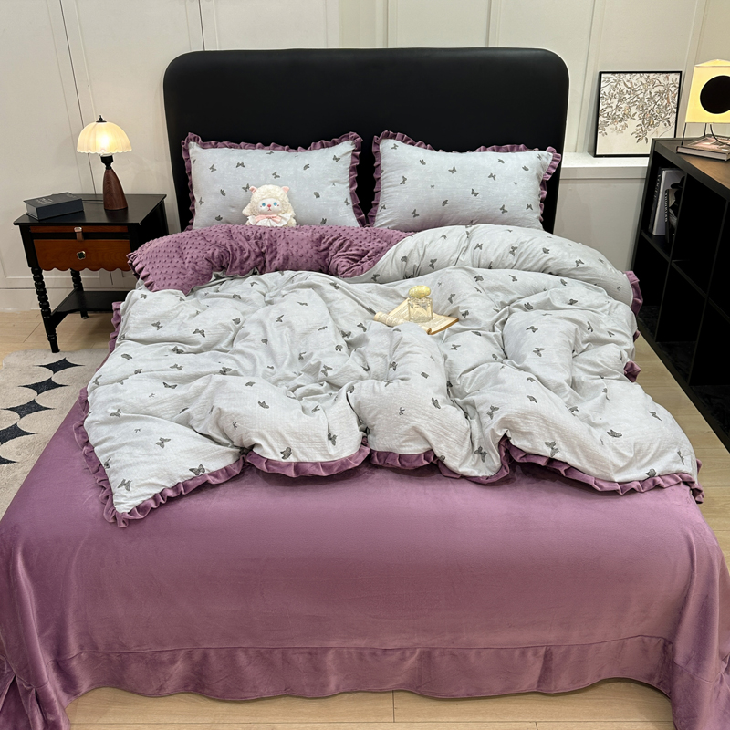 仟网汇 2025新款保暖舒适棉加绒四件套 蝶影 - 灰